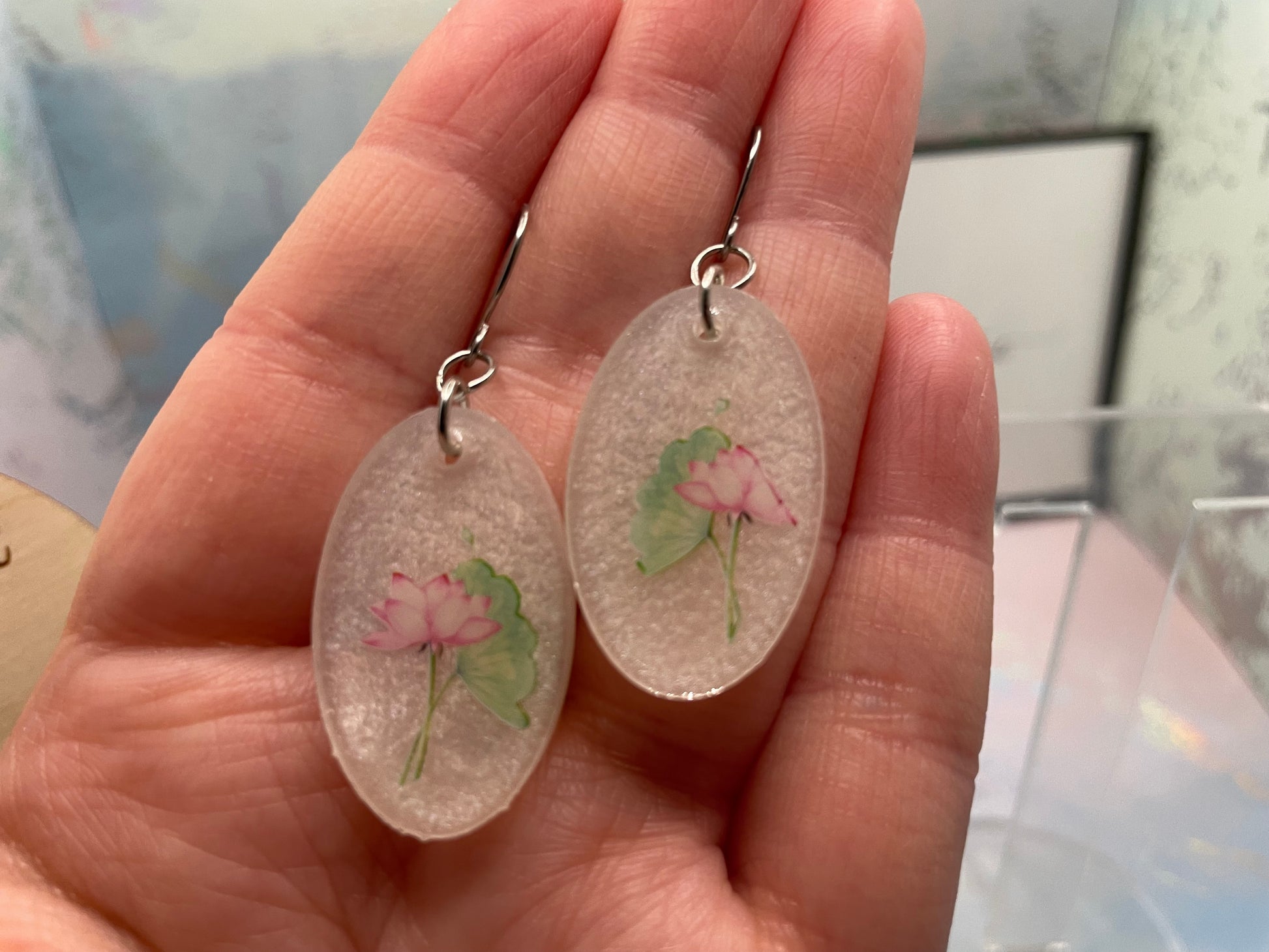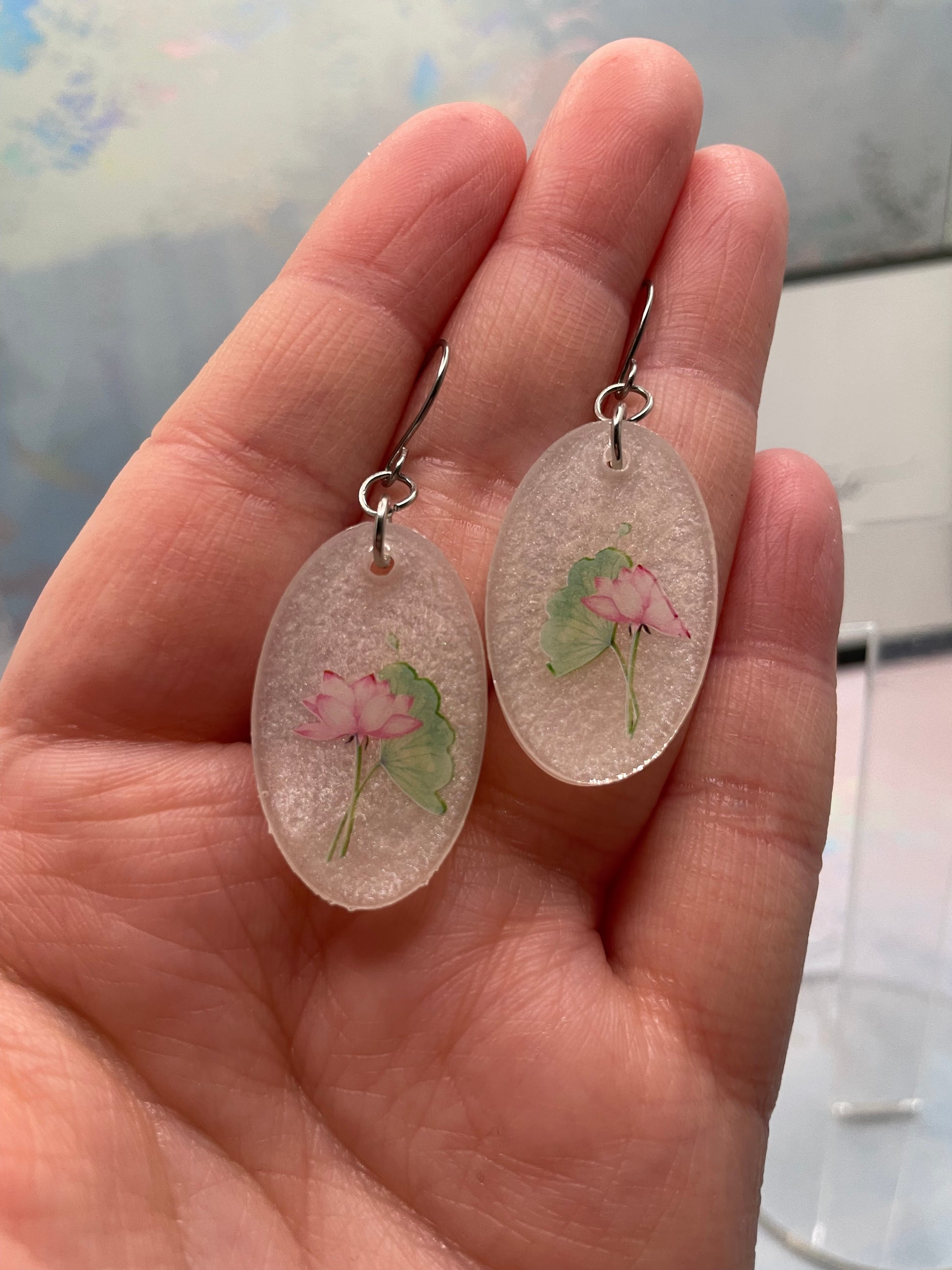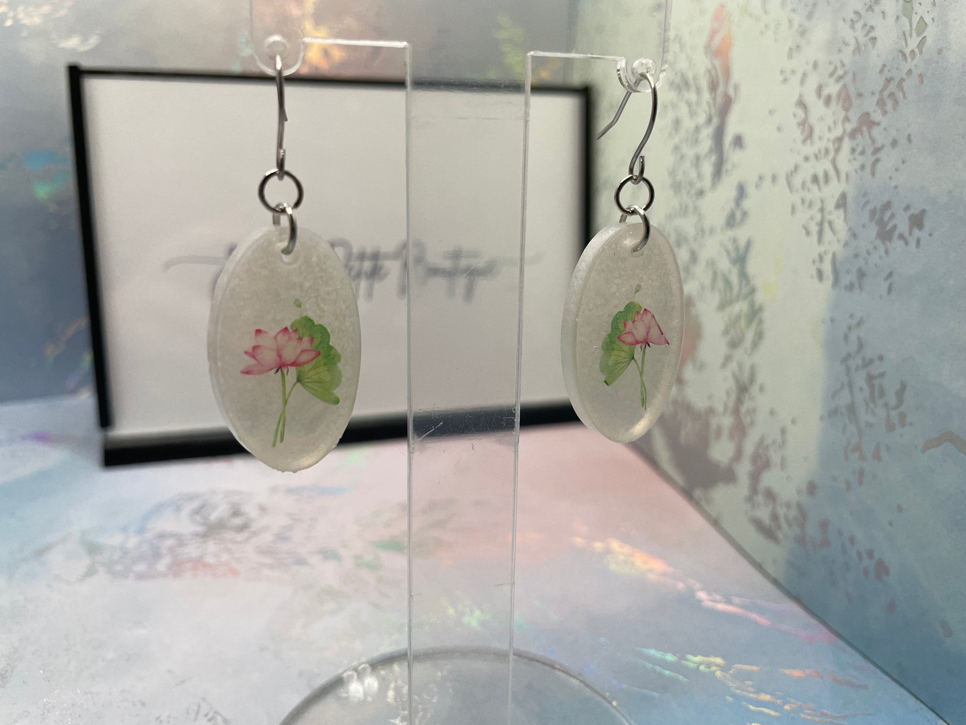 Pink Flower on White Oval Earrings – STAINLESS STEEL