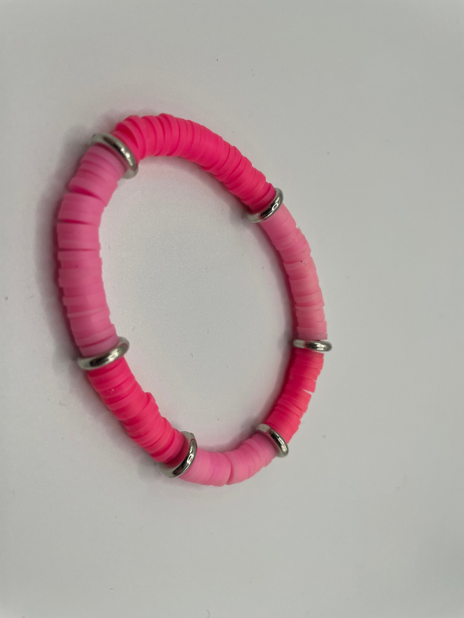 Brighten your day with this vibrant pink ombre bracelet! Made with 0.6 cm polymer clay disc beads in soft and hot pink tones, it’s accented with sleek silver rings for a modern finish. Lightweight, flexible, and fun to wear, this bracelet adds a pop of colour to any outfit — perfect for summer or layering with other styles.