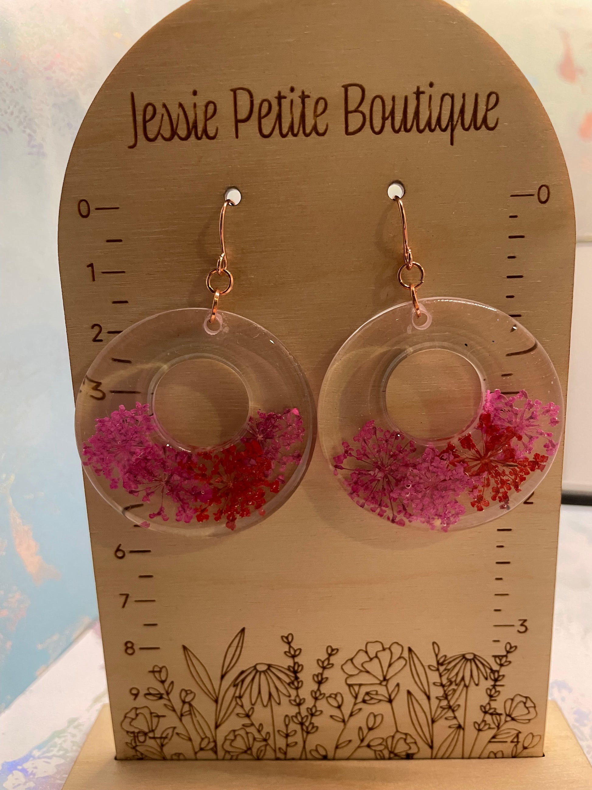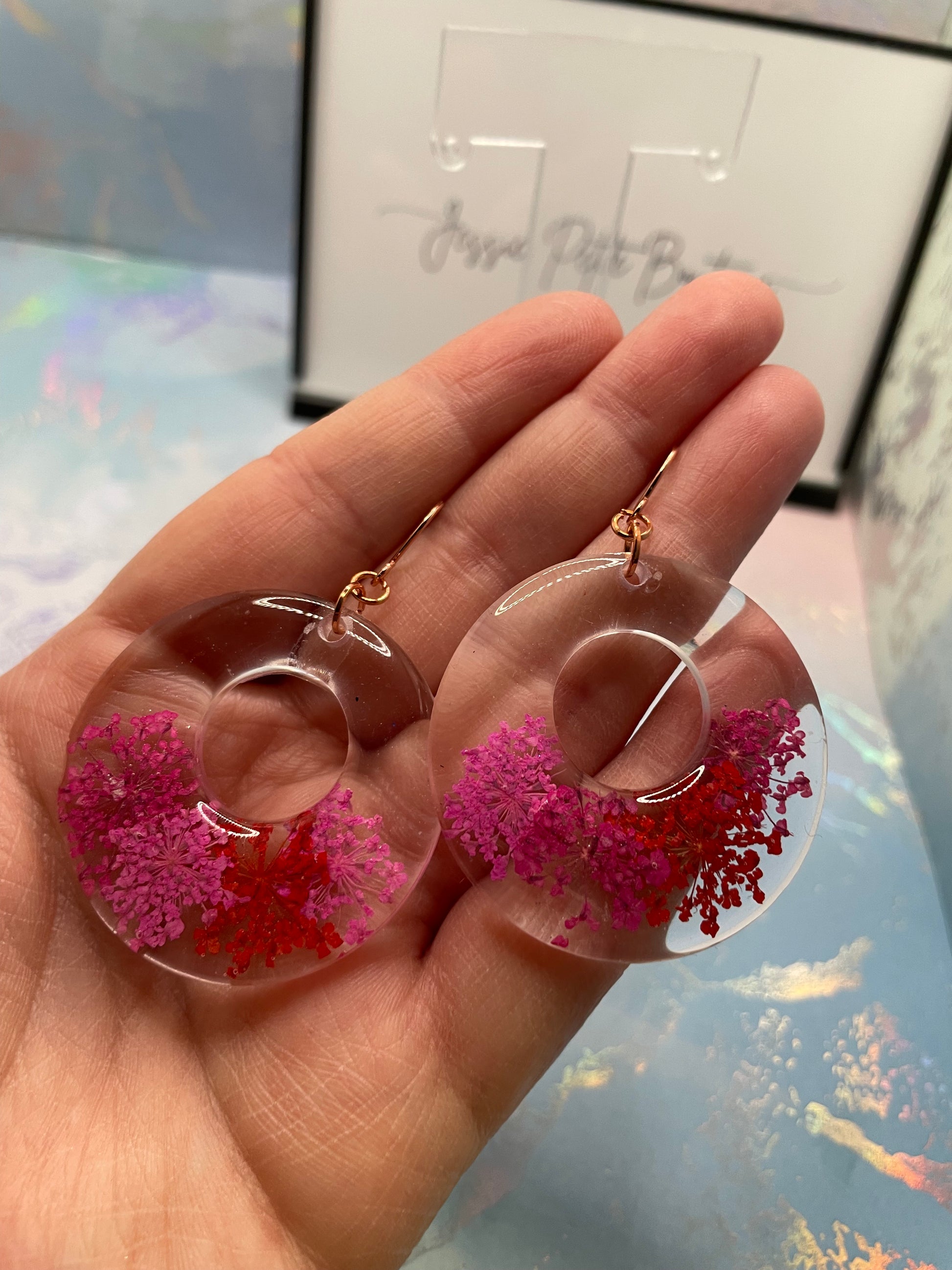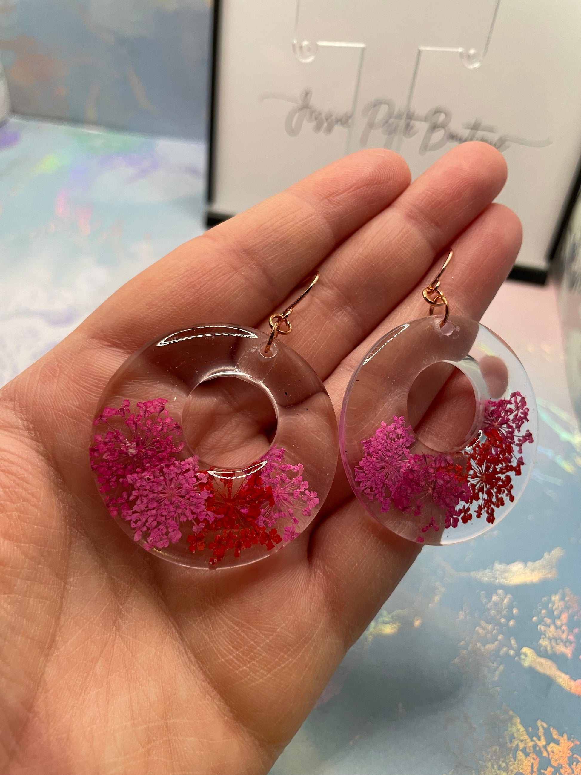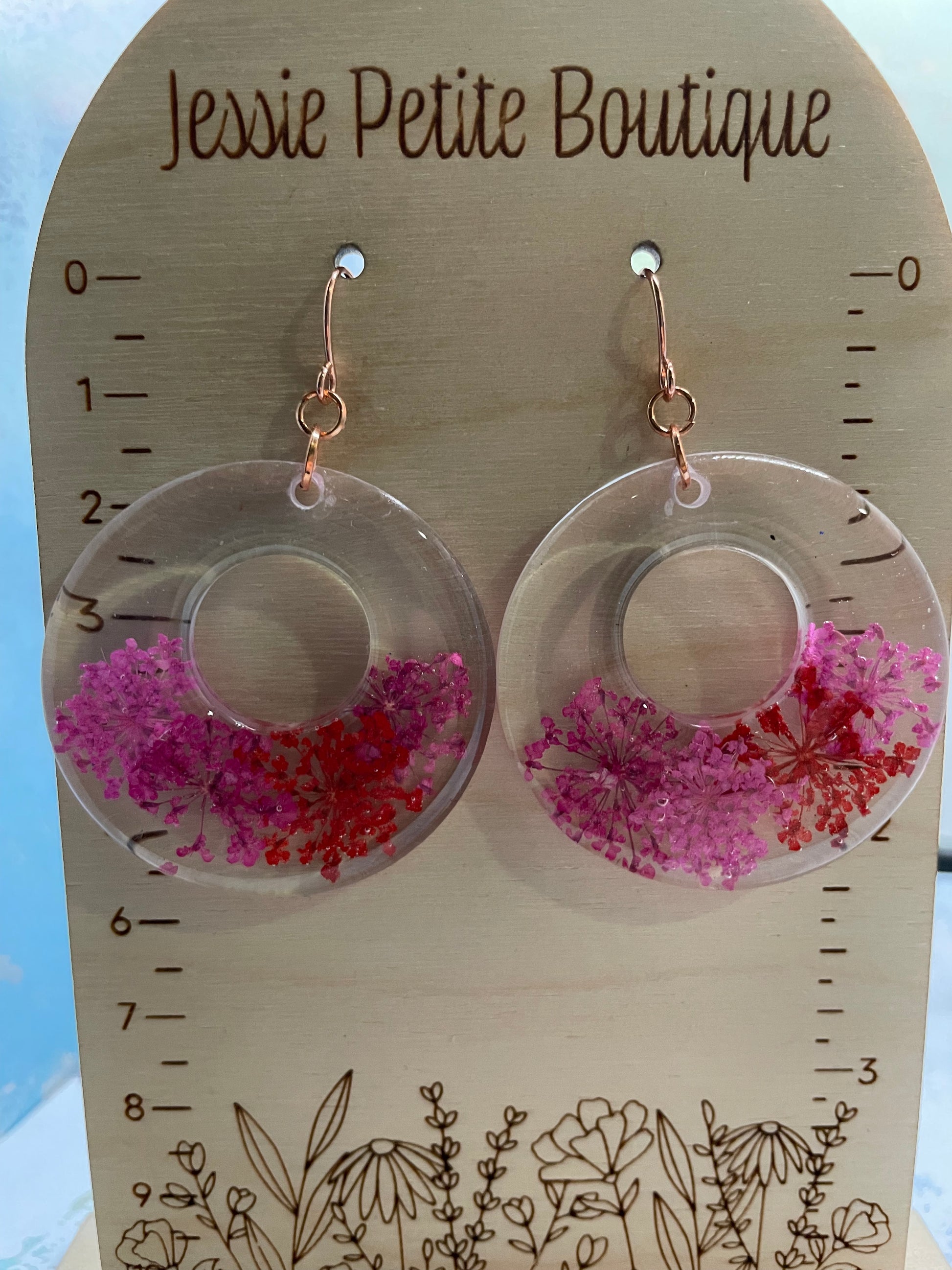 Add a touch of floral elegance to your style with our "Pink & Red Flower" round earrings. Featuring vibrant pink and red dried flowers encased in clear resin, these earrings offer a delicate and natural look. The round design, paired with a nickel-free ear wire, makes them a comfortable yet striking accessory.