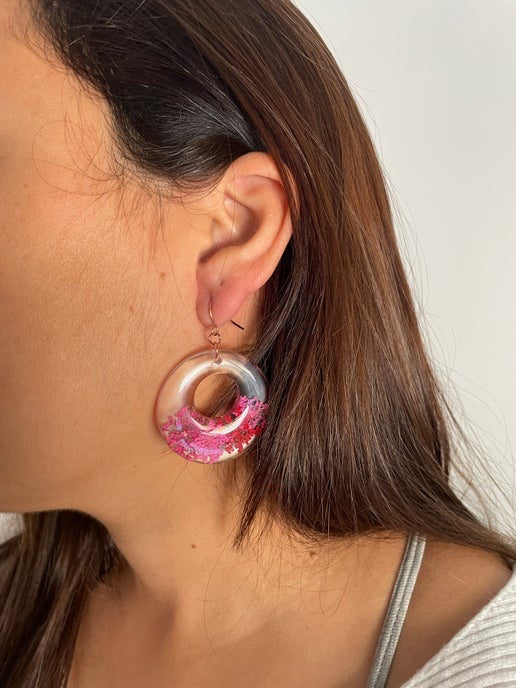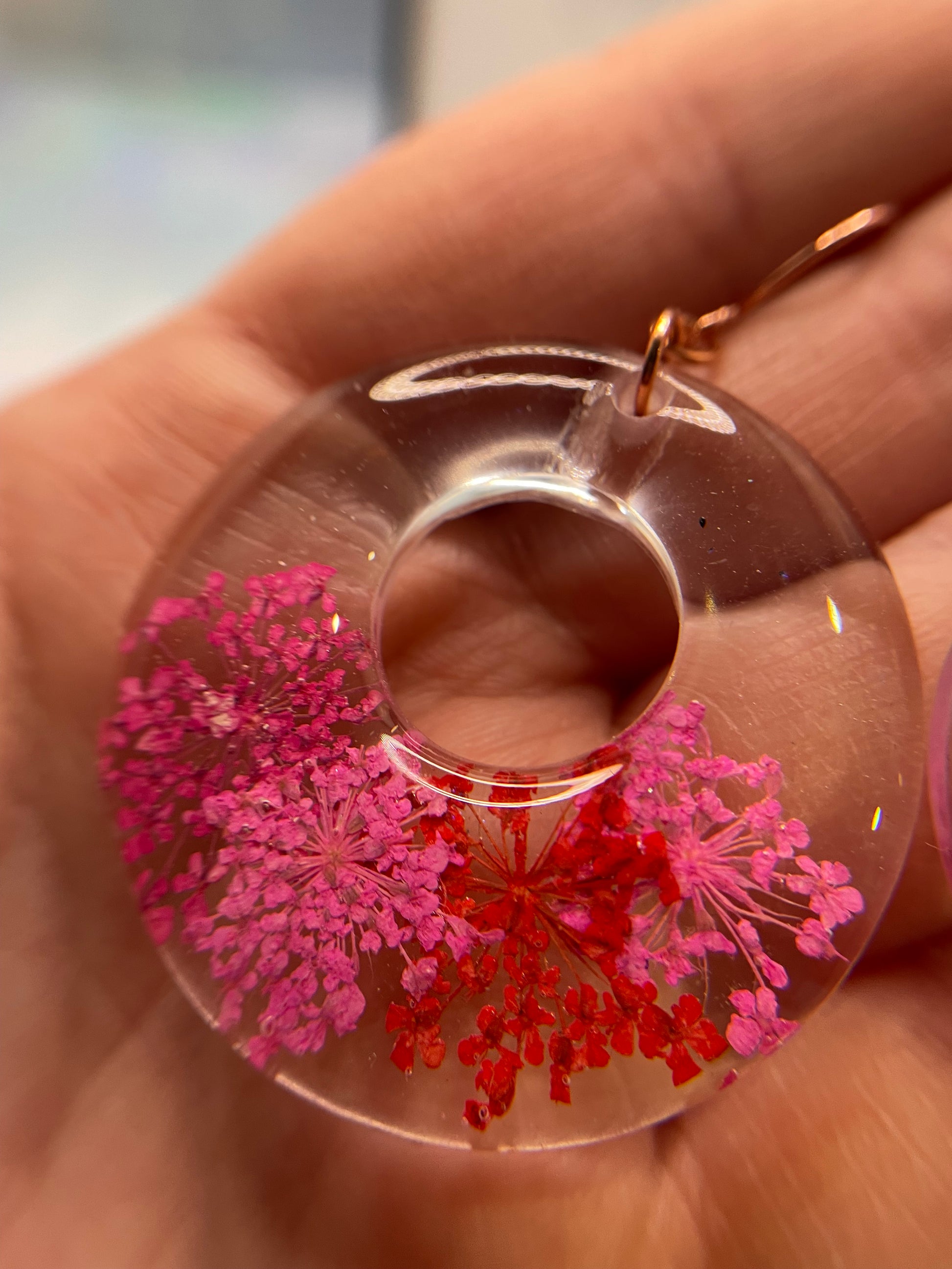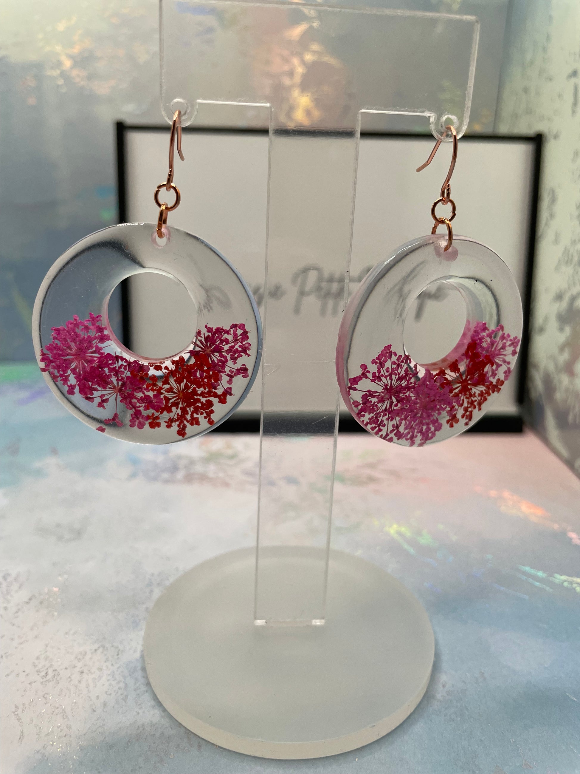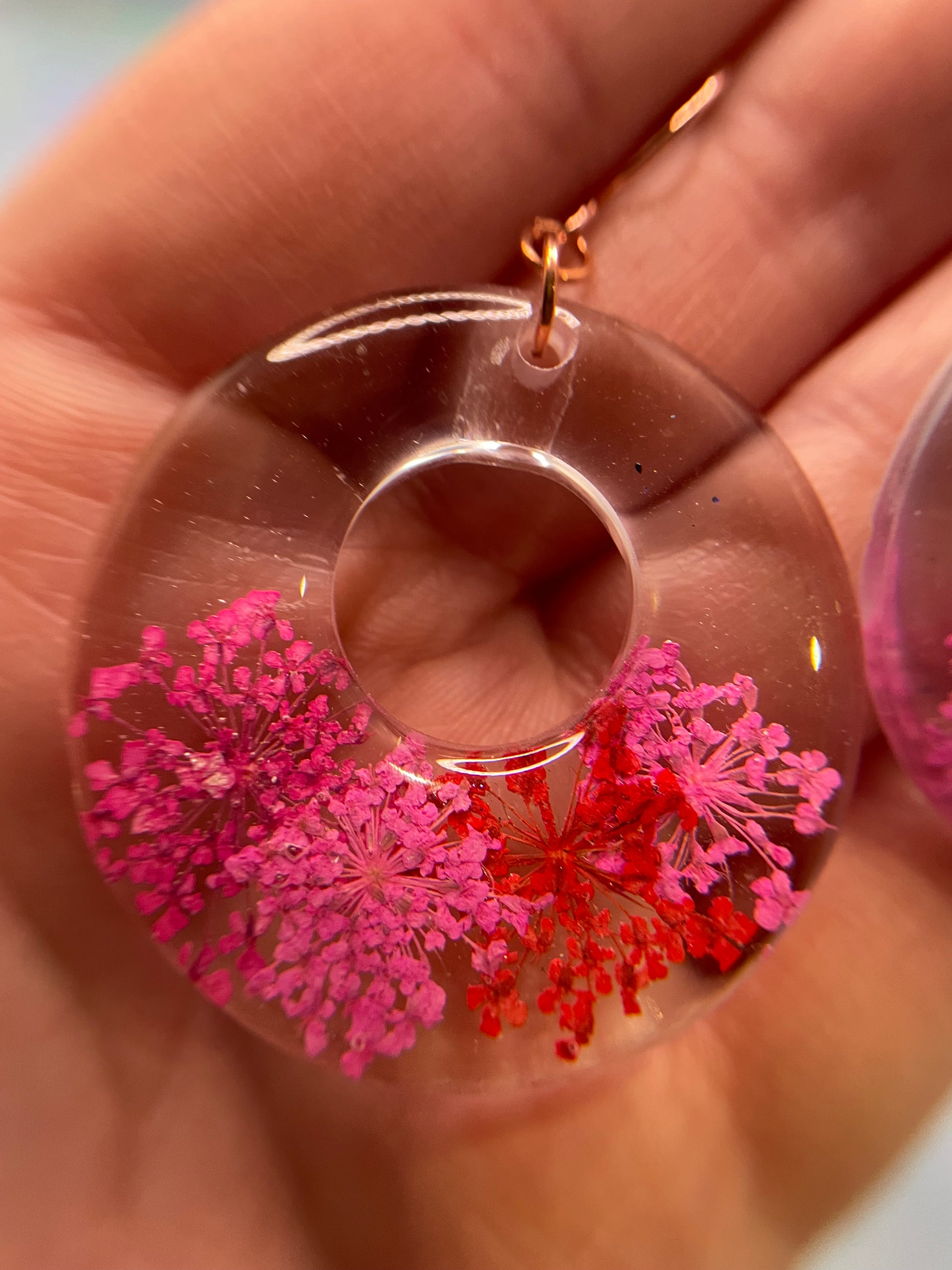 Add a touch of floral elegance to your style with our "Pink & Red Flower" round earrings. Featuring vibrant pink and red dried flowers encased in clear resin, these earrings offer a delicate and natural look. The round design, paired with a nickel-free ear wire, makes them a comfortable yet striking accessory.