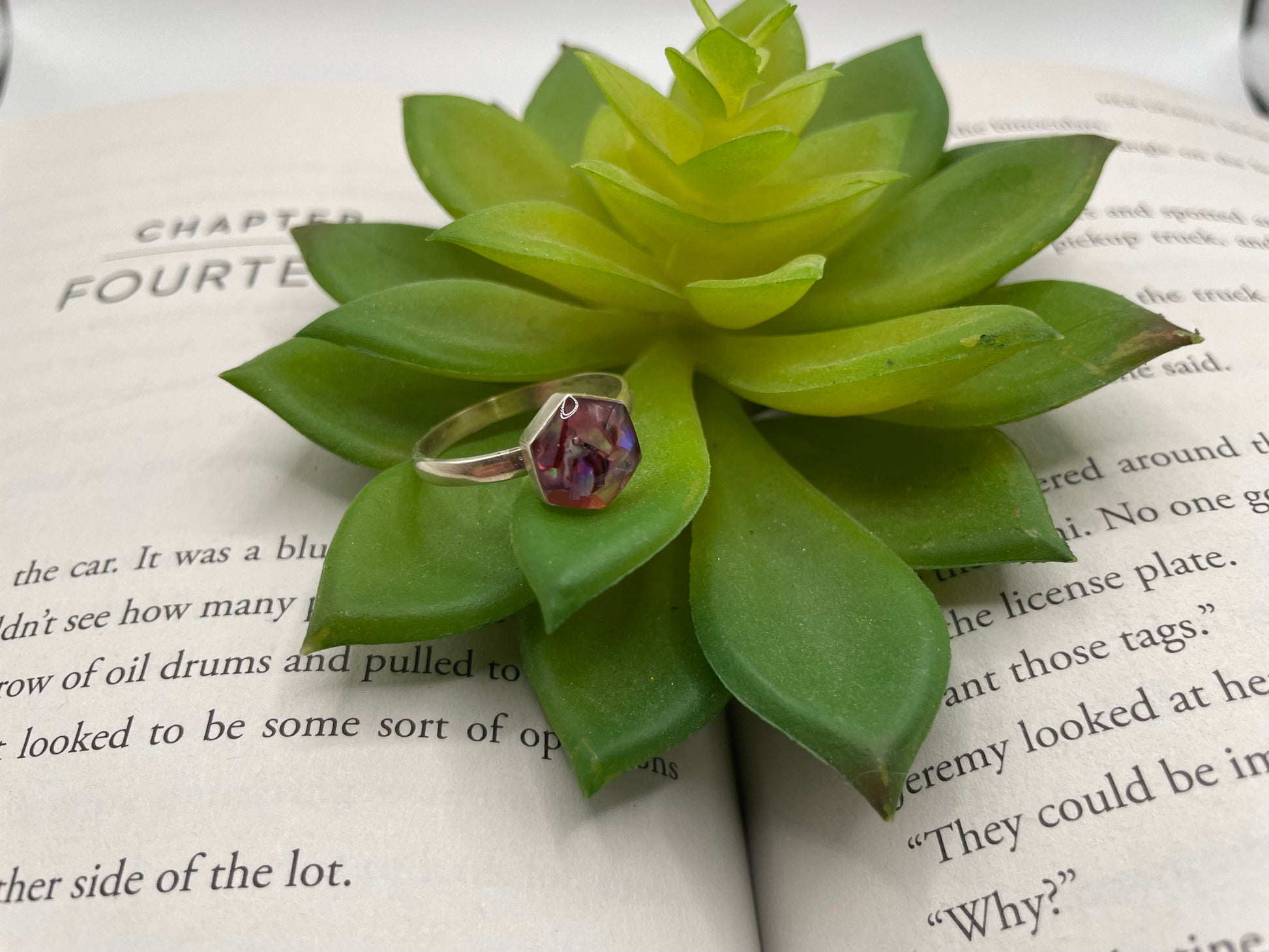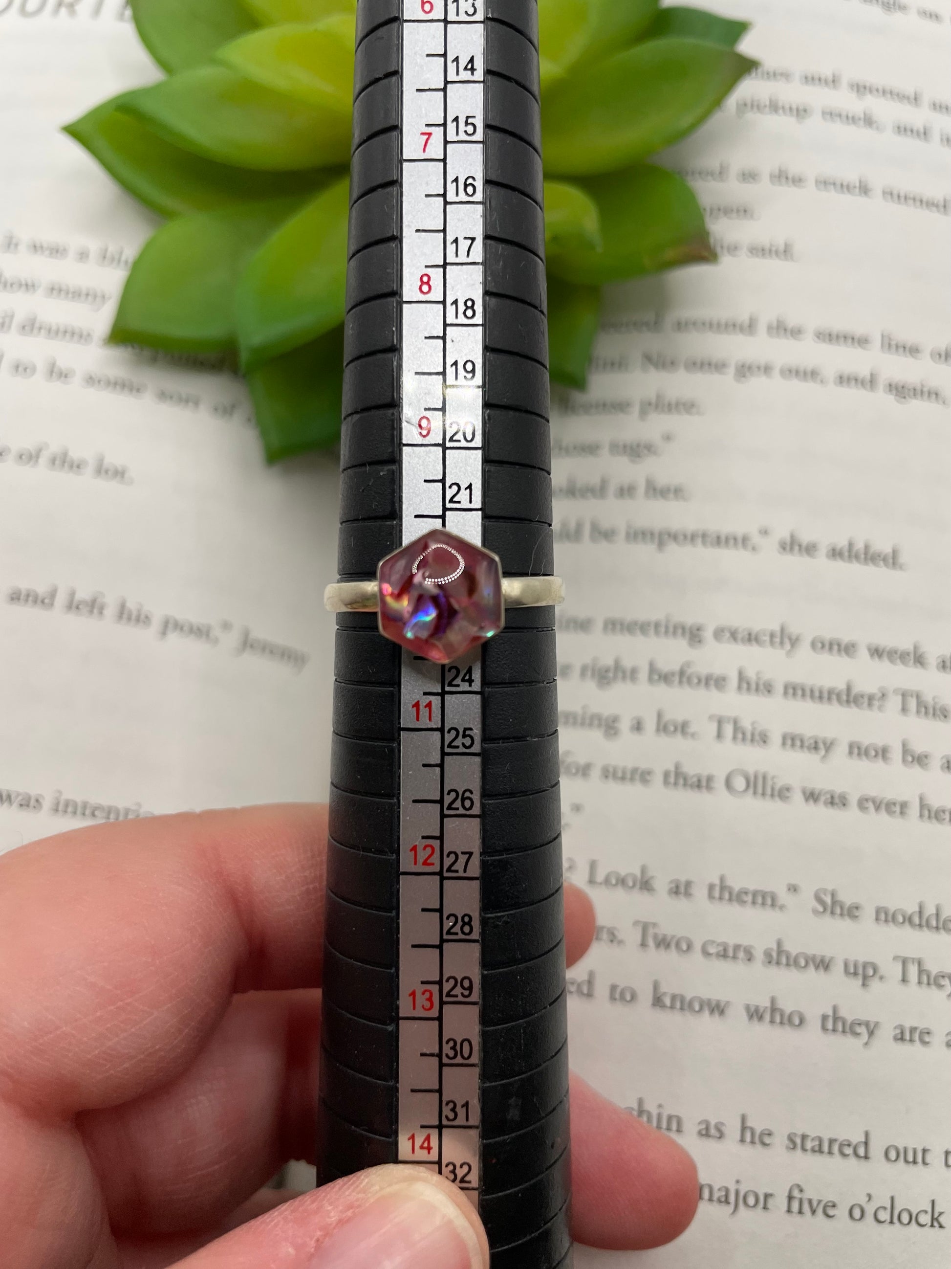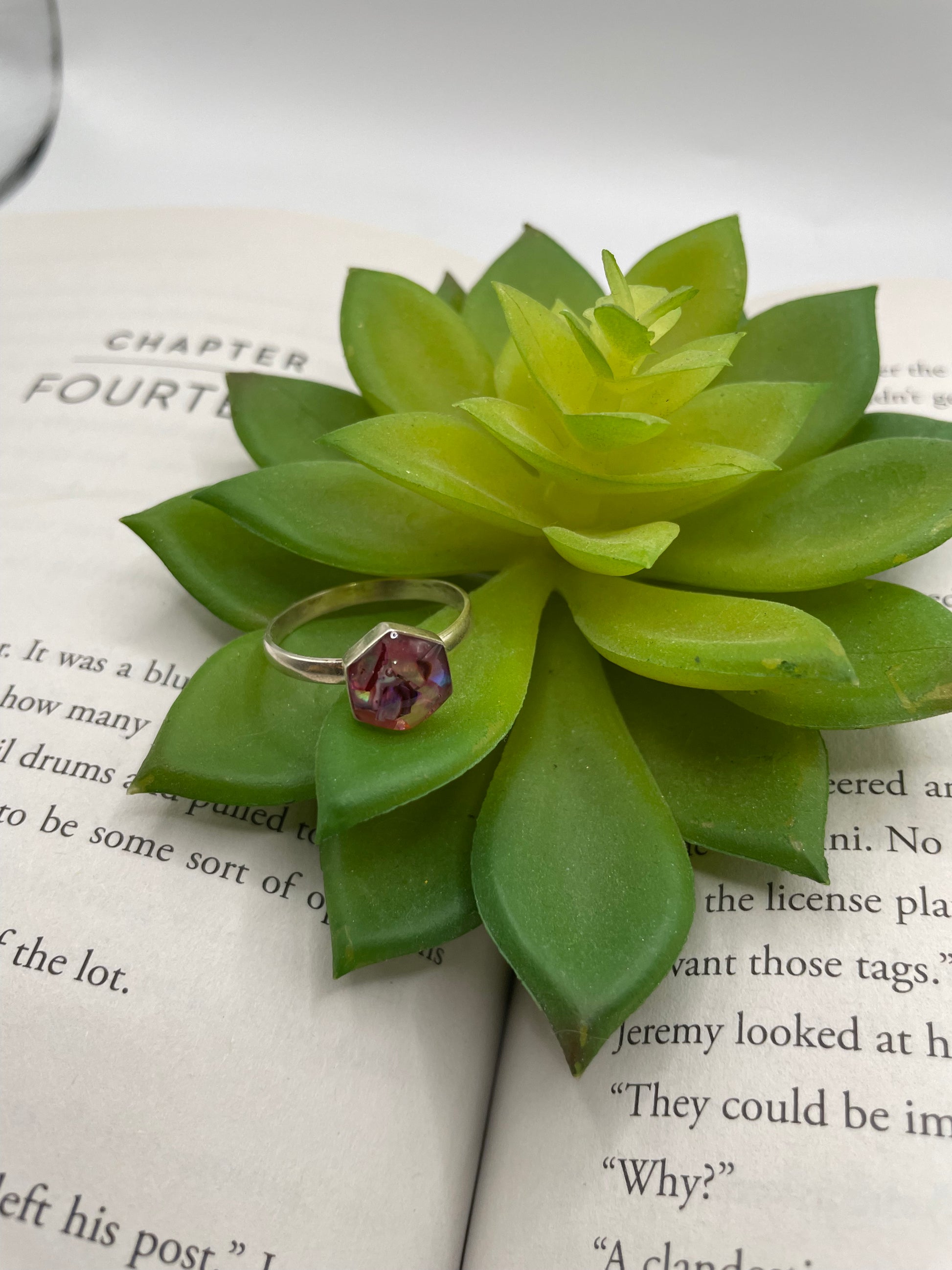 Modern and radiant, this 925 sterling silver ring features a 1 cm hexagon bezel filled with pink shell fragments encased in clear resin.