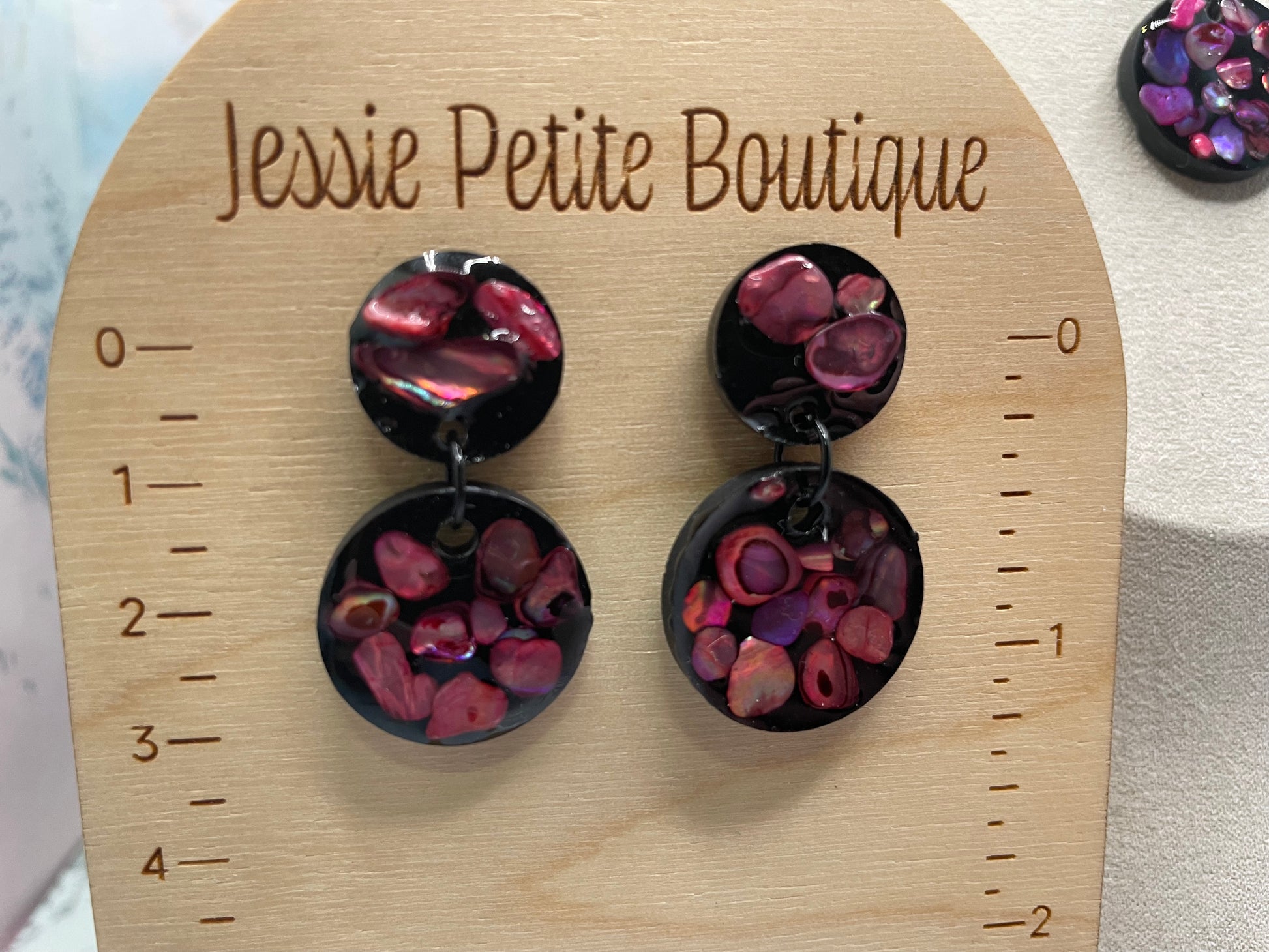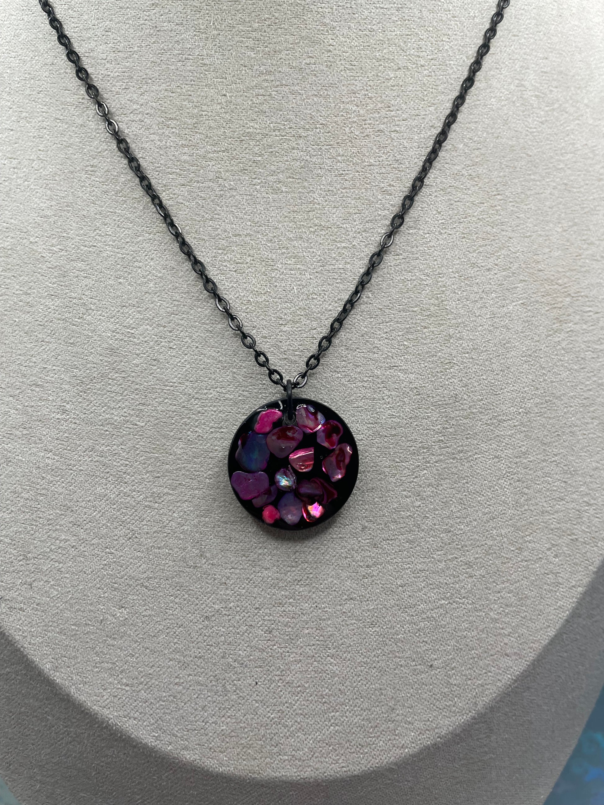 A bold and luminous duo featuring vibrant pink shell fragments set against a deep black background. This round necklace and matching earrings create a striking contrast, enhanced by subtle shimmer and glossy resin for a rich, dimensional finish. A statement set that remains elegant and easy to wear.