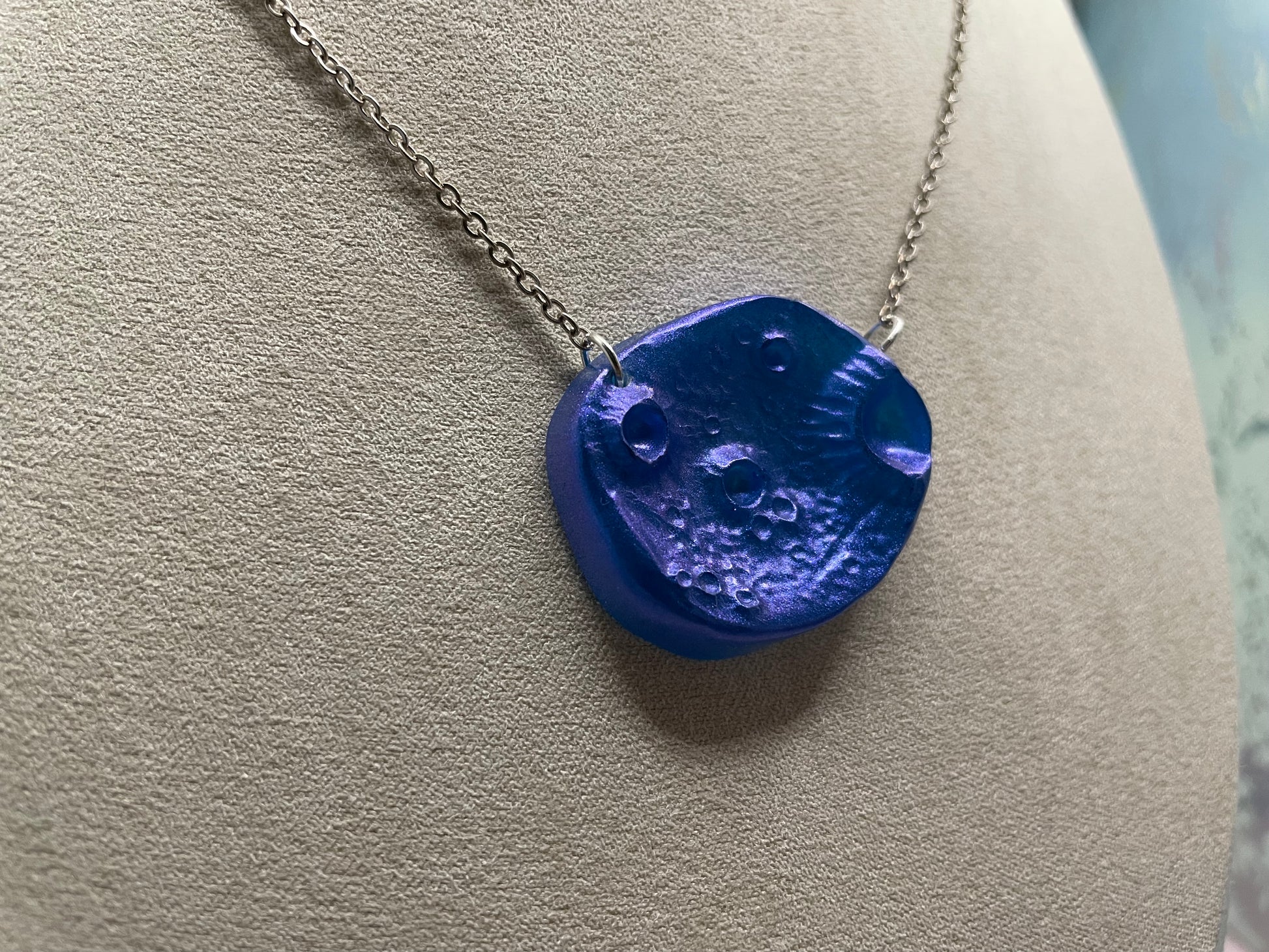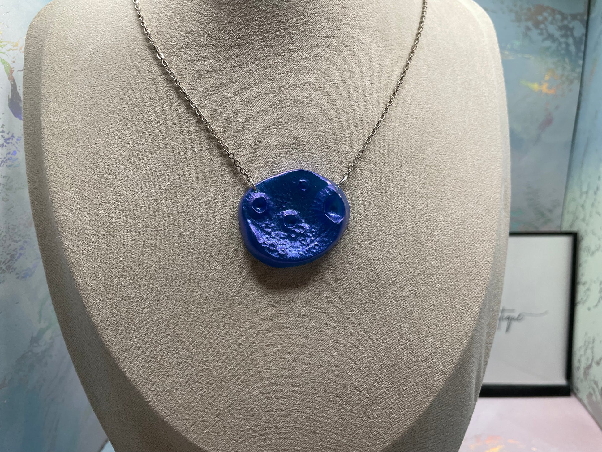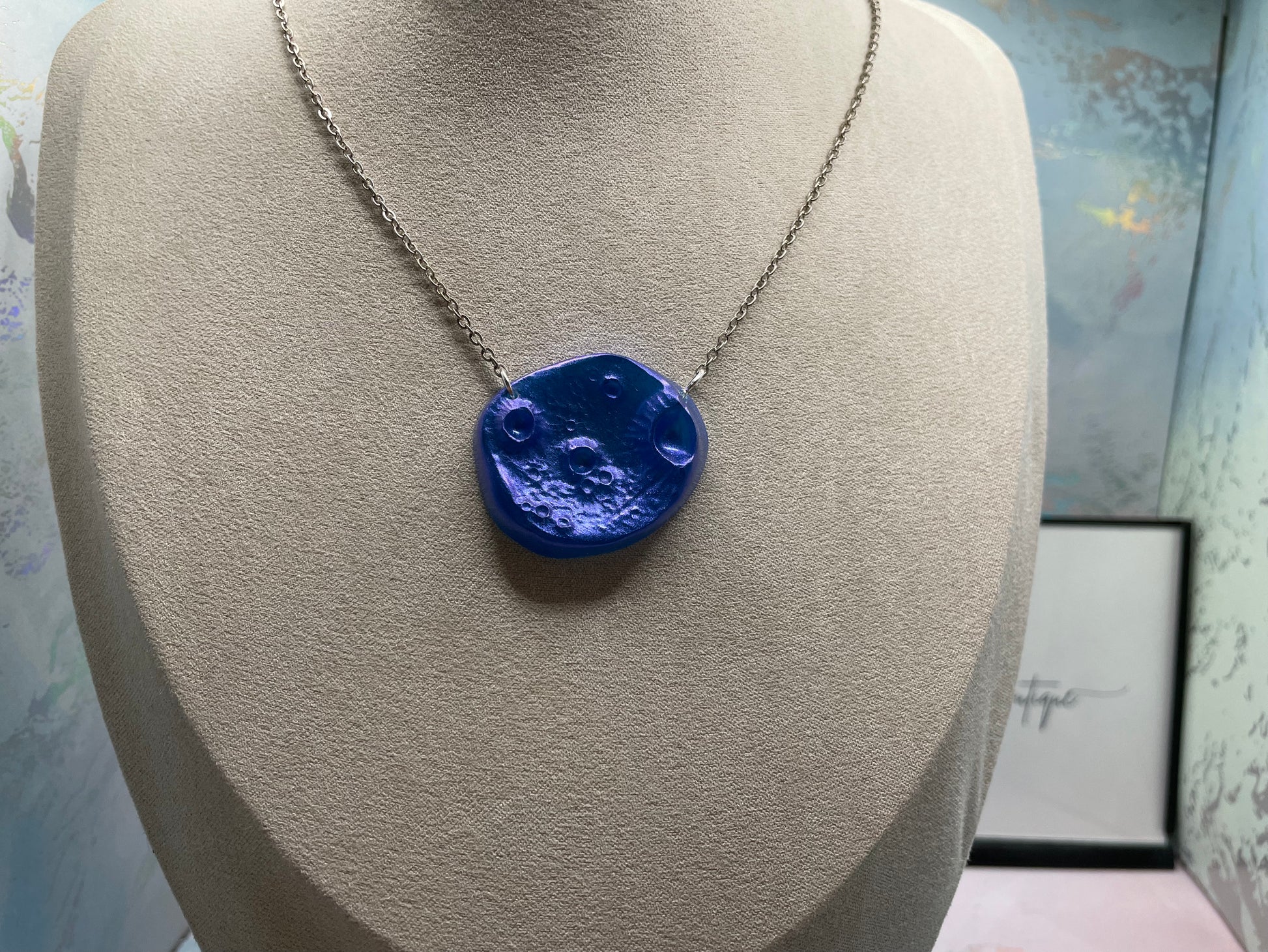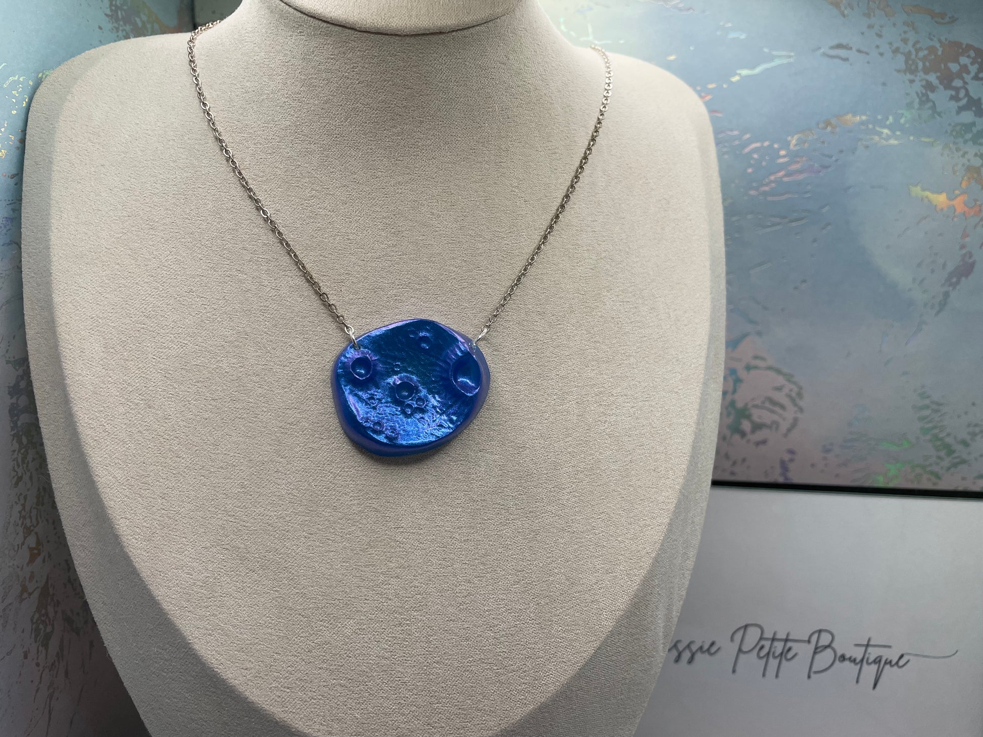 Bring the beauty of the cosmos to your style with this mesmerizing planet-inspired pendant necklace. Crafted from resin and mica powder, the pendant has a textured design resembling the surface of a distant celestial body, enhanced by a vibrant, shimmering blue finish. The pendant hangs on a 23-inch silver chain with an extension for an adjustable fit end a secure lobster claw closure, making it a perfect accessory for anyone who loves unique and space-inspired jewelry.
