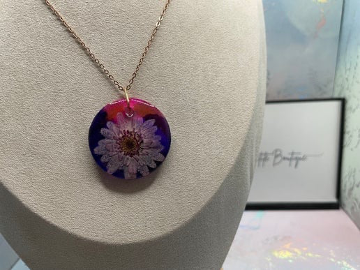 - Colour: Purple flower on pink and purple translucent resin