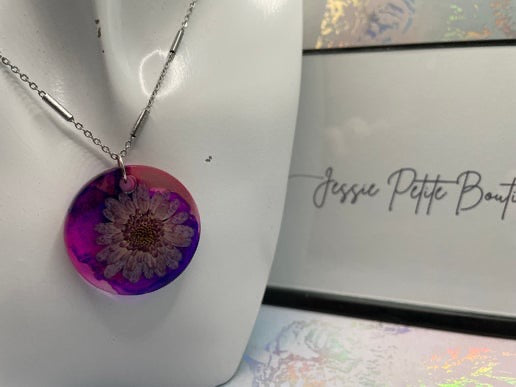 Add a touch of floral elegance to your collection with this stunning one of a kind purple flower pendant necklace. Crafted from resin and alcohol ink, this round pendant features a beautiful purple flower set against a backdrop of pink and purple translucent resin, creating a dreamy aesthetic. Suspended on a 23-inch nickel-free and stainless steel chain with tube beads, this piece is both stylish and comfortable to wear.