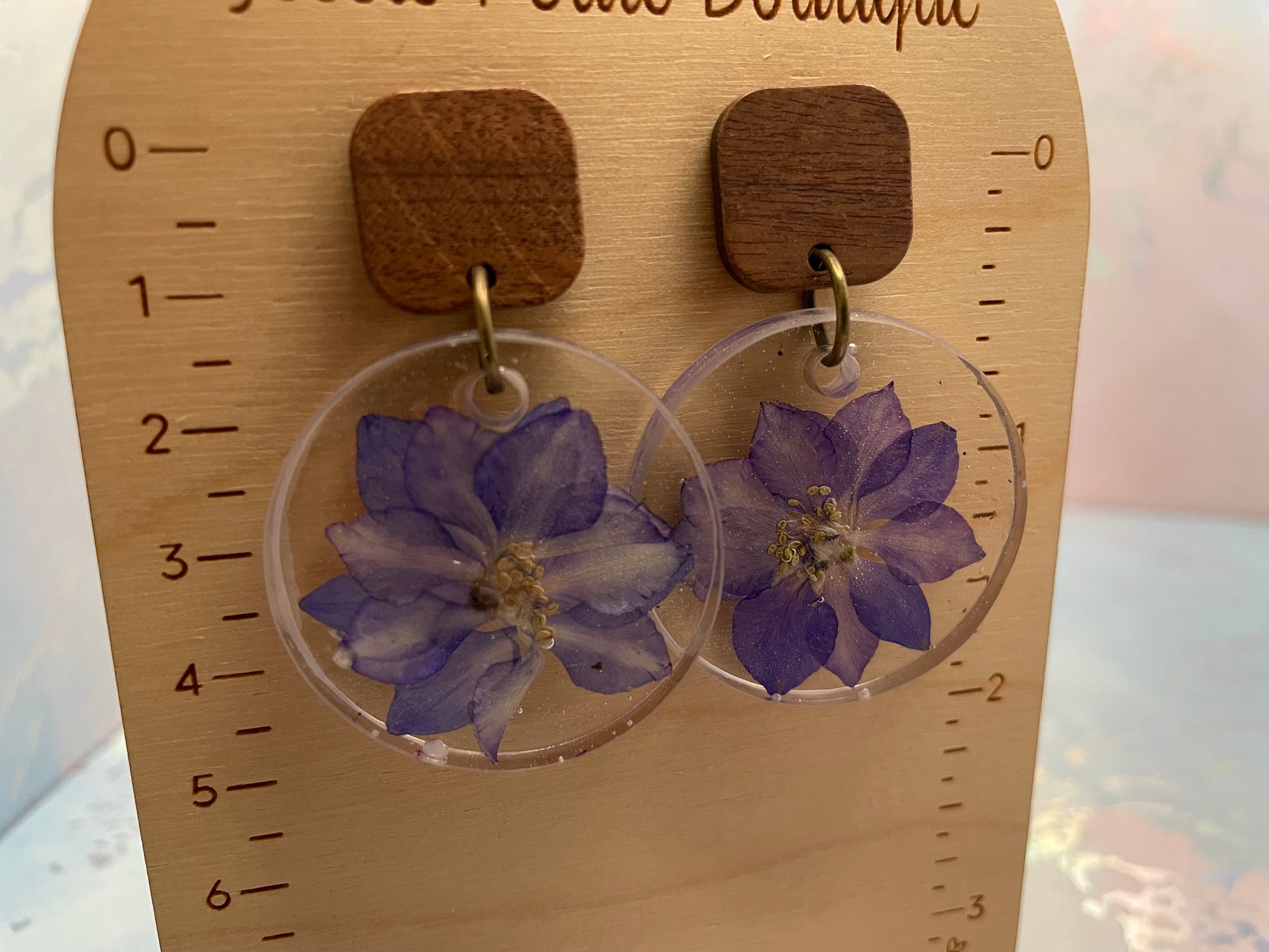 These handcrafted earrings feature a real purple flower carefully preserved in clear resin, creating a light and elegant design that highlights the natural beauty of the bloom. Paired with a warm wood square stud, they offer a beautiful balance between organic textures and modern simplicity. Each pair is unique, with natural variations that make every piece truly one of a kind.