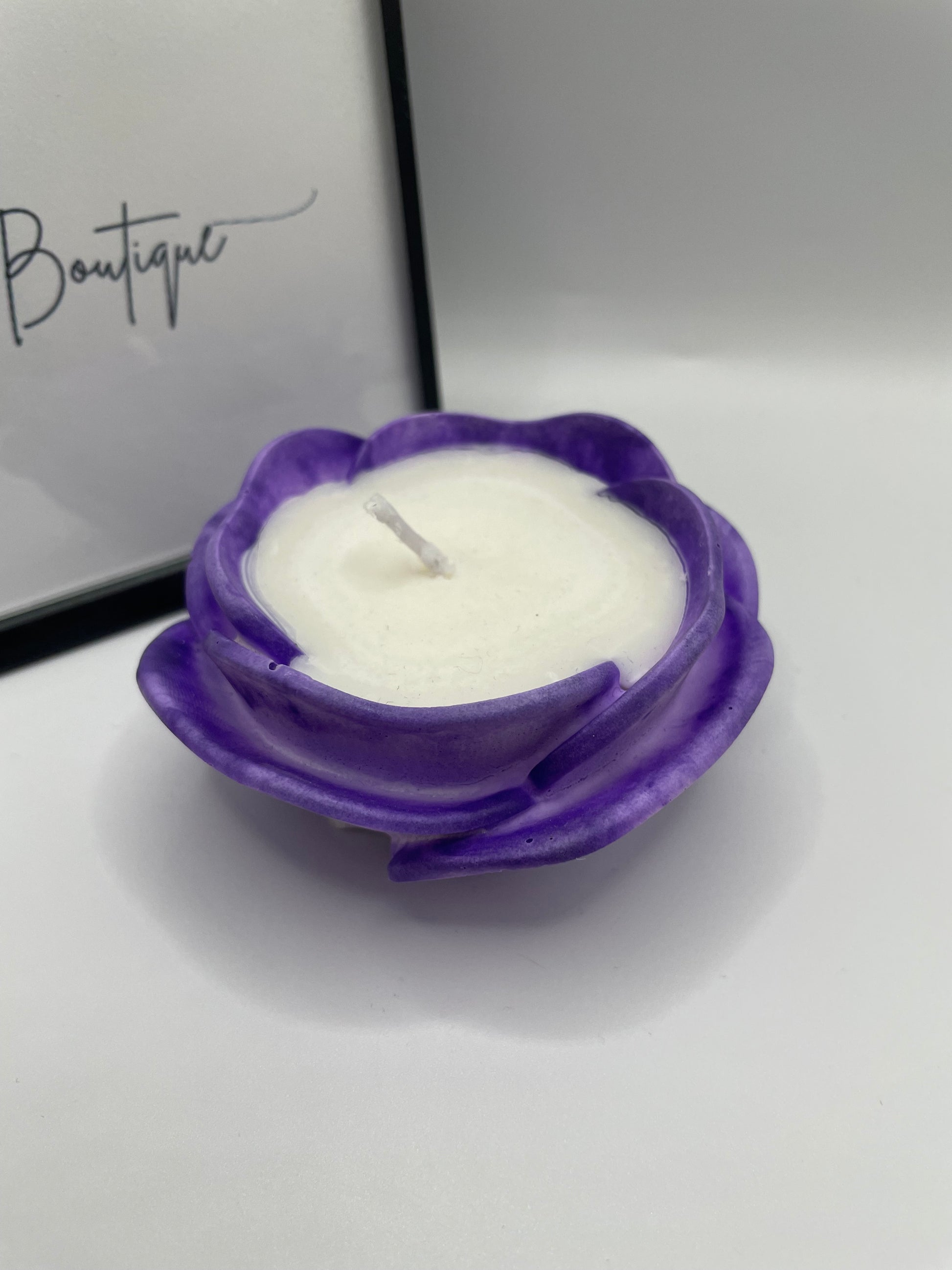 Bring a touch of charm to any space with this beautifully handcrafted purple flower candle. The container is shaped like a blooming flower and made from eco-resin, giving it a unique handmade character and a smooth matte finish. Filled with a clean lemon–scented soy candle, it’s a lovely decorative piece that also adds a refreshing citrus aroma to your home.