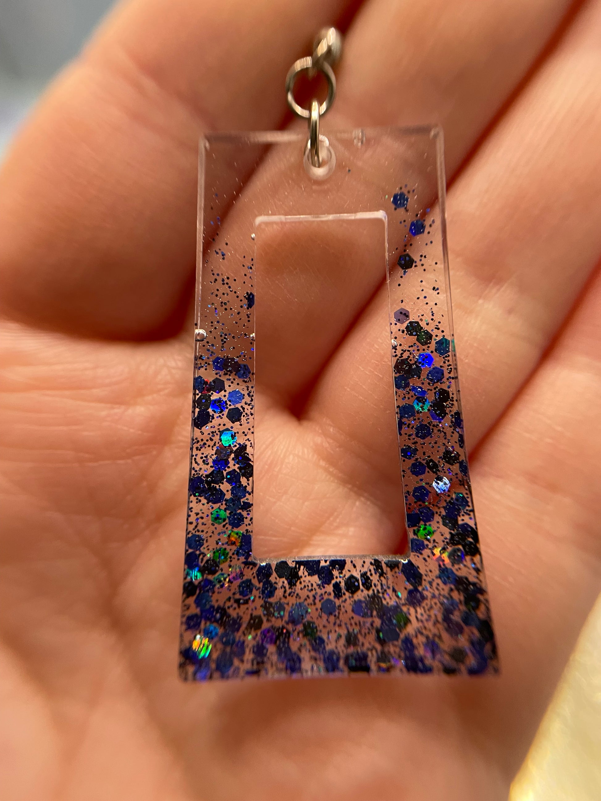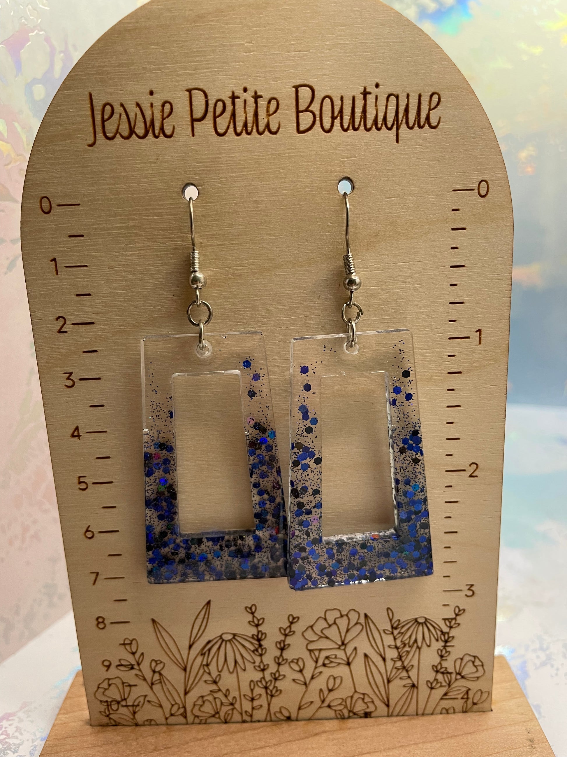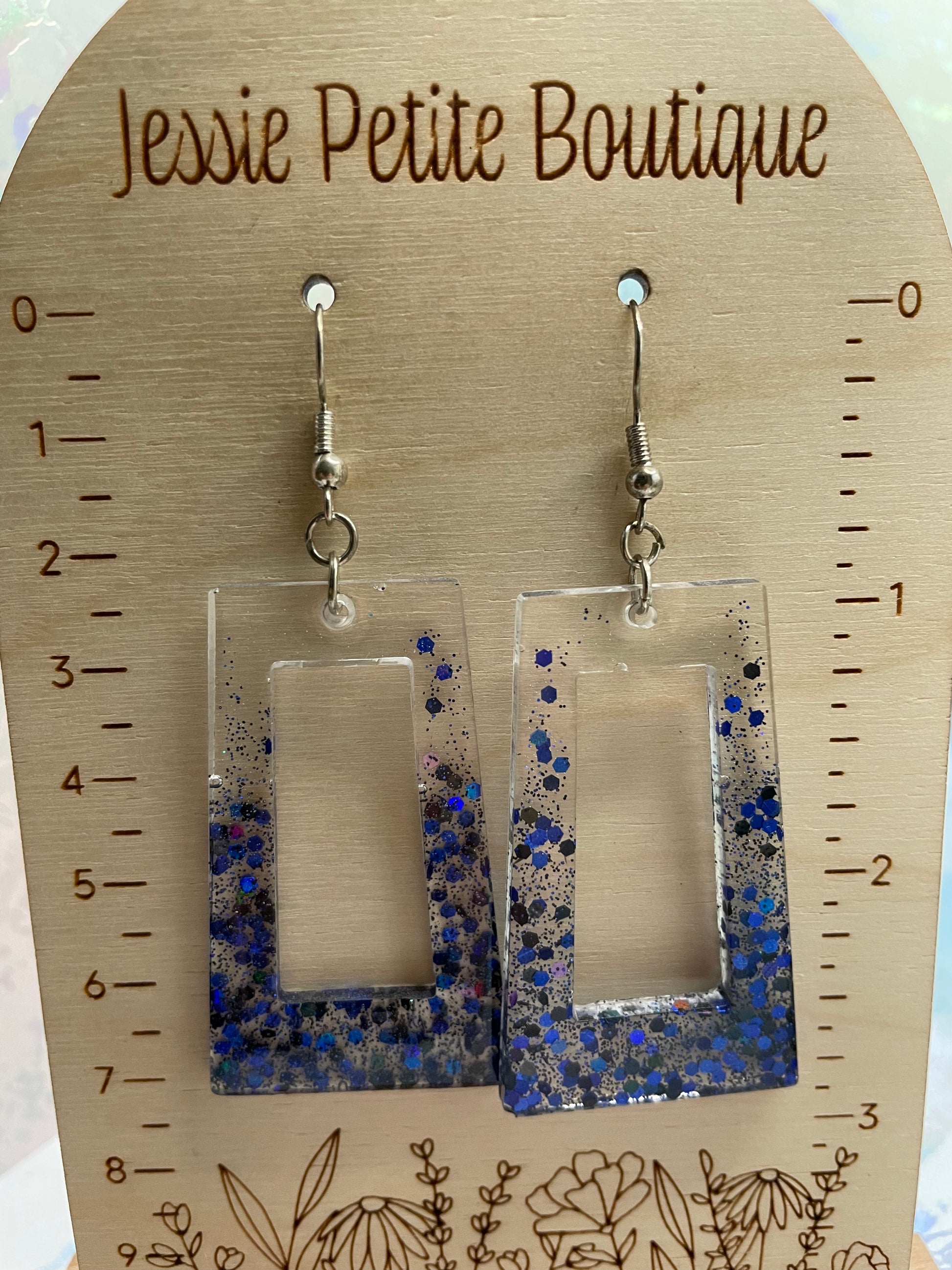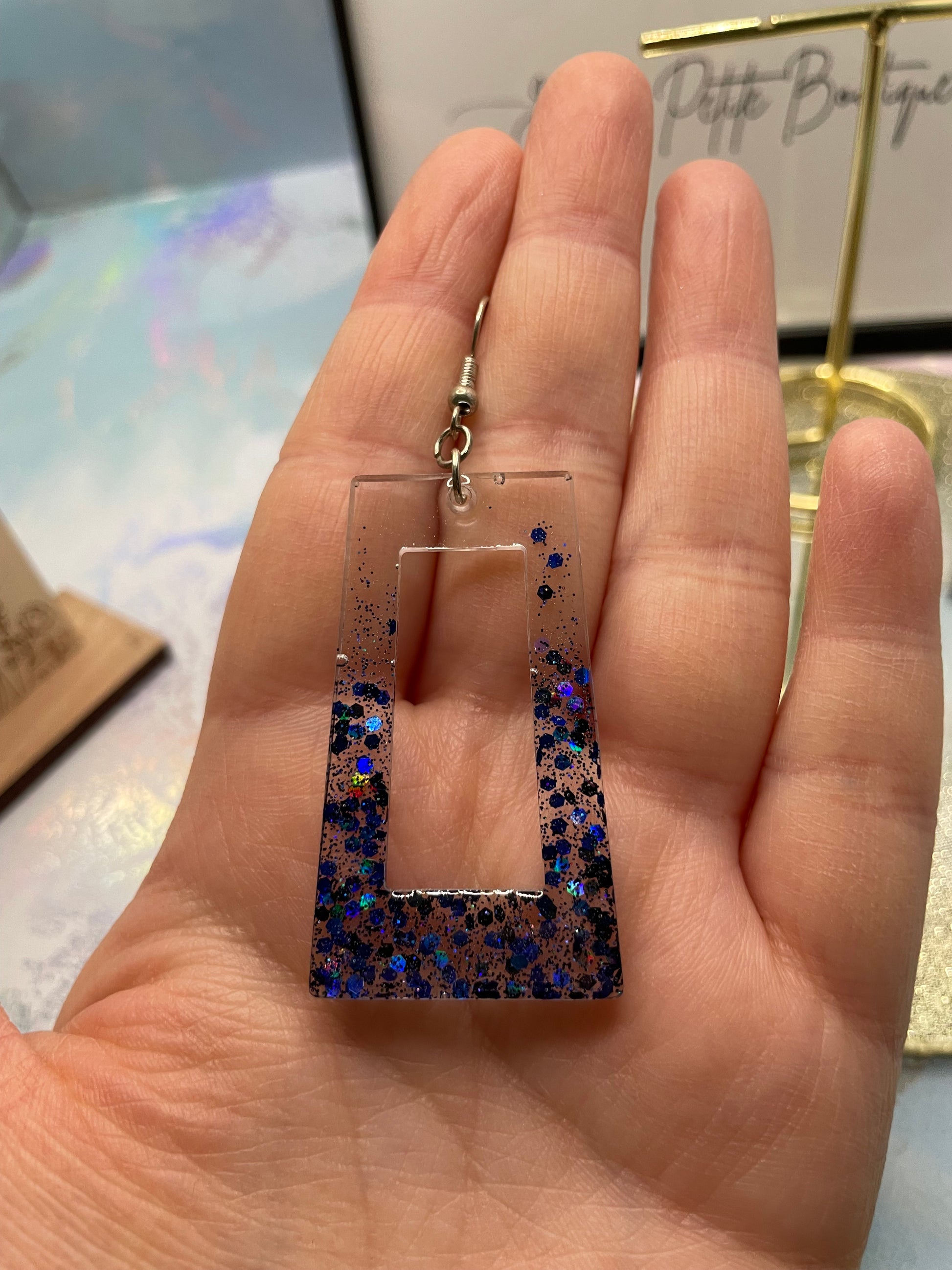 A serene and sparkling design with clear resin infused with shimmering blue glitter, creating a look reminiscent of a starry sky.