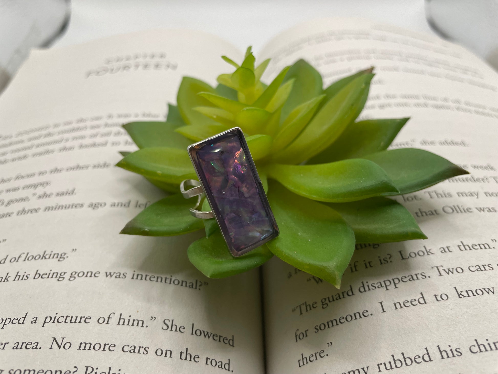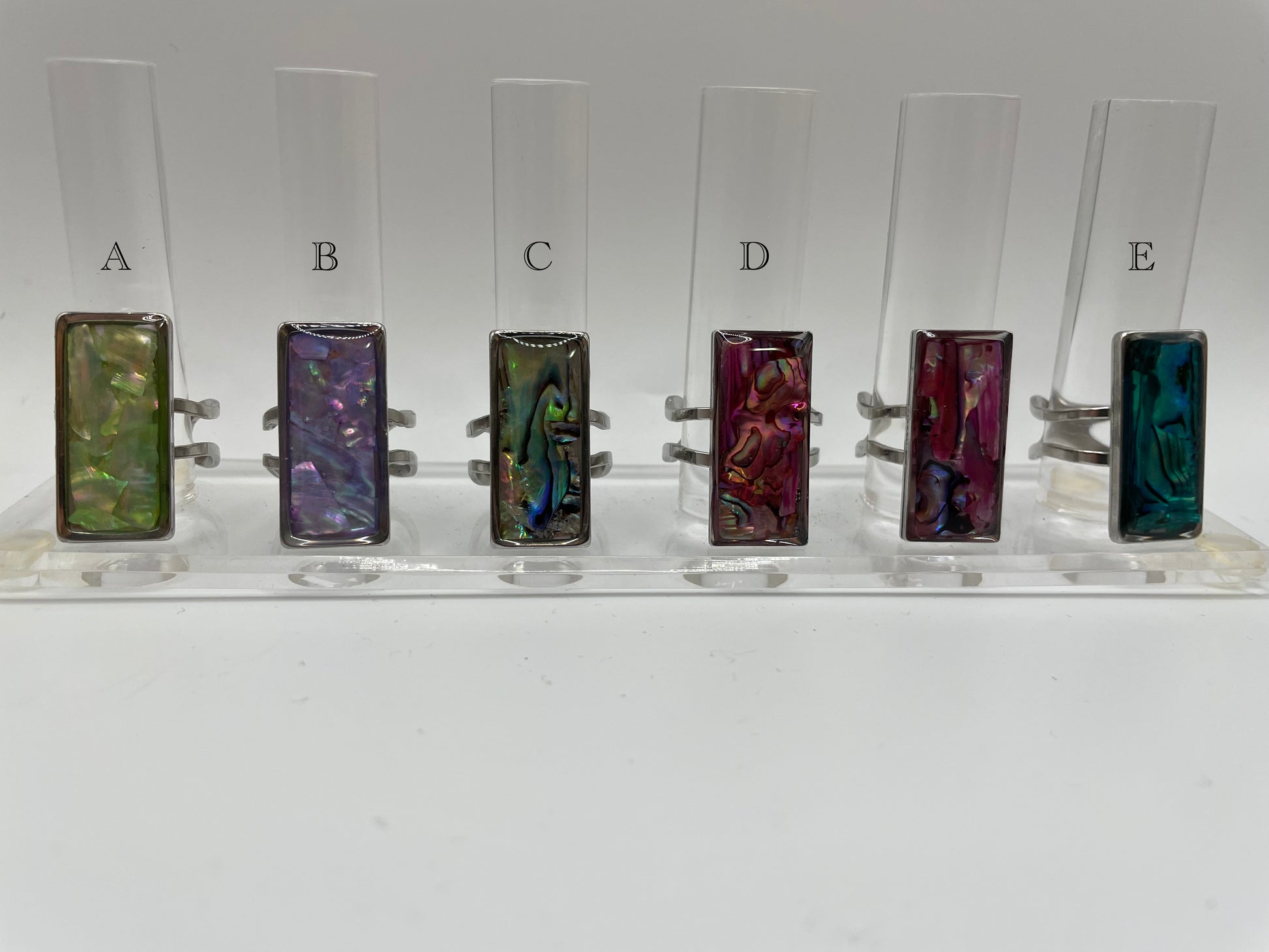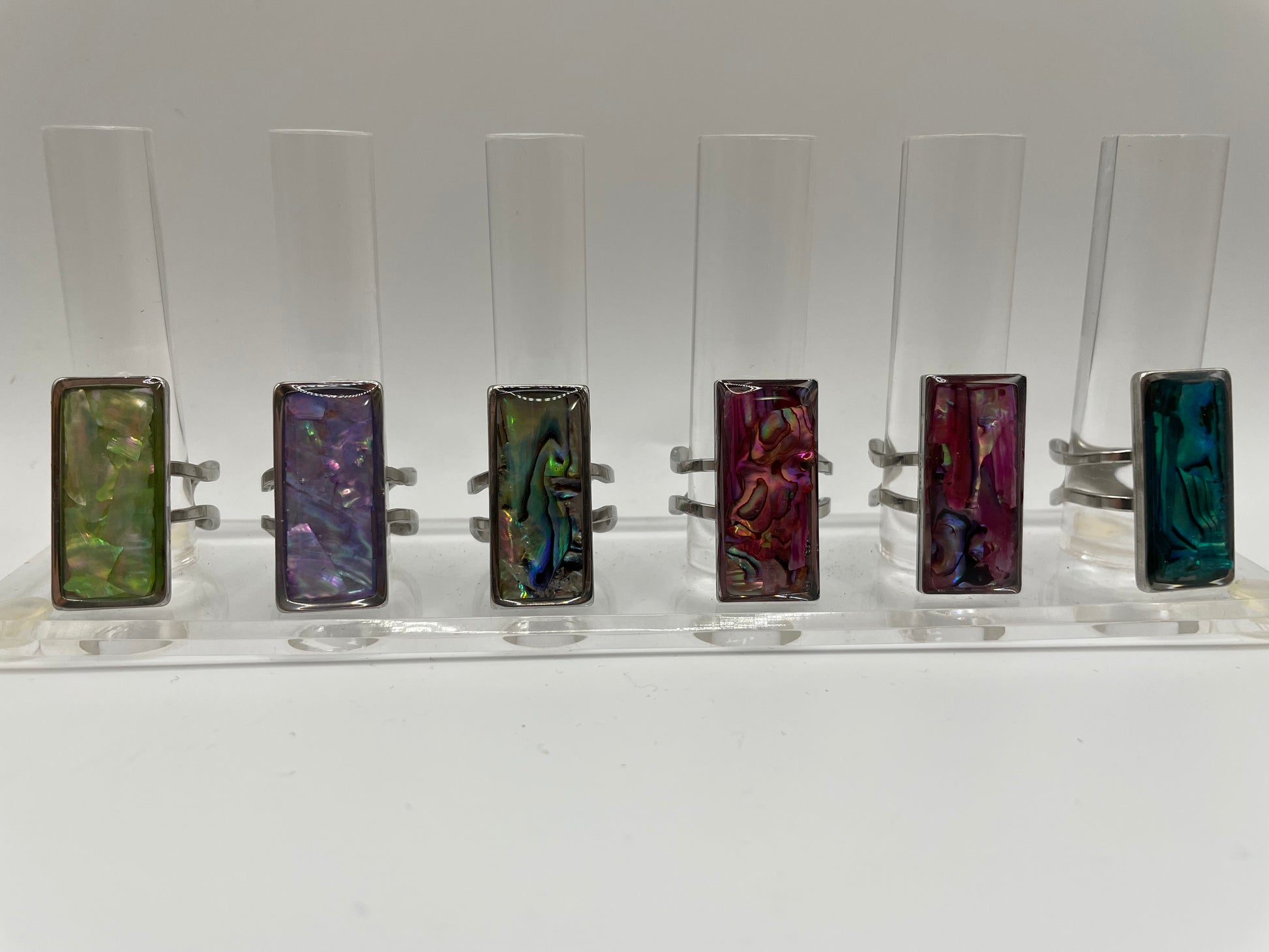 Each ring showcases real shell fragments set in resin, revealing beautiful iridescent reflections that shift gracefully under the light.