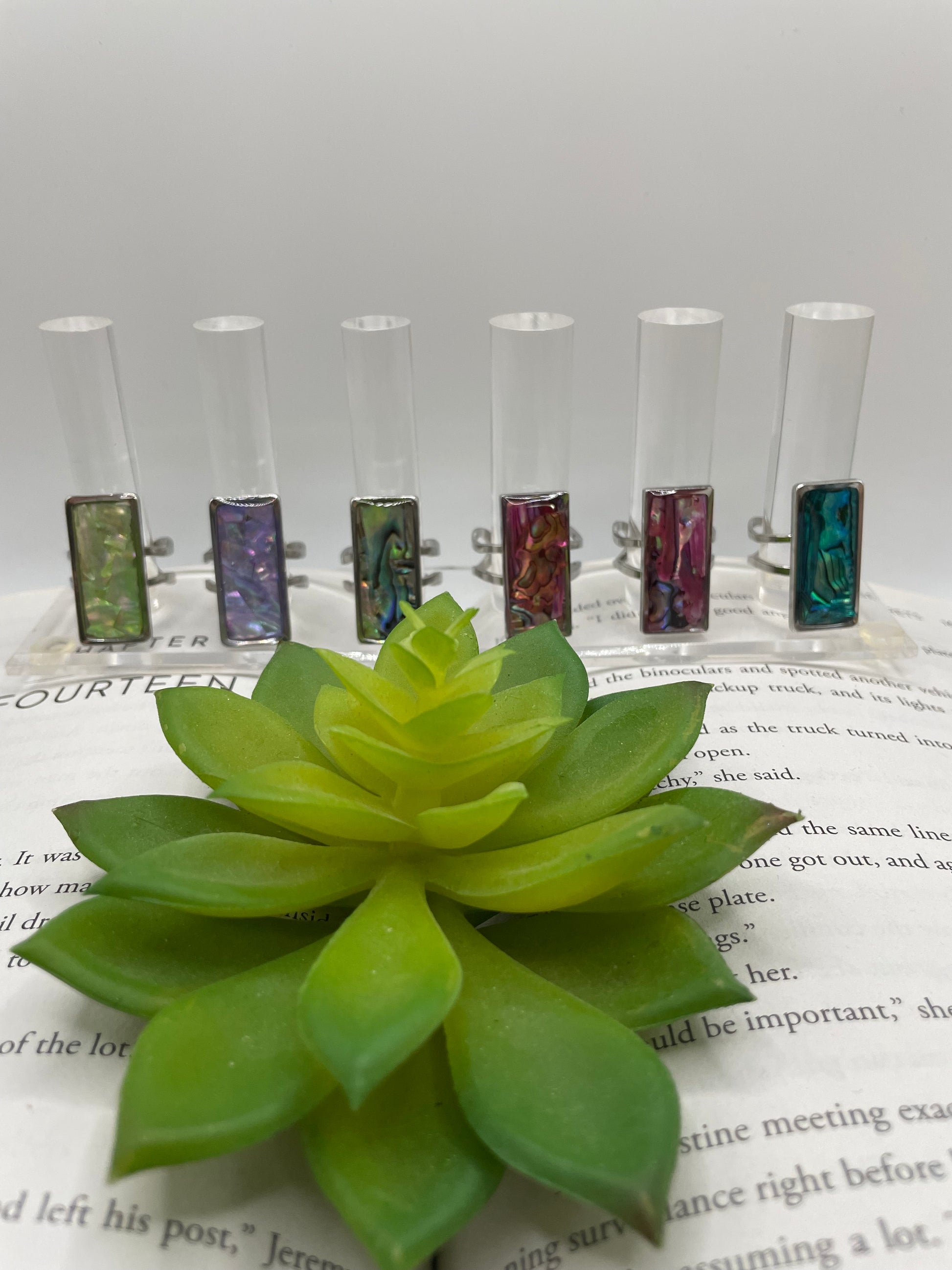 Add a touch of natural shimmer to your look with these stunning rectangular shell rings.