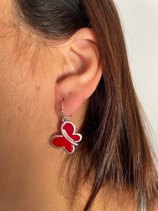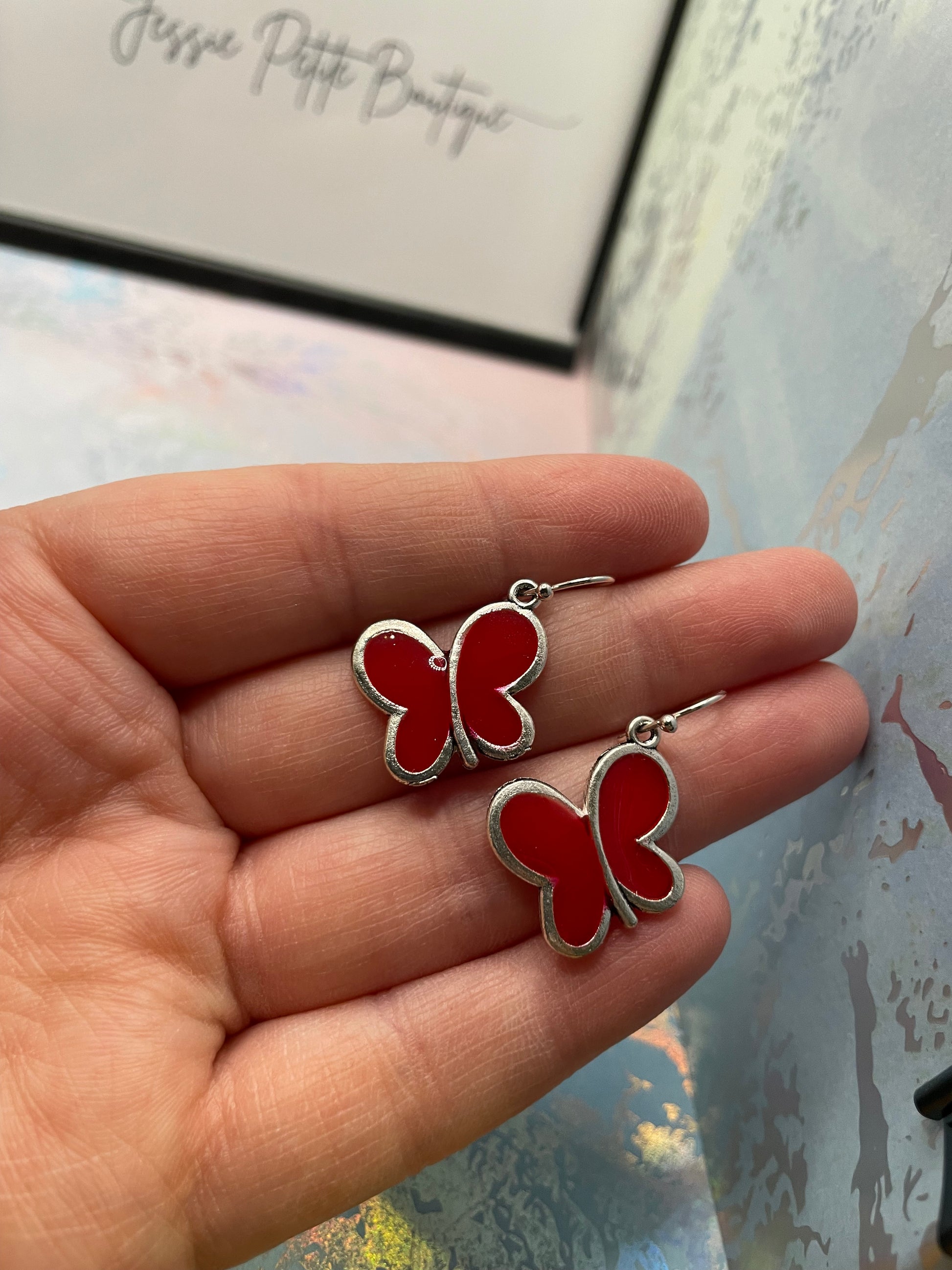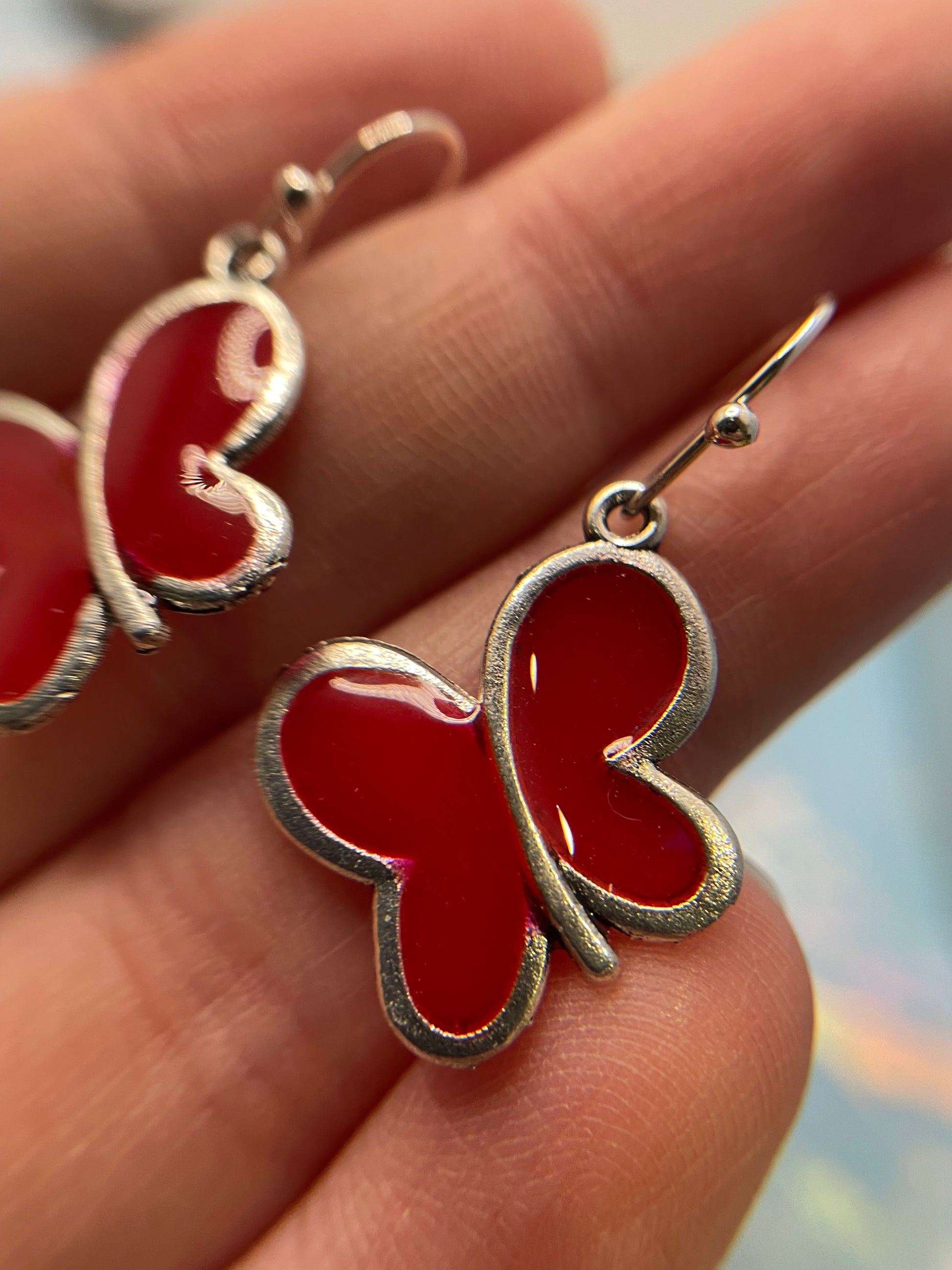 Delicate and charming, our "Red & Silver Butterfly" earrings bring a graceful touch to your look. These dainty butterfly-shaped earrings feature a silver metal outline filled with vibrant red resin, creating a beautiful contrast that captures both elegance and whimsy.