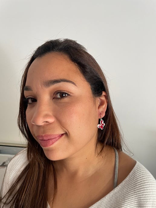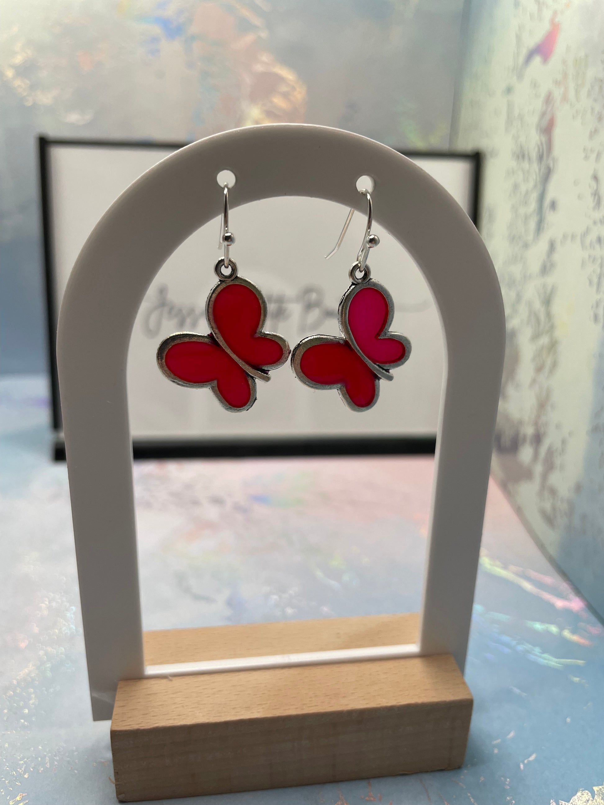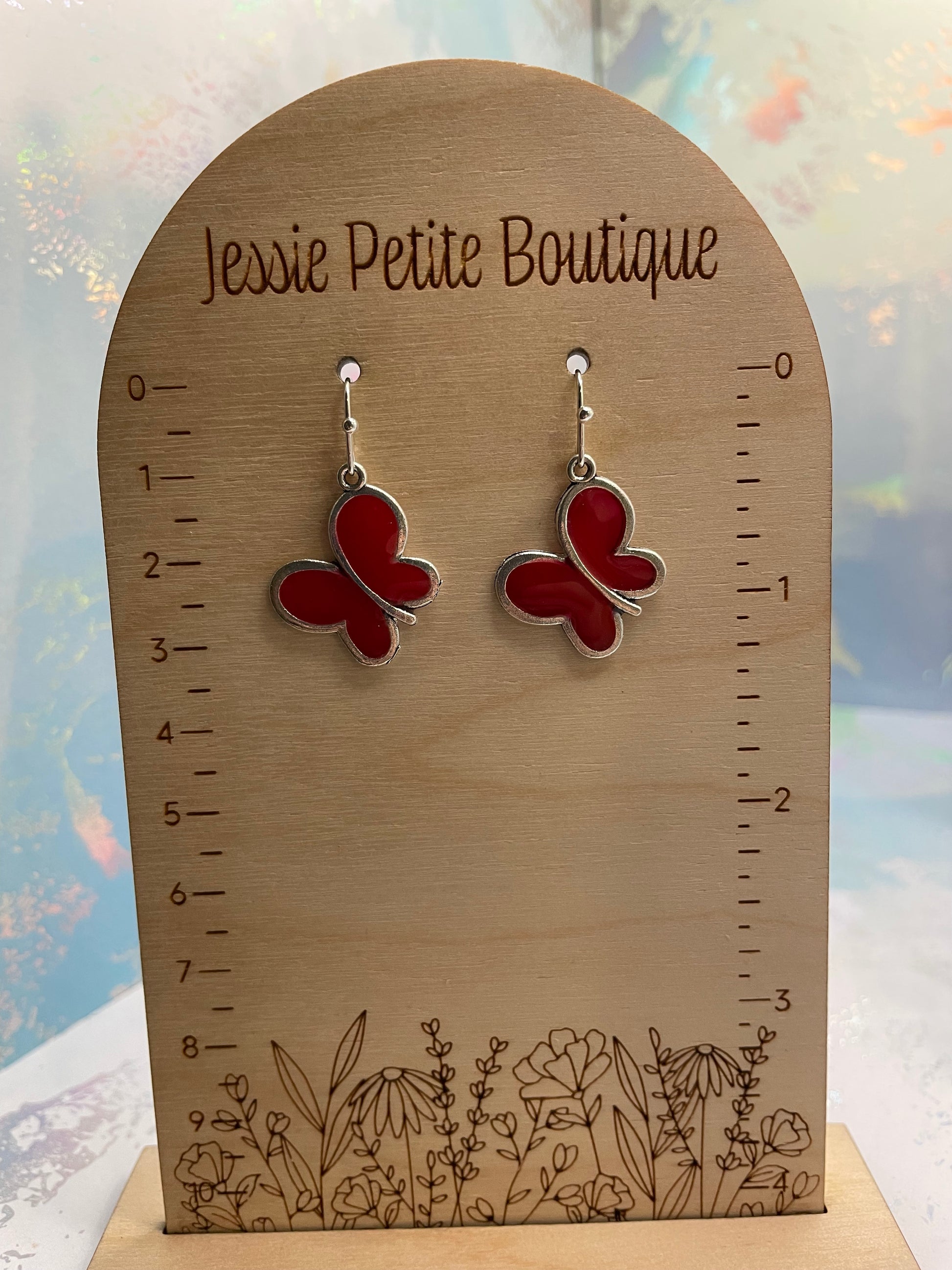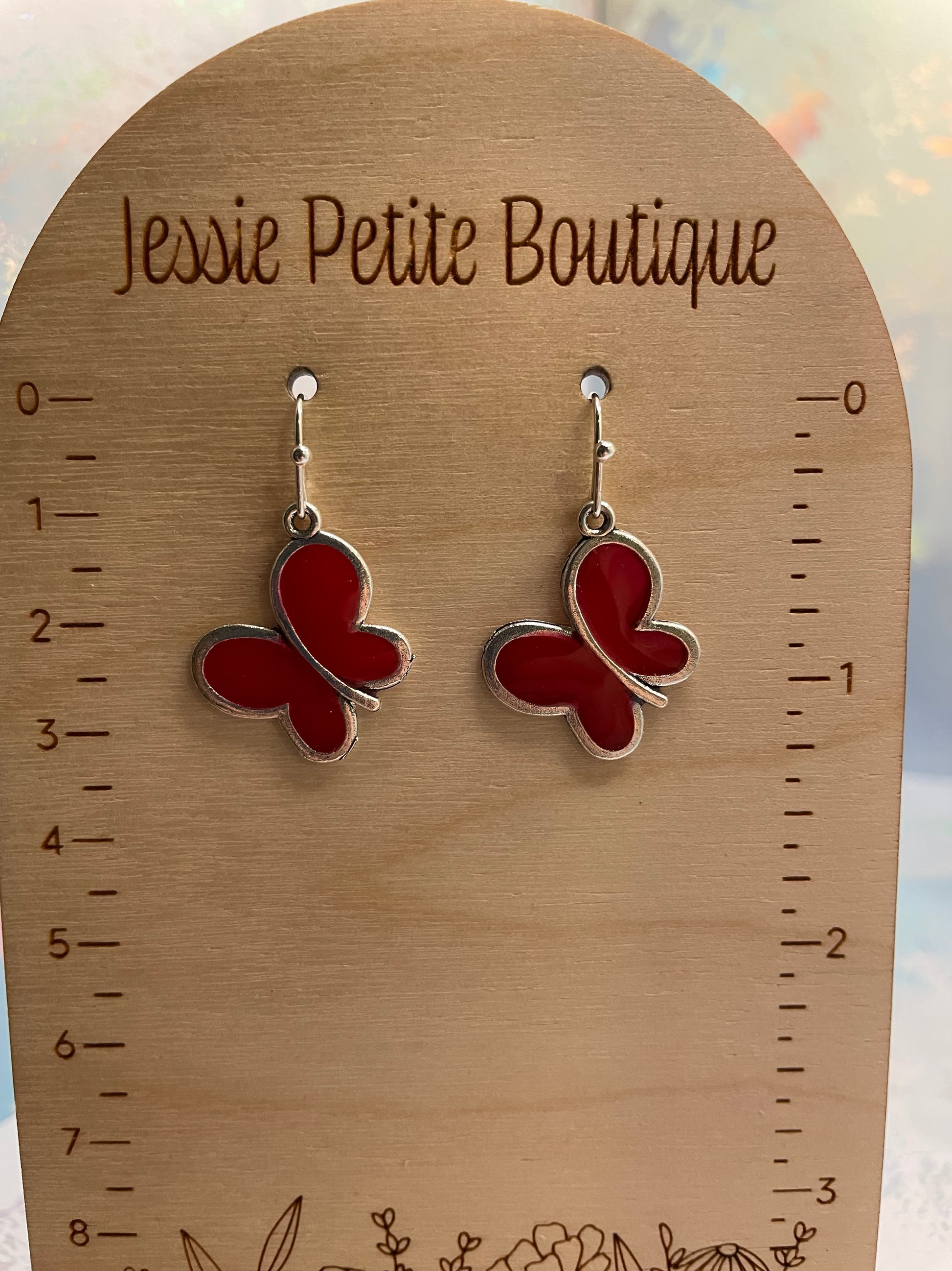 Delicate and charming, our "Red & Silver Butterfly" earrings bring a graceful touch to your look. These dainty butterfly-shaped earrings feature a silver metal outline filled with vibrant red resin, creating a beautiful contrast that captures both elegance and whimsy.