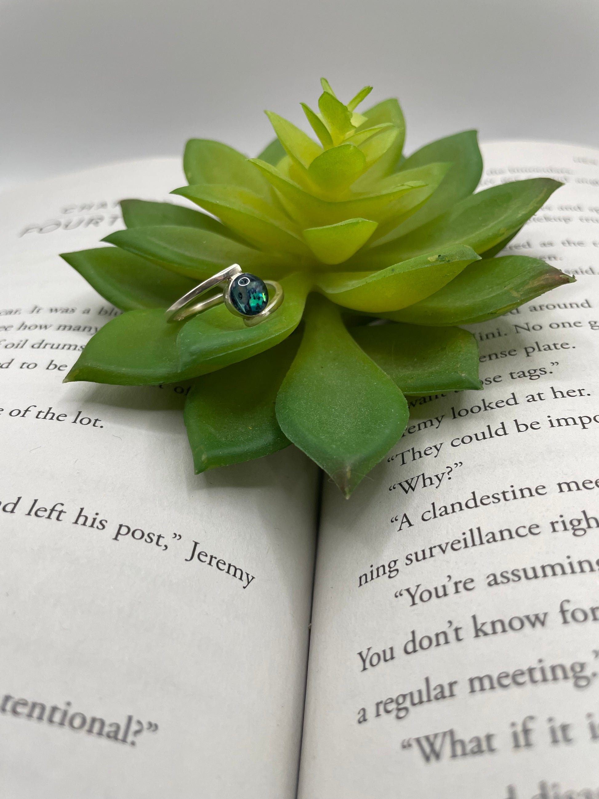 Elegant and timeless, this handcrafted 925 sterling silver ring features a 6 mm round bezel filled with natural shell and resin, creating a mesmerizing play of colors with iridescent highlights.