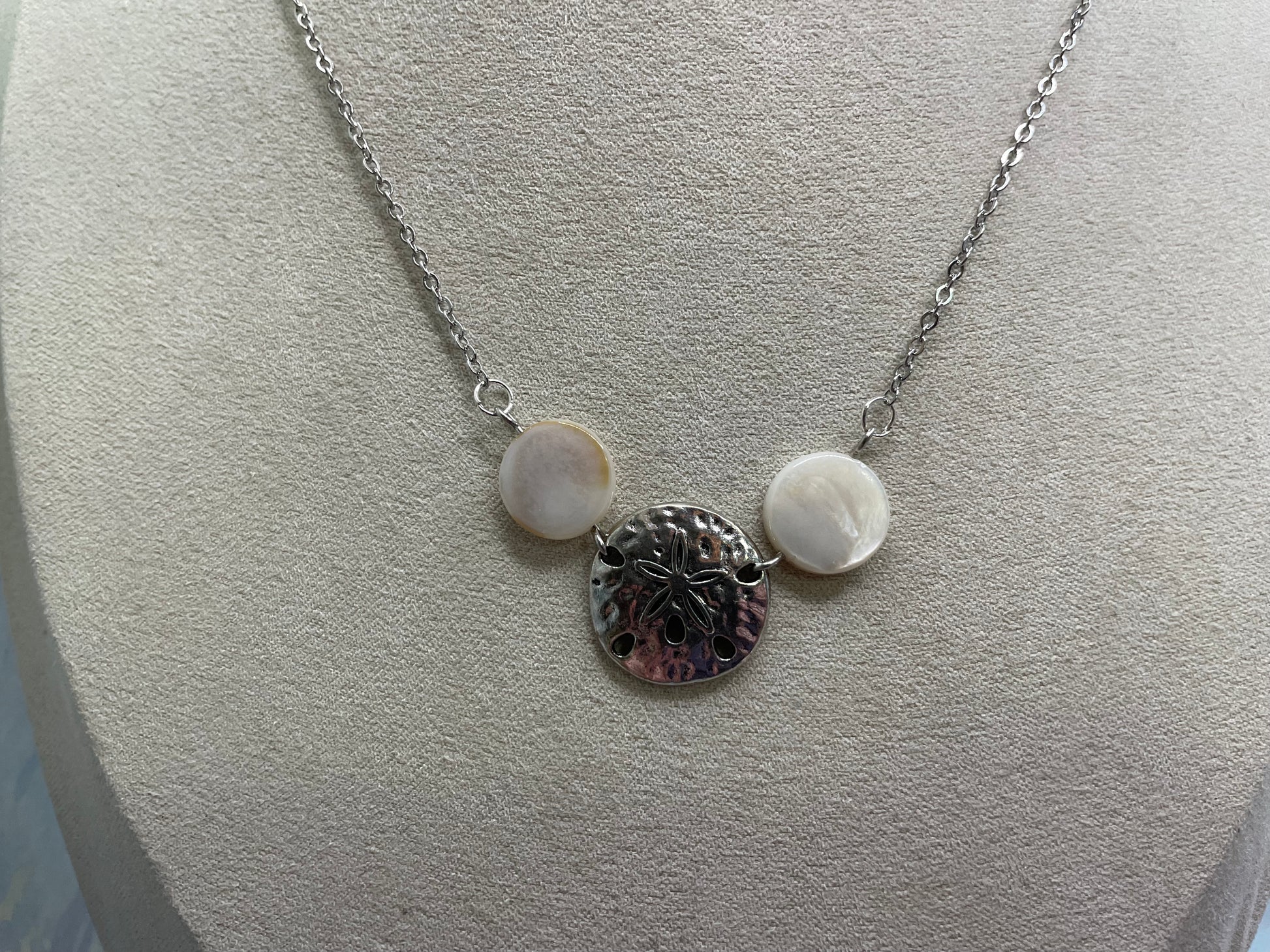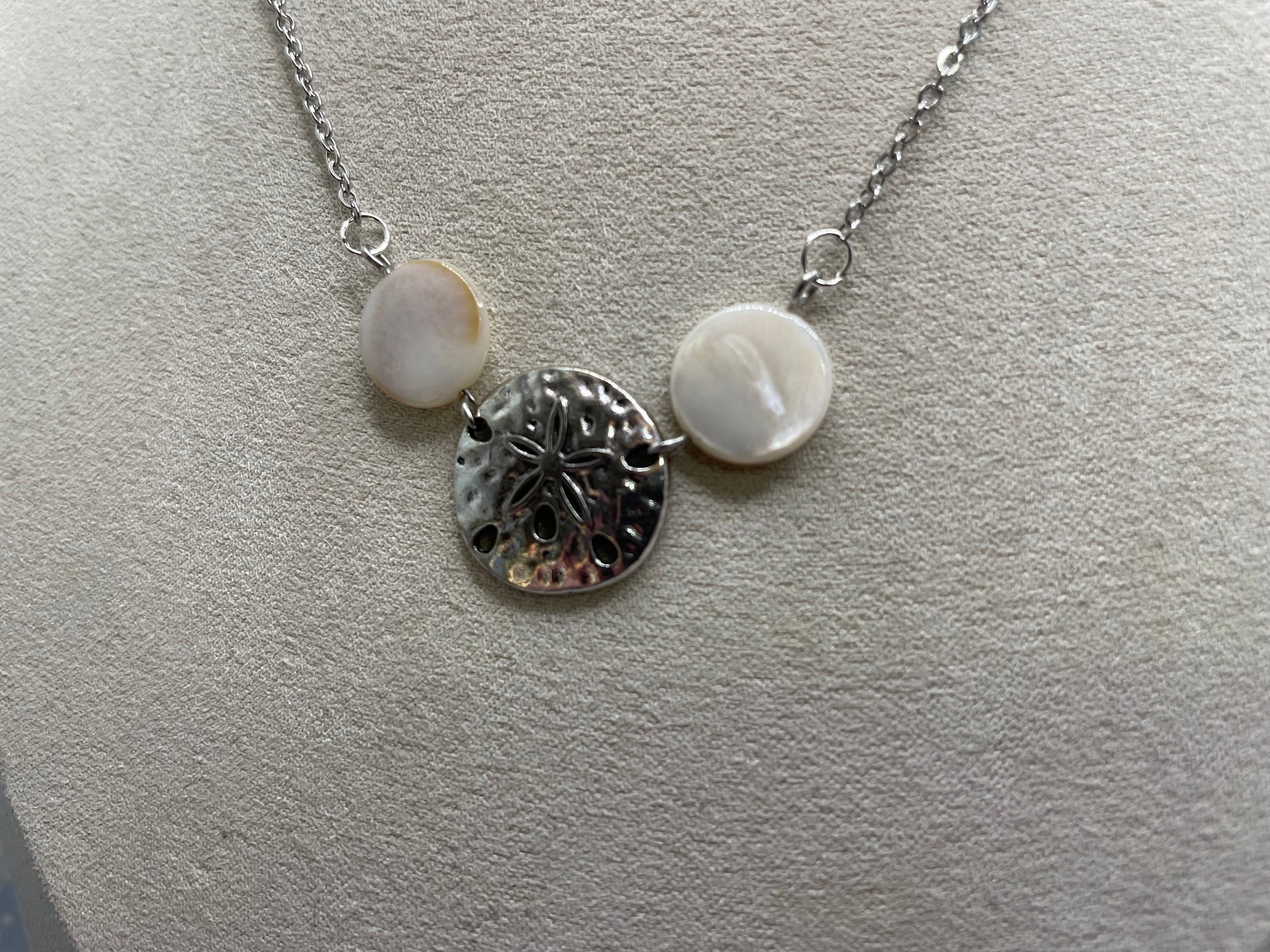 This elegant necklace features a harmonious trio of elements: a textured round silver sand dollar charm framed by two natural white shell accents. The central charm showcases a raised sand dollar motif with subtle hammered details, while the smooth shell pieces add a soft, organic contrast. Together, they create a balanced seaside-inspired design that feels both timeless and delicate.