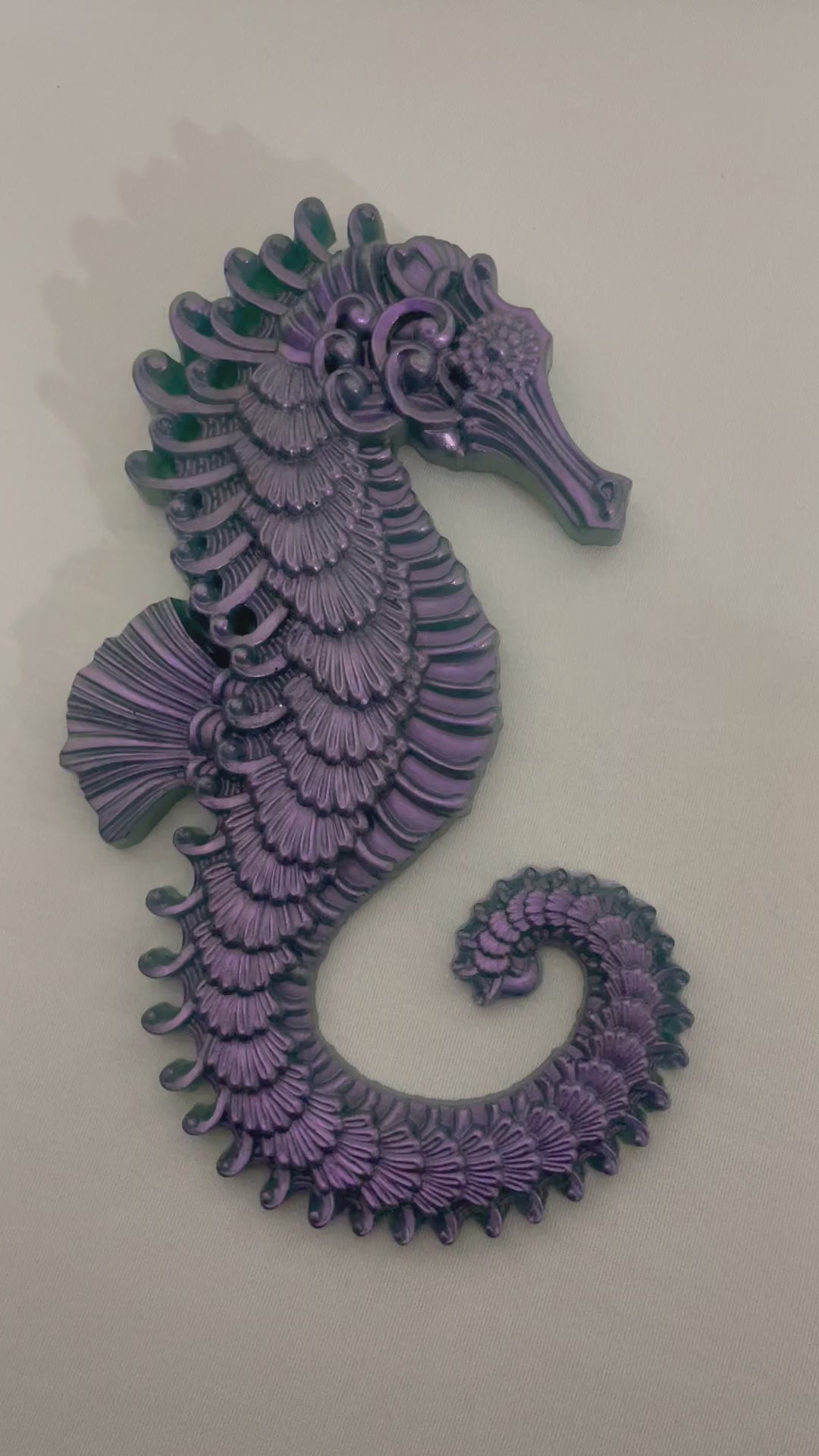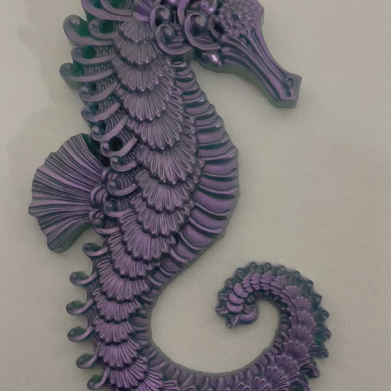Add a splash of ocean magic to your space with this handcrafted resin seahorse. Finished with shimmering mica powder, its unique chameleon purple tones shift beautifully under the light, creating an enchanting effect from every angle.