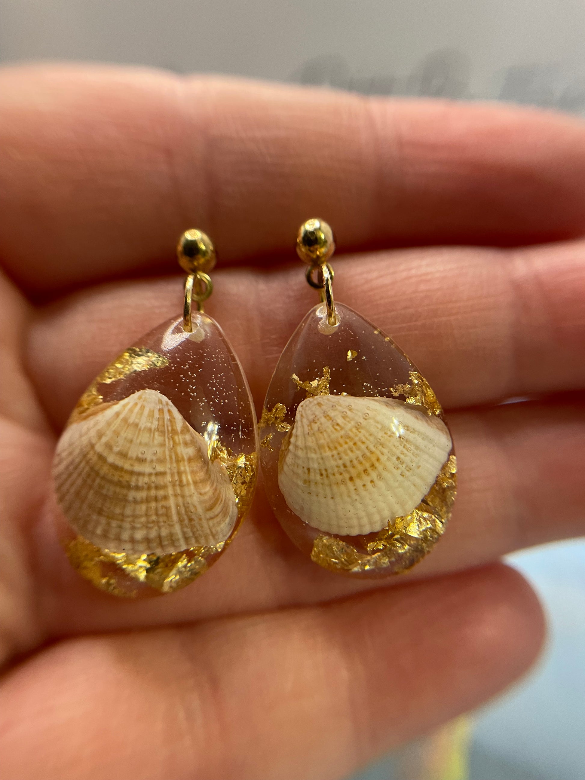 These teardrop earrings showcase a perfect blend of elegance and coastal charm. Encased in clear resin, delicate gold flakes and shimmering sea shells create a stunning visual effect that captures the beauty of the ocean.