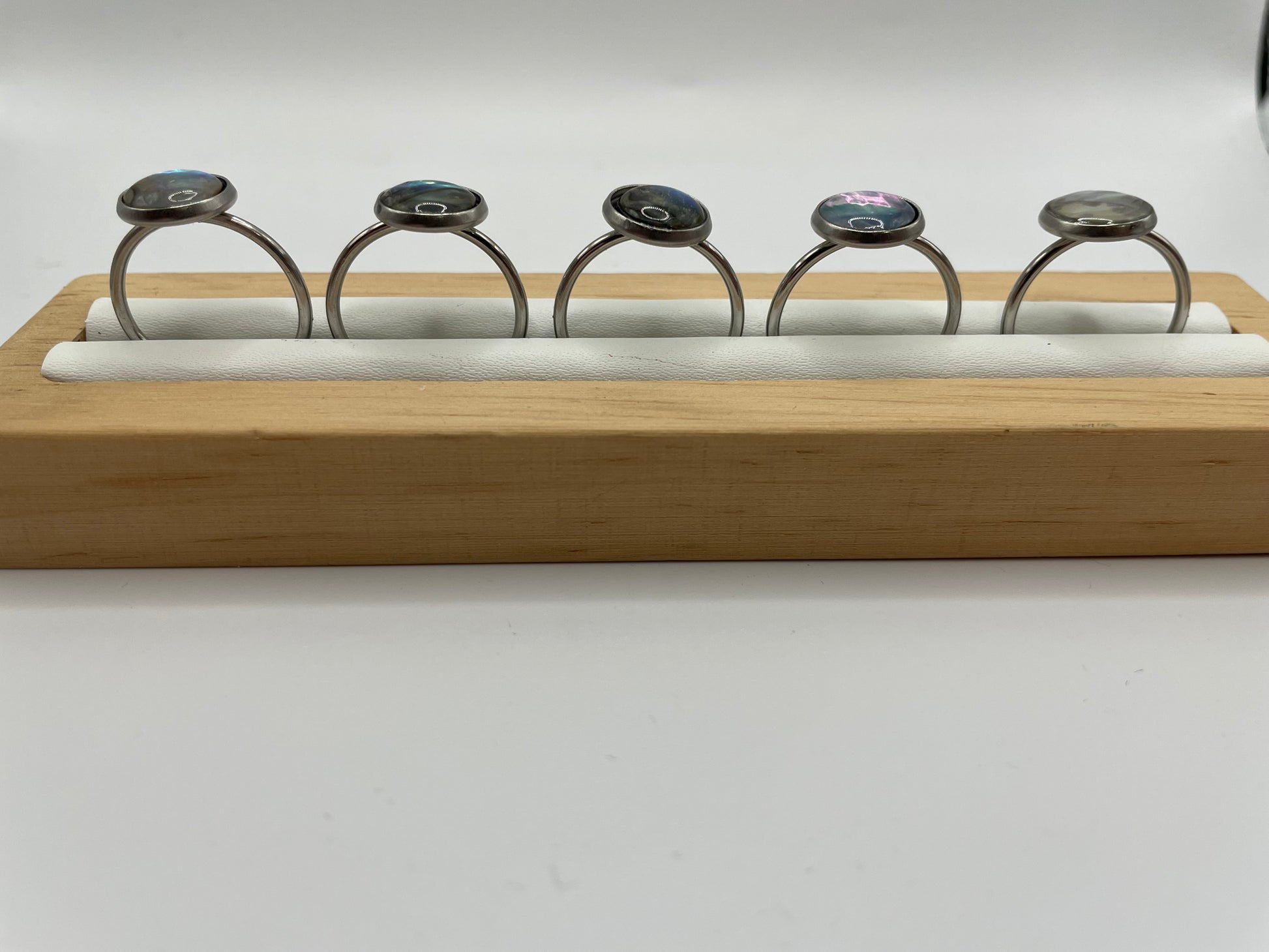 Elegant and minimalist, this ring features a luminous shell cabochon that shimmers beautifully under the light, revealing subtle iridescent reflections. Its sleek round shape and polished stainless-steel finish make it perfect for everyday elegance or layering with other pieces.