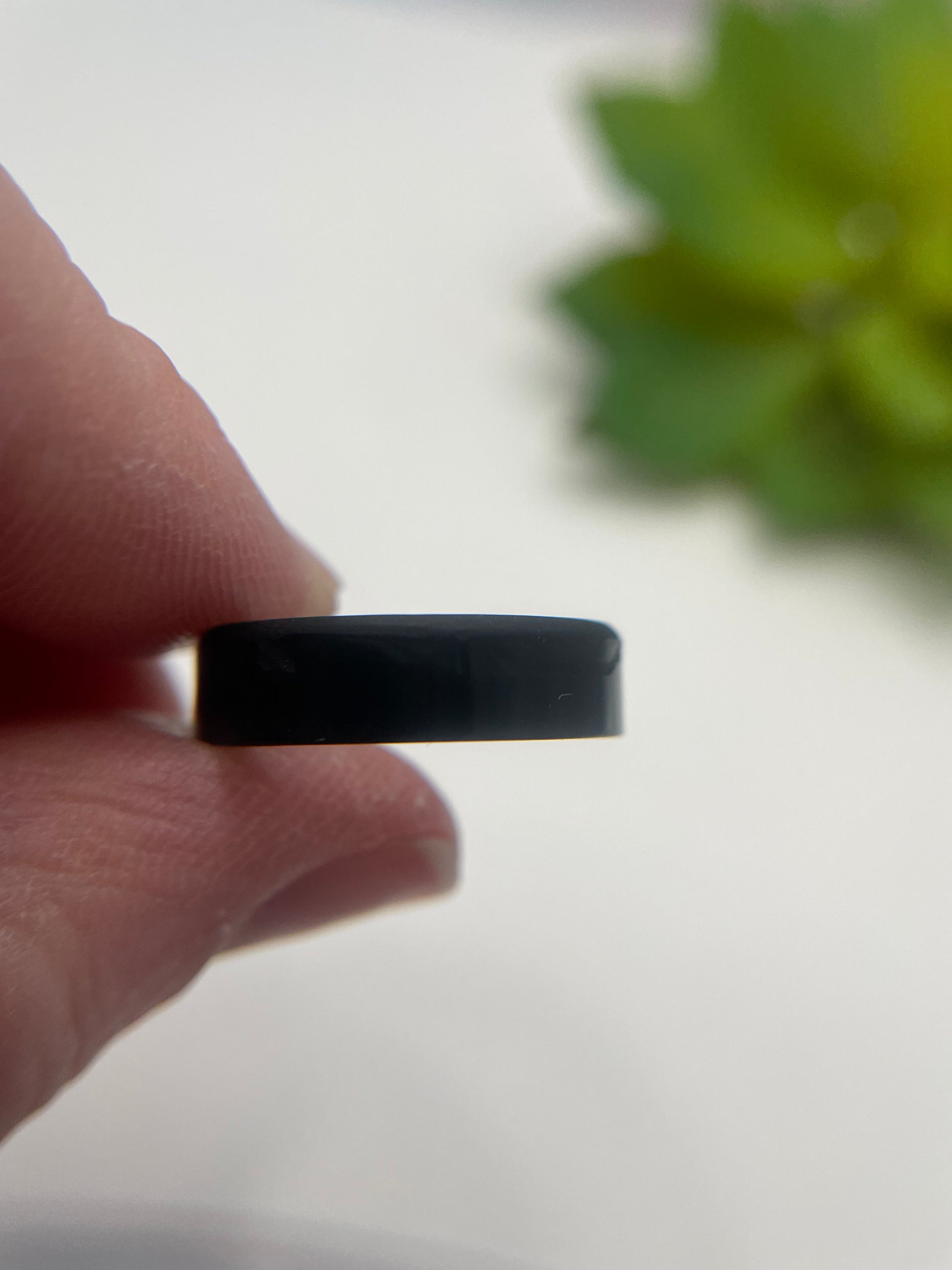 This slim black resin ring features a smooth, glossy finish with subtle depth created by fine mica powder. Its minimalist profile and sleek band make it an easy, versatile piece—perfect for everyday wear or stacking with other rings.
