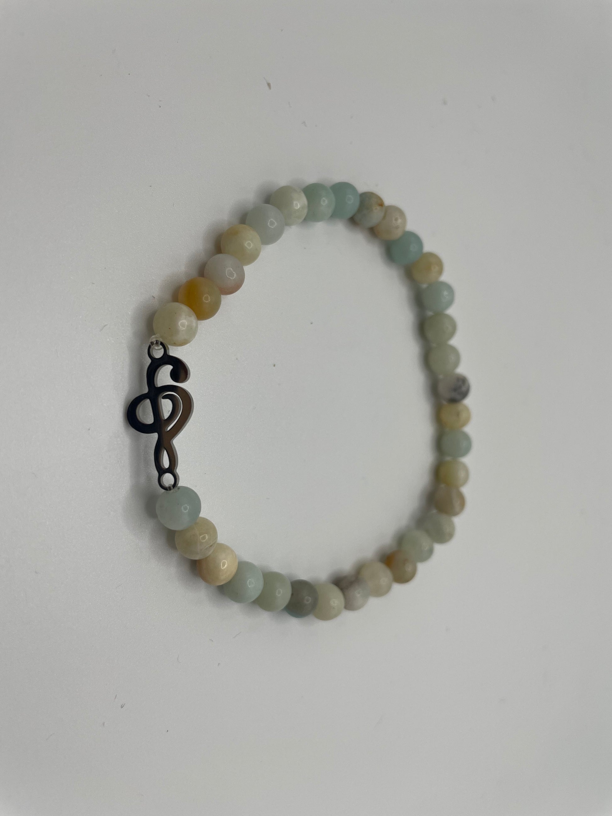 Elegant and soothing, this handcrafted bracelet features soft pastel-toned beads complemented by a stainless steel treble clef charm. Its subtle mix of creamy whites, gentle yellows, and light greens creates a harmonious palette, perfect for music lovers or anyone who appreciates delicate, refined accessories.