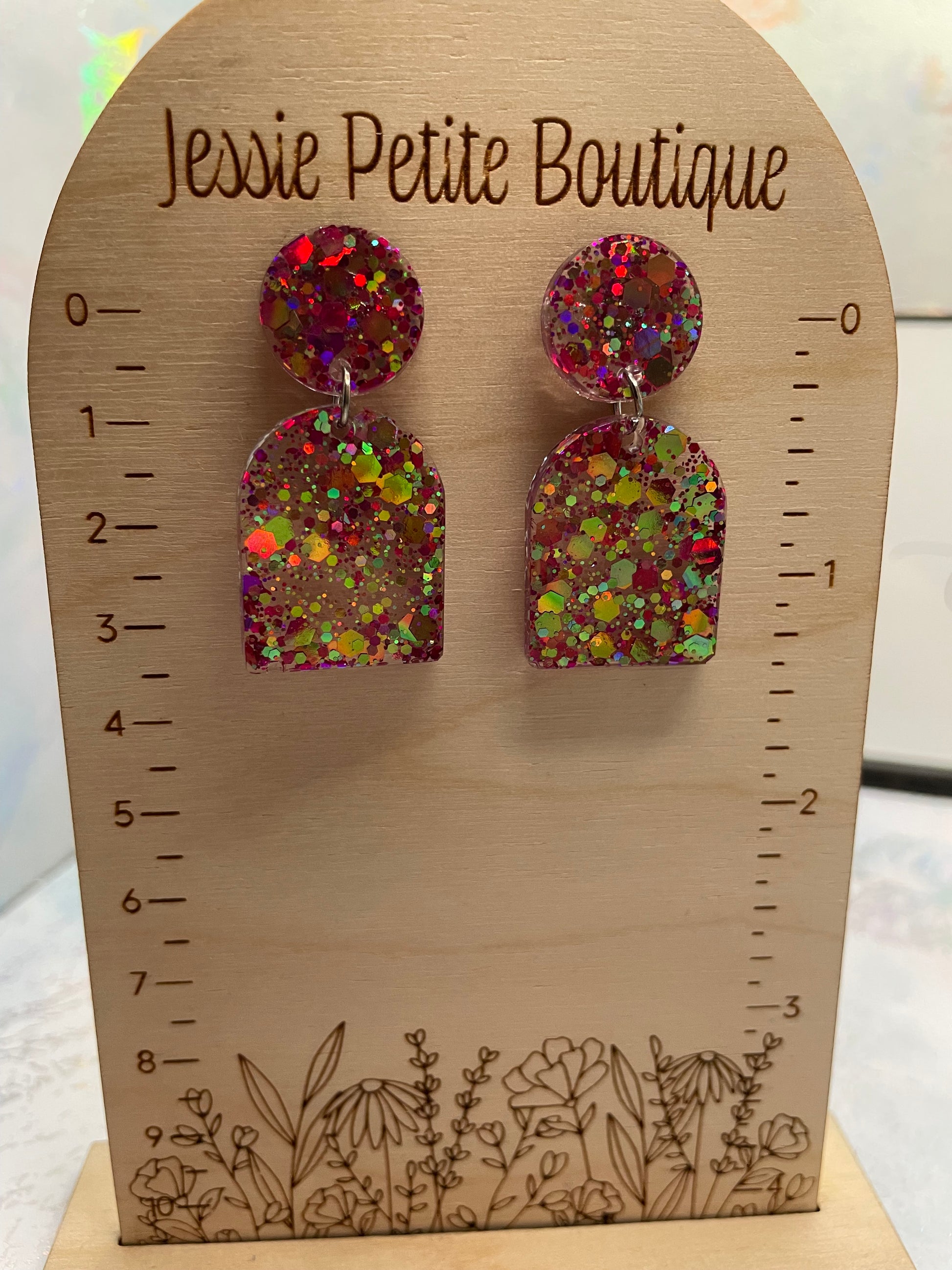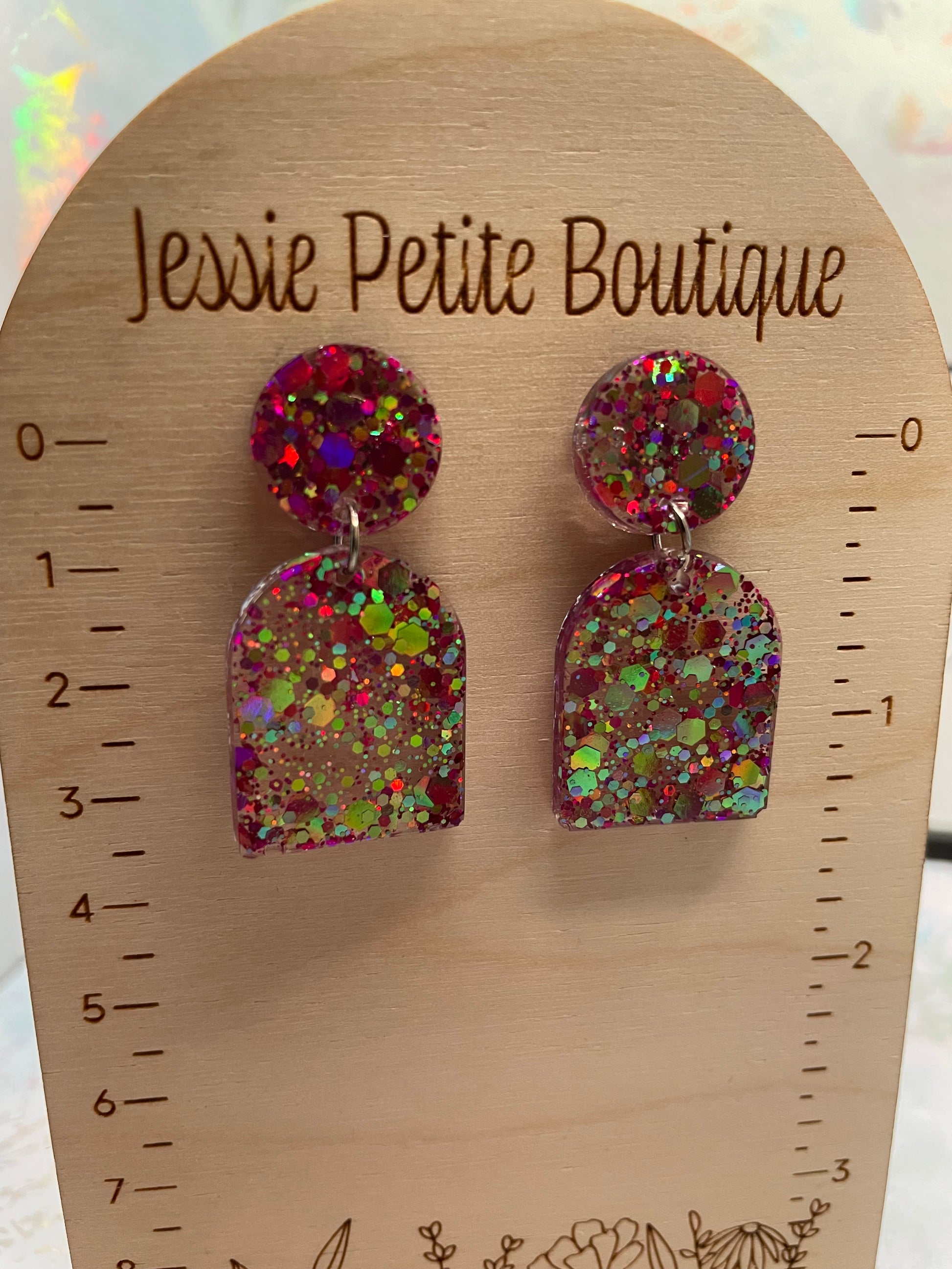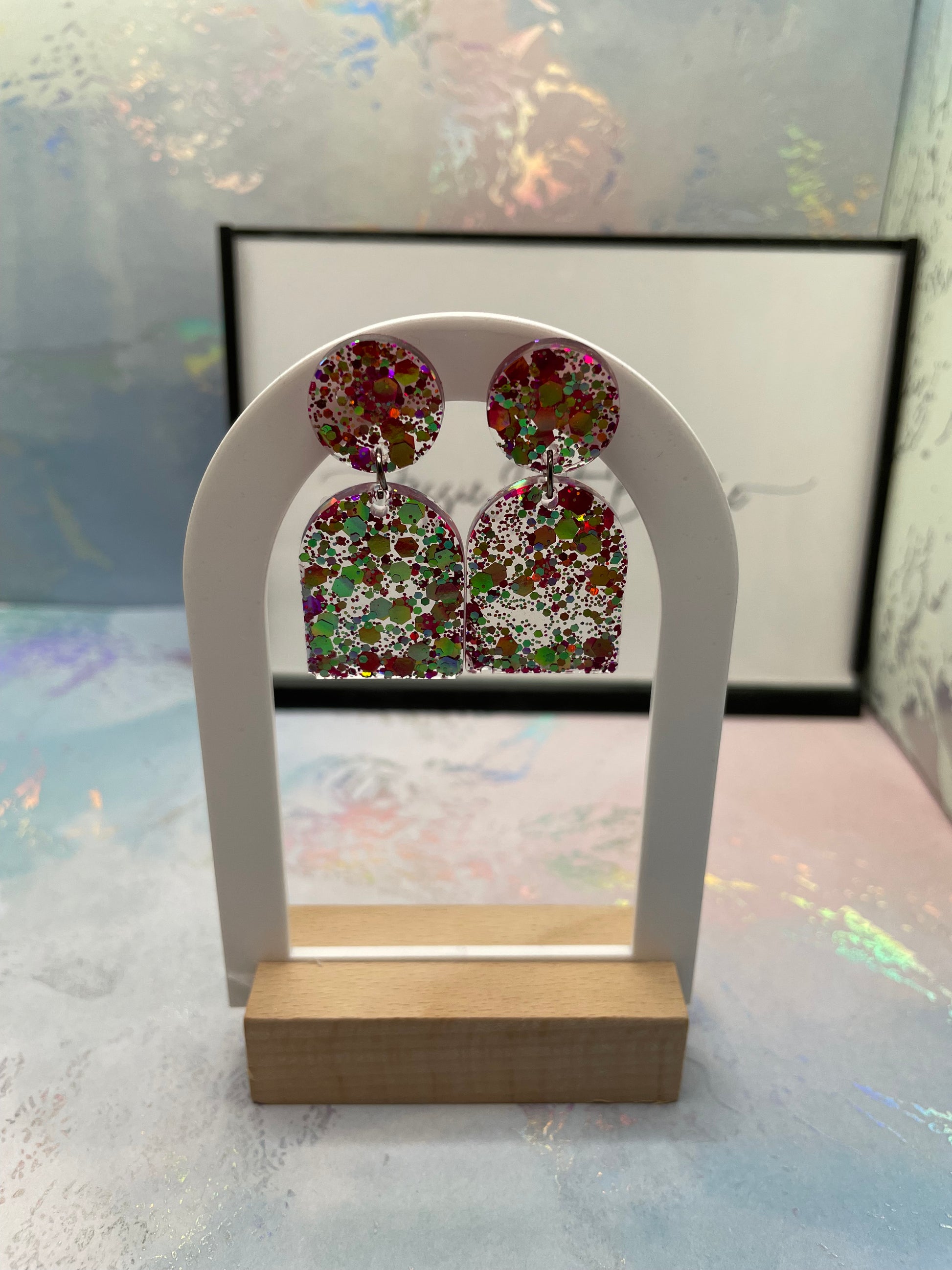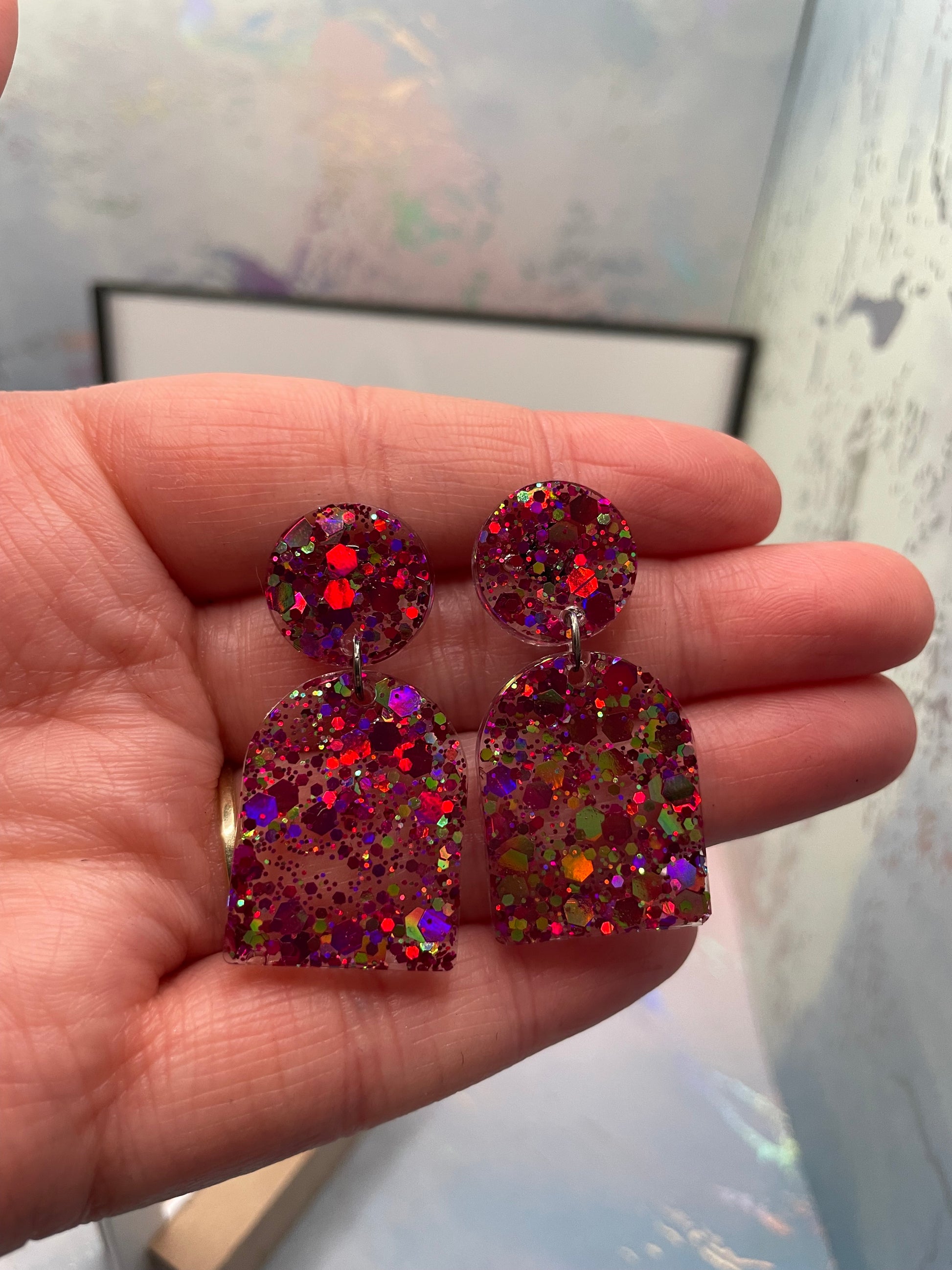 Add a touch of sparkle to your outfit with these delightful arch-shaped earrings. Crafted from resin with a shimmering blend of purple and pink glitter, they exude playful elegance. Featuring a round stud and nickel-free butterfly closure, these lightweight earrings are perfect for both casual and formal occasions.