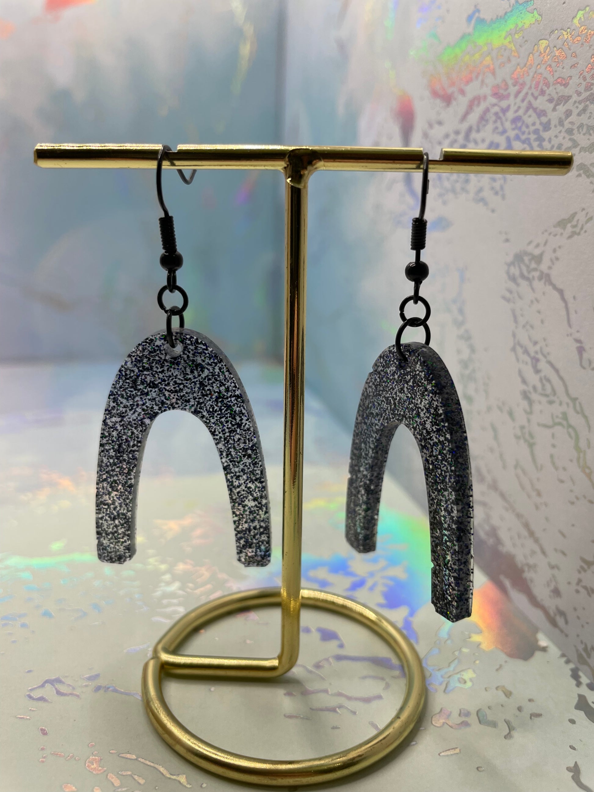 Elevate your style with these dazzling galaxy-inspired arch earrings. The sparkly black resin design, enhanced with glitter, mimics the beauty of the night sky. These lightweight earrings are perfect for day-to-night wear and dangle elegantly from secure ear wire closures.