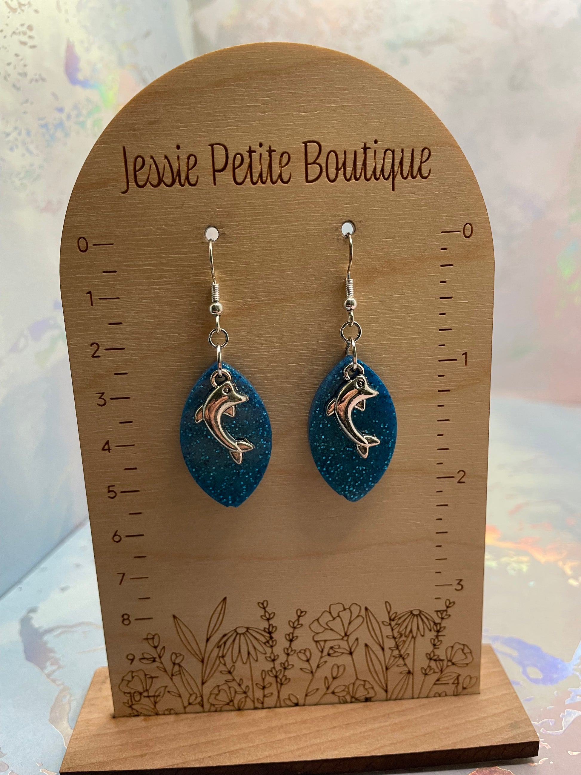 Dive into oceanic elegance with these enchanting sparkly blue earrings featuring a charming silver dolphin accent. Crafted from resin, mica powder and glitter, these earrings shimmer beautifully with every movement. The unique oval shape with pointed ends adds a modern twist, while the nickel-free ear wires ensure comfort and safety for sensitive ears.