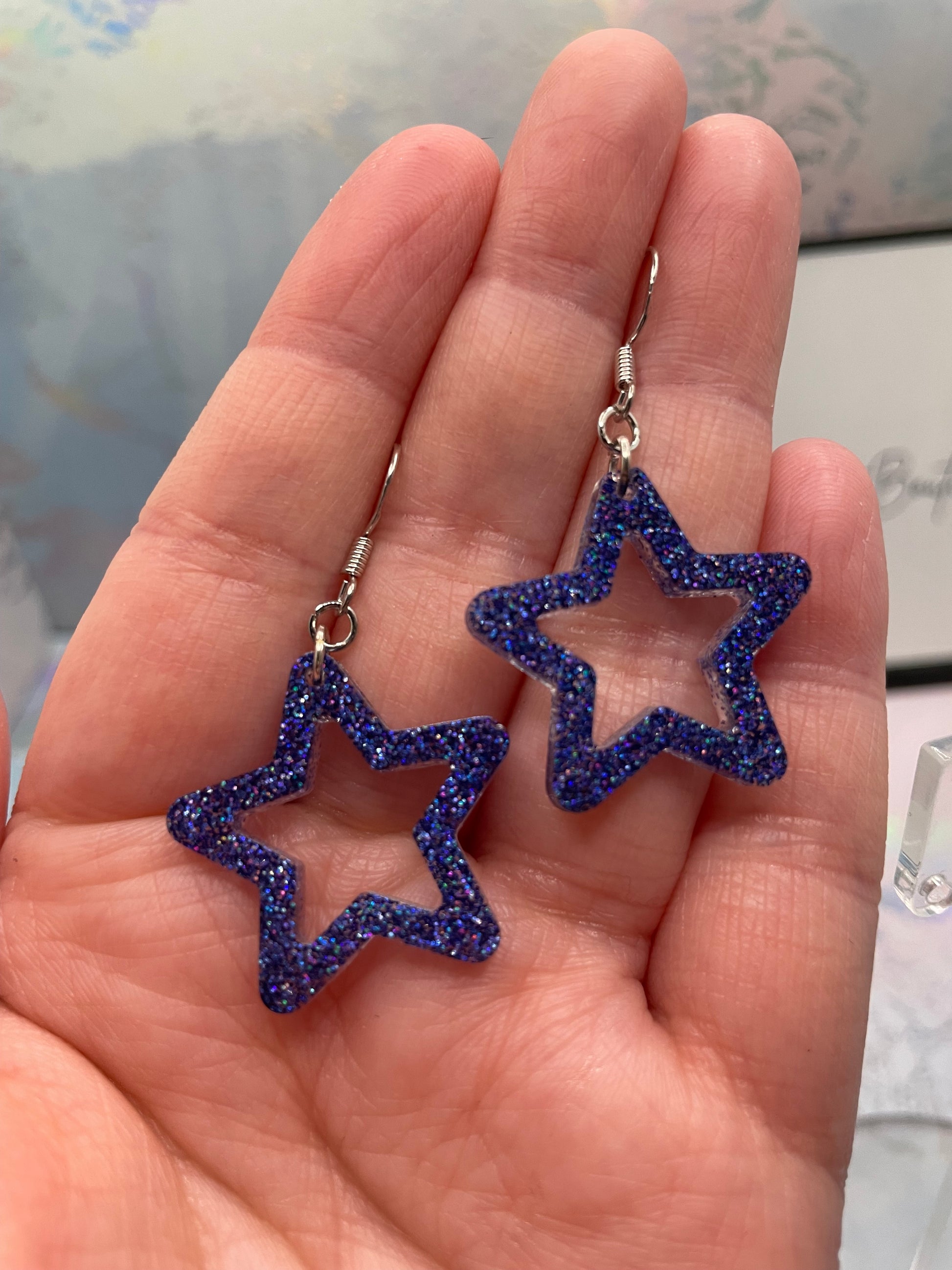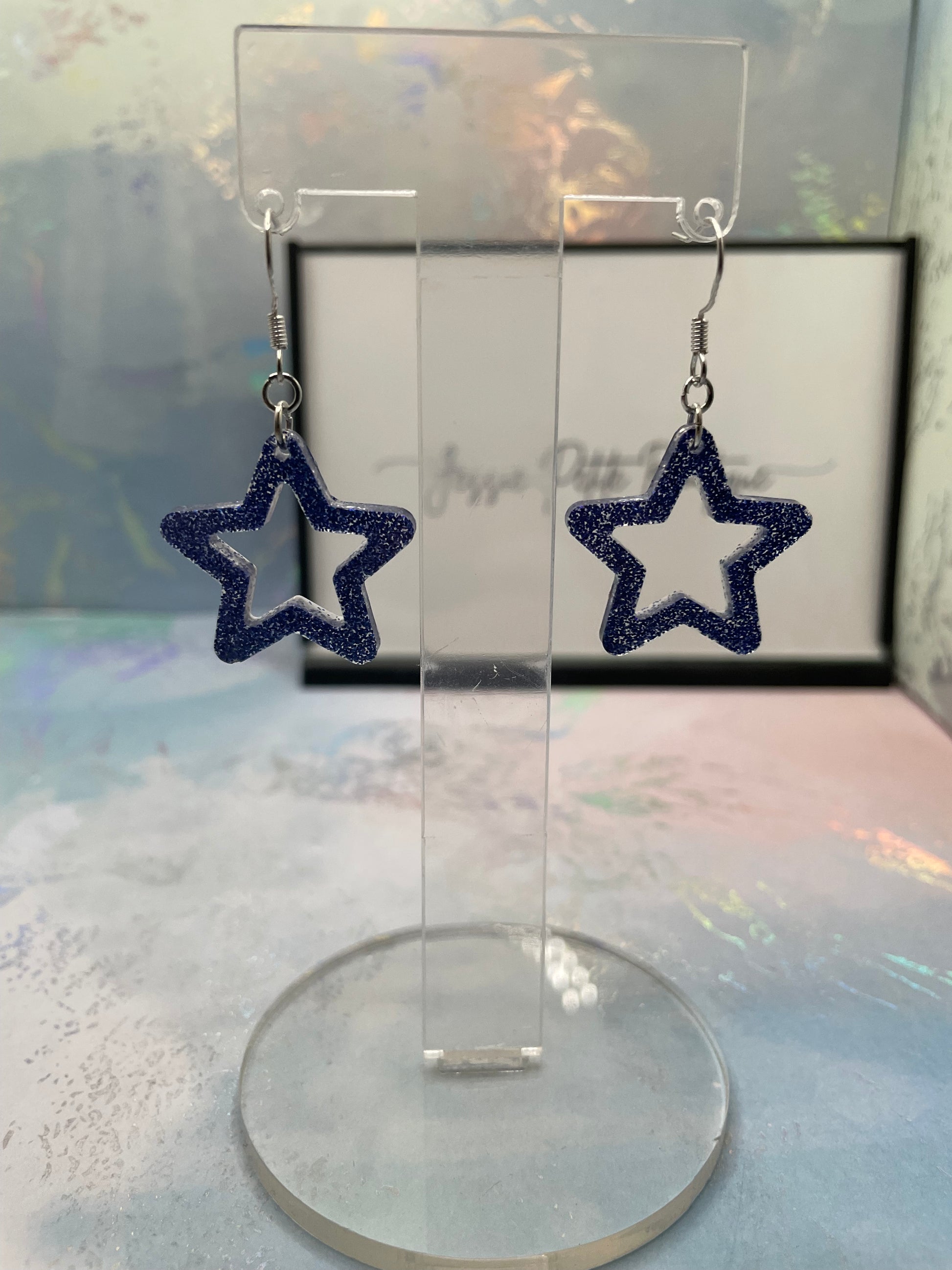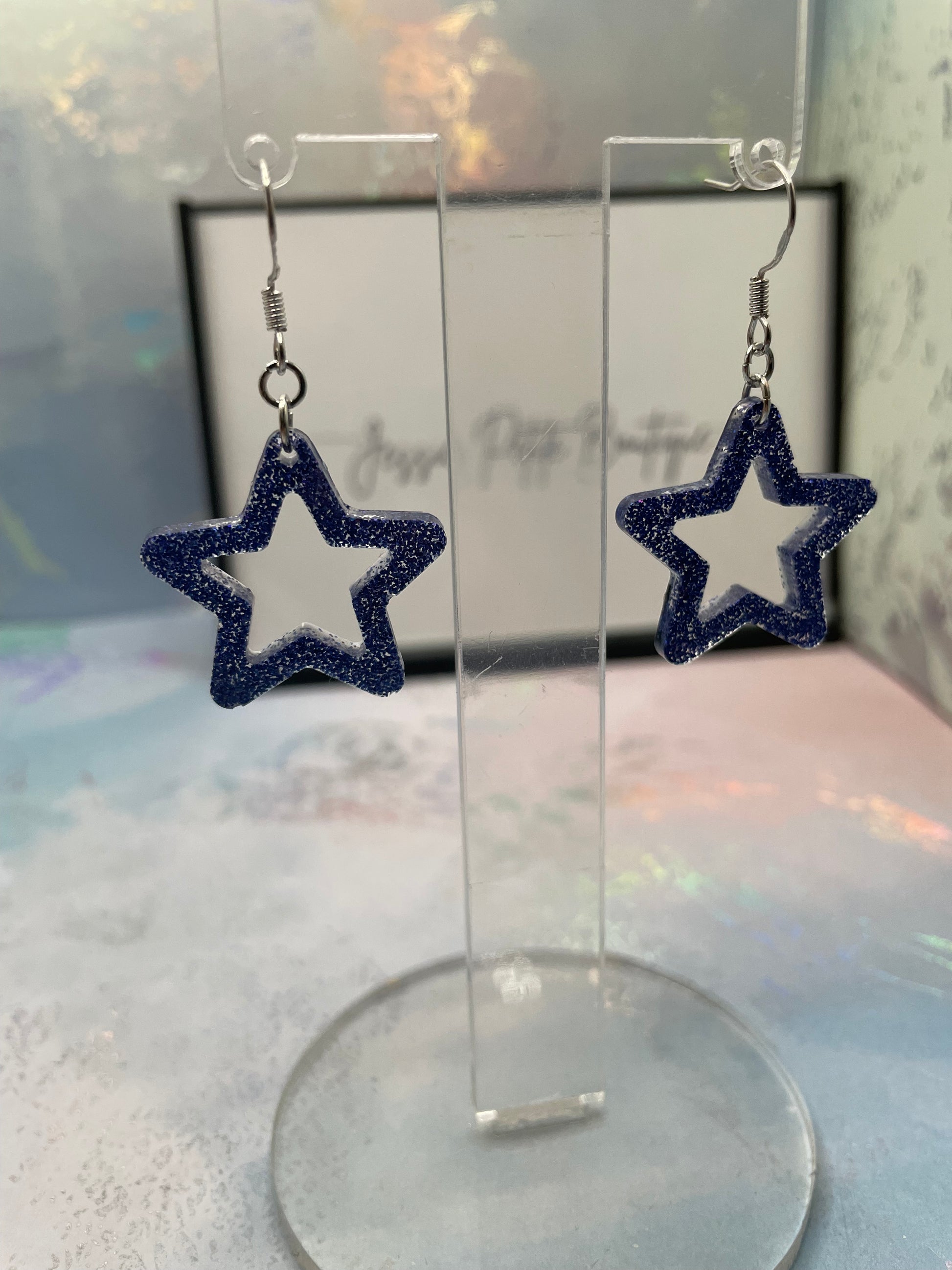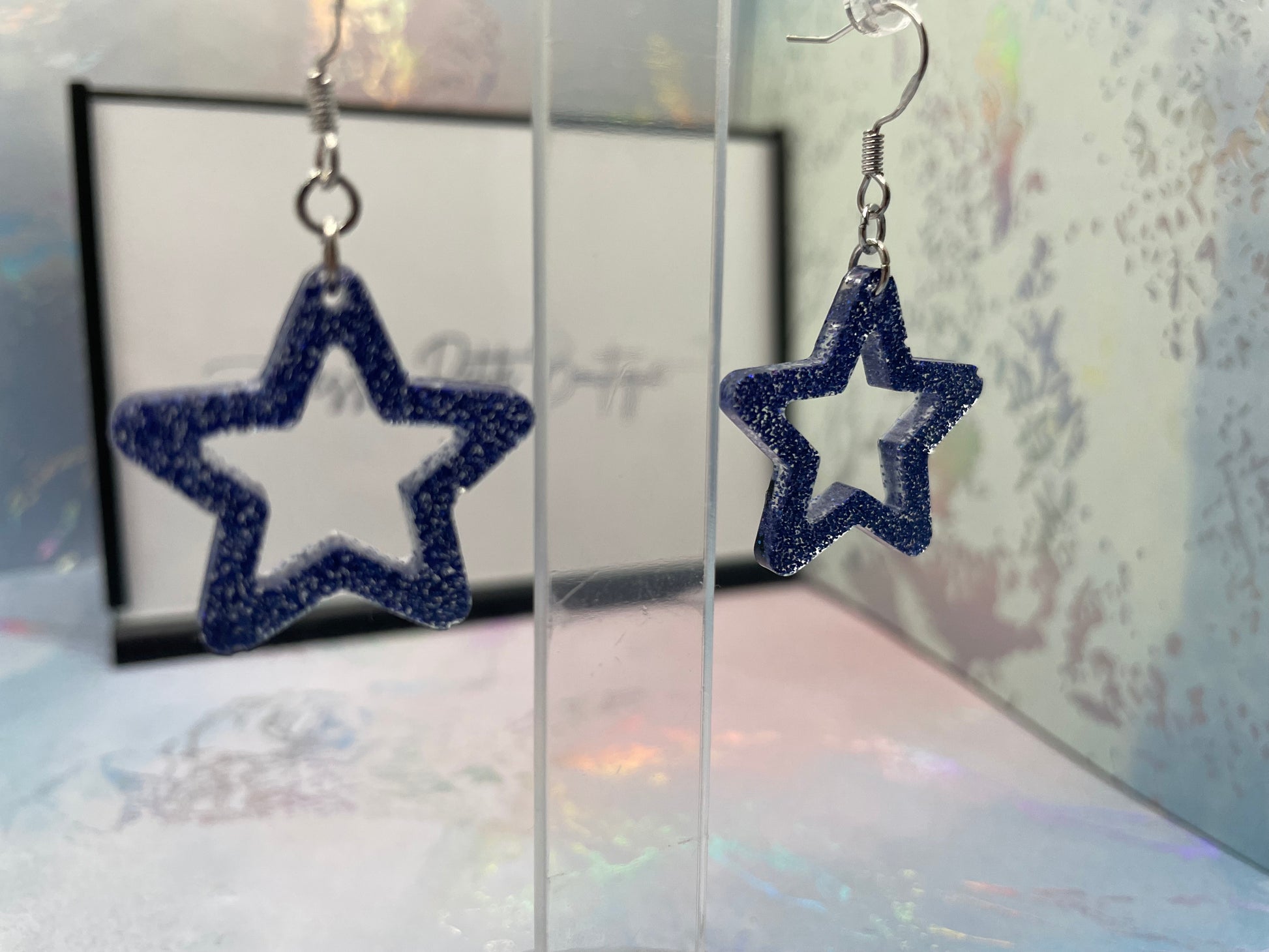 Add a celestial touch to your style with these Sparkly Blue Star Dangle Earrings. Made from resin and glitter, these earrings feature a dazzling star shape that sparkles with every movement. The bright blue hue catches the light beautifully, making these earrings a perfect statement piece. Finished with an ear wire closure, they are lightweight, durable, and comfortable for all-day wear.