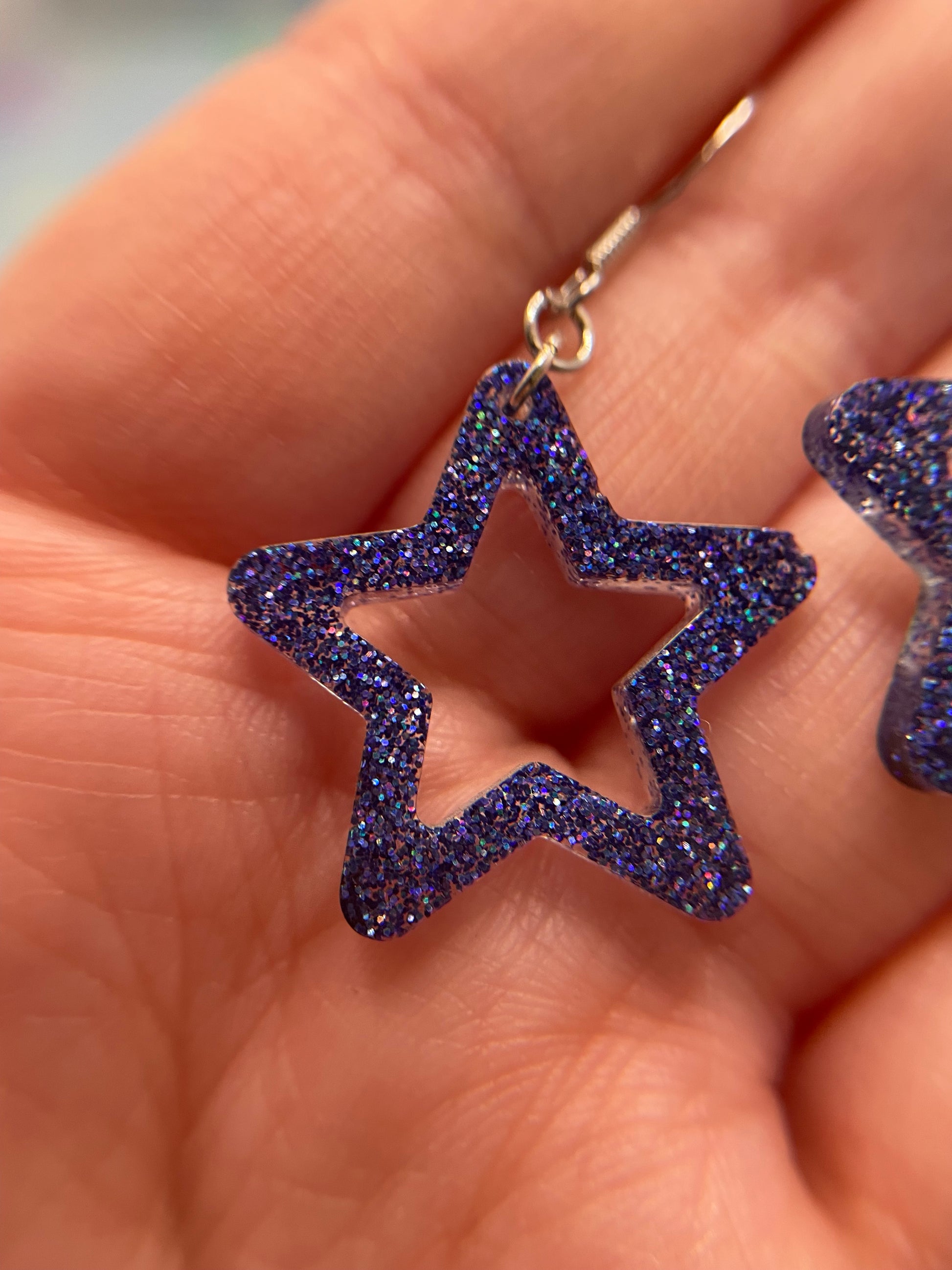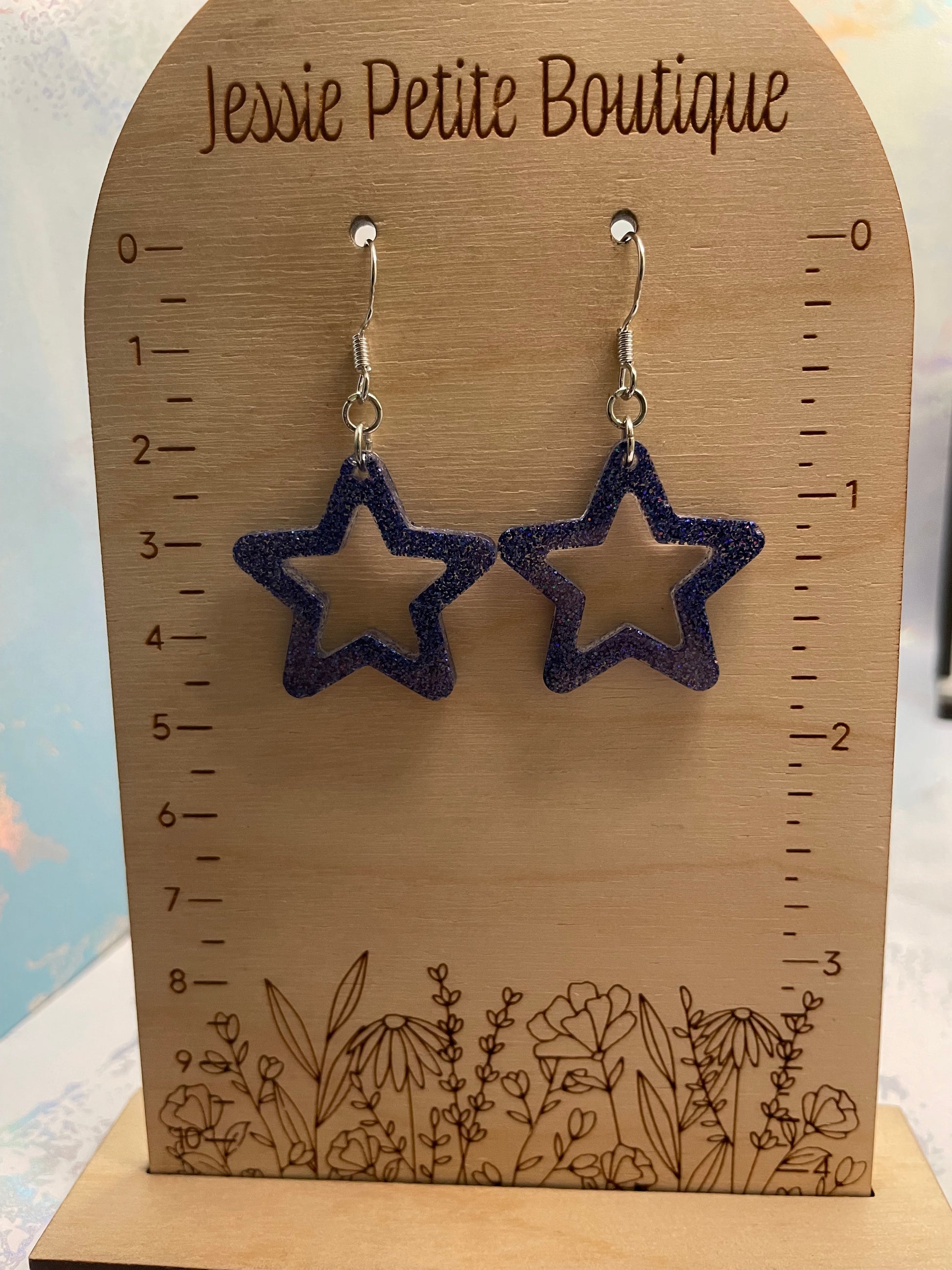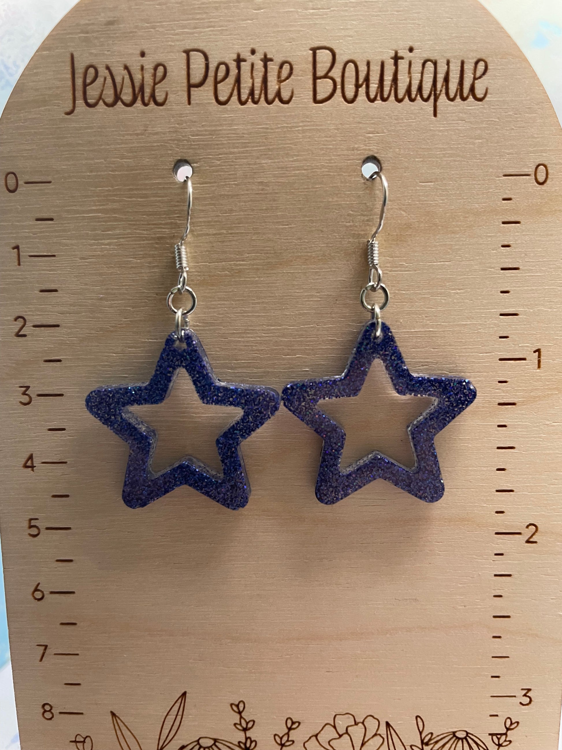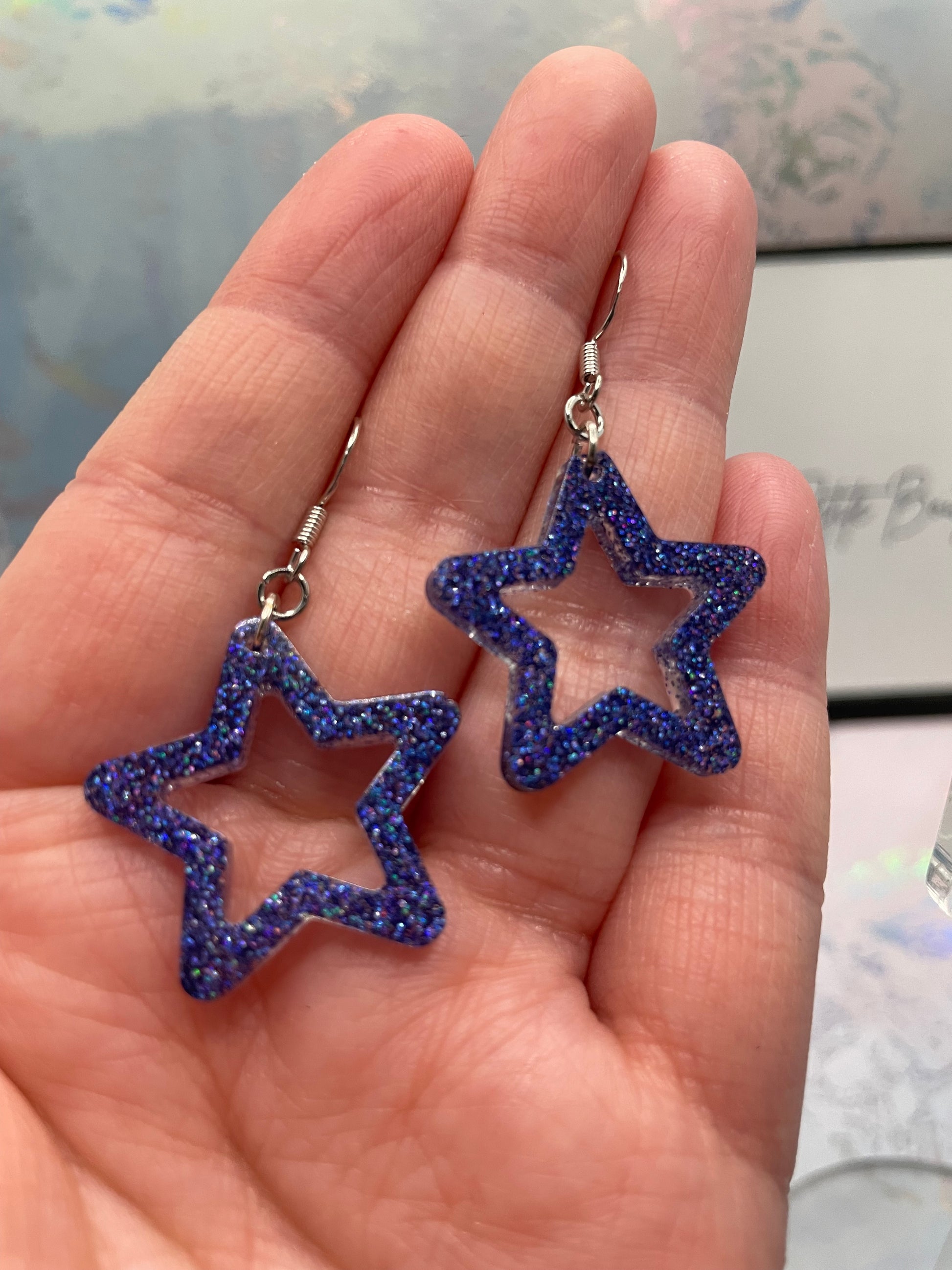 Add a celestial touch to your style with these Sparkly Blue Star Dangle Earrings. Made from resin and glitter, these earrings feature a dazzling star shape that sparkles with every movement. The bright blue hue catches the light beautifully, making these earrings a perfect statement piece. Finished with an ear wire closure, they are lightweight, durable, and comfortable for all-day wear.