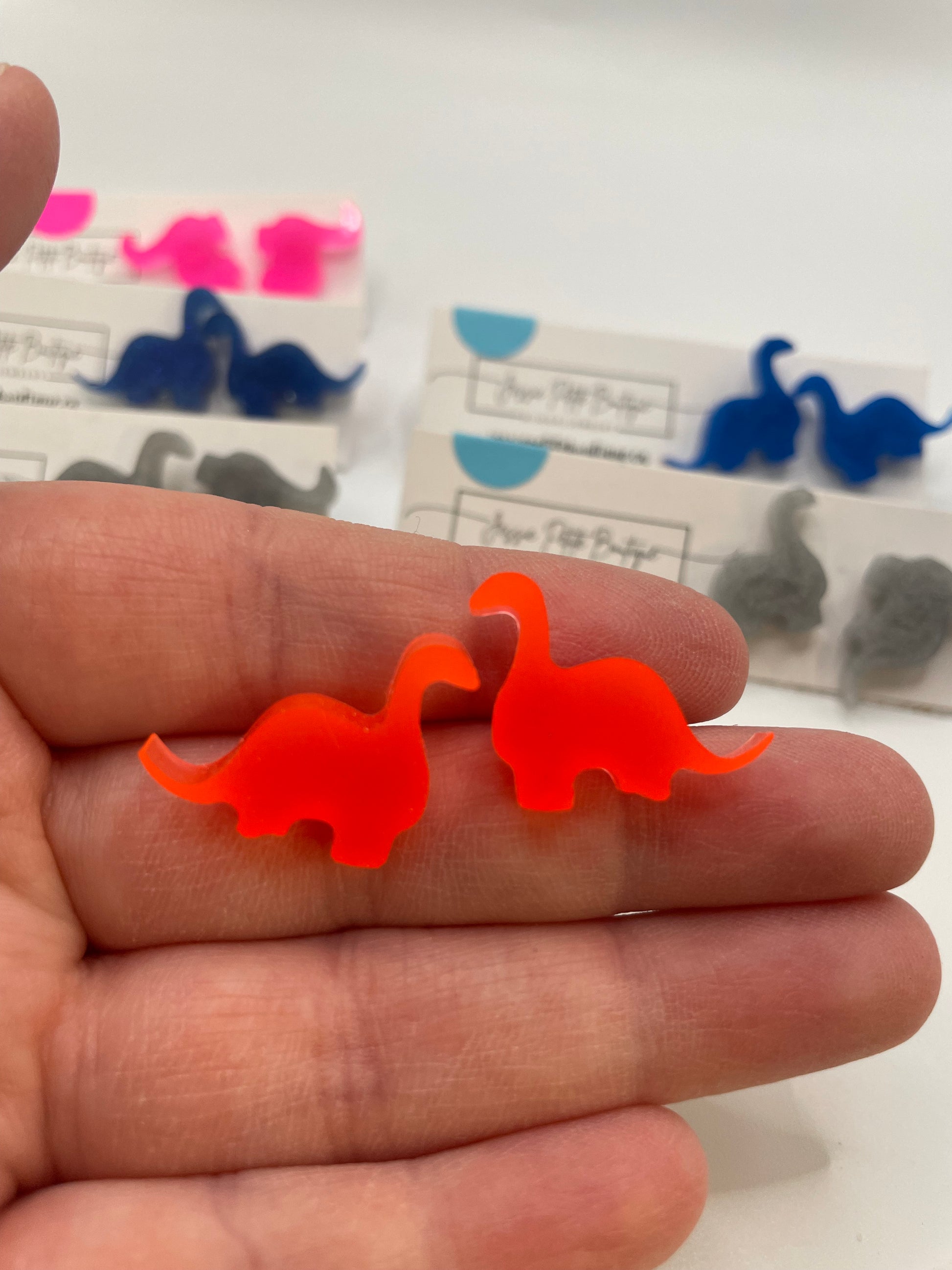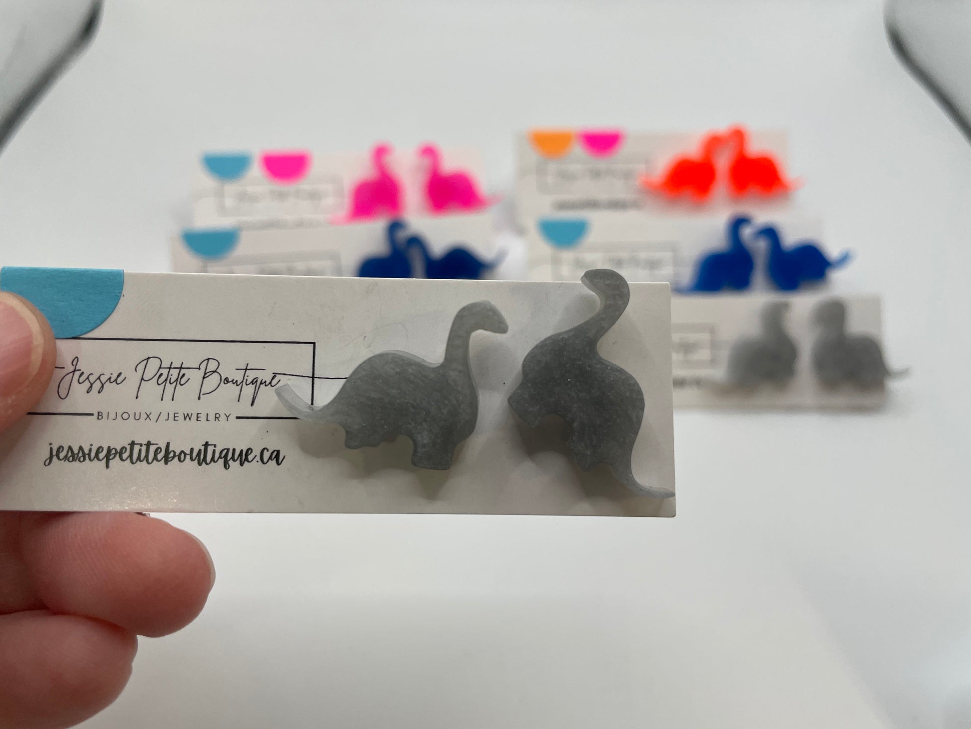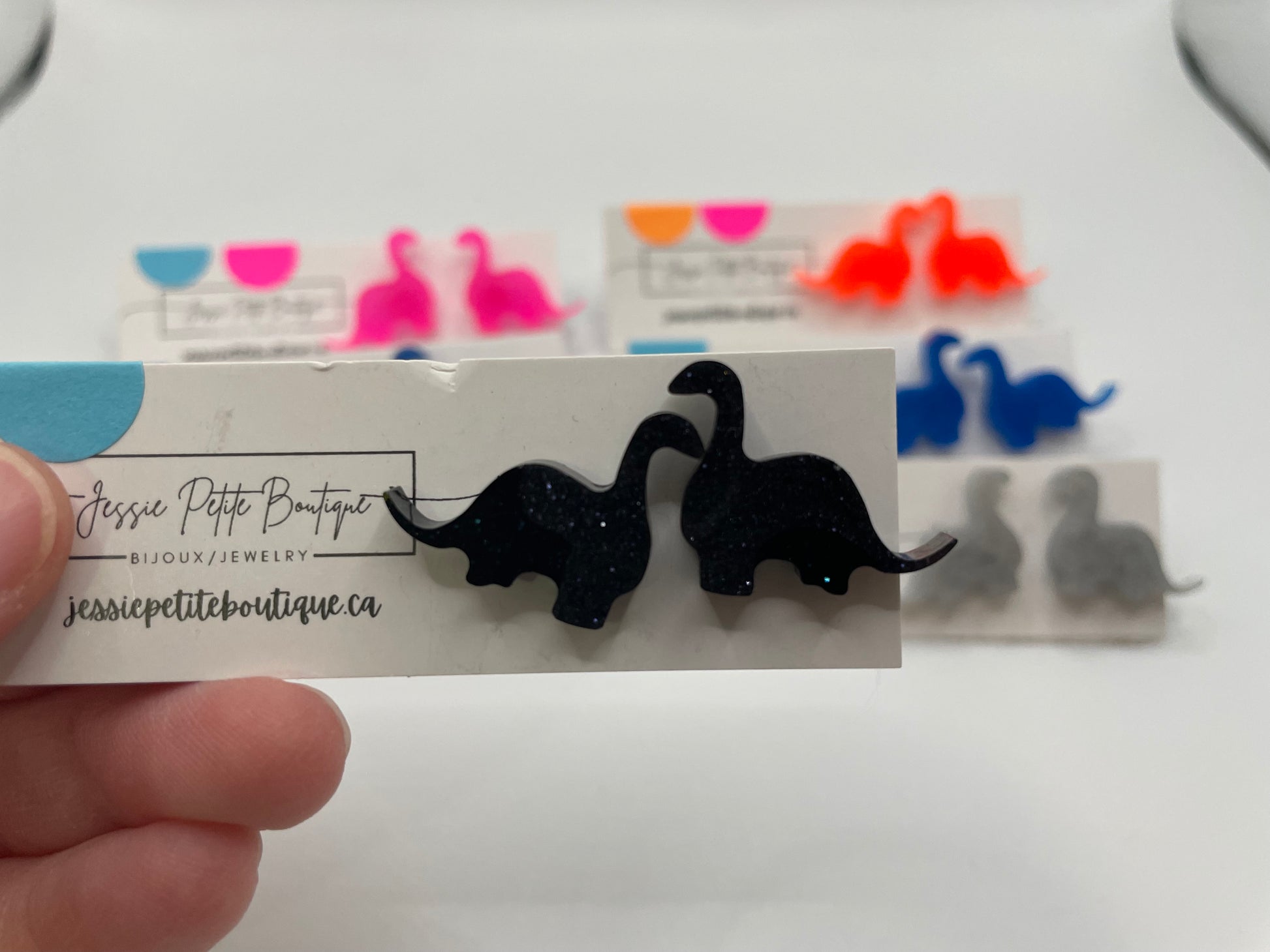 Fun, bold, and full of personality — these handmade dinosaur stud earrings are sure to brighten any outfit, day or night! Crafted from resin and mica powder, they’re available in five playful colors, including a glow-in-the-dark version that lights up softly after dark. Each pair is lightweight and comfortable, with two closure options to suit your needs: regular nickel-free or hypoallergenic plastic studs.