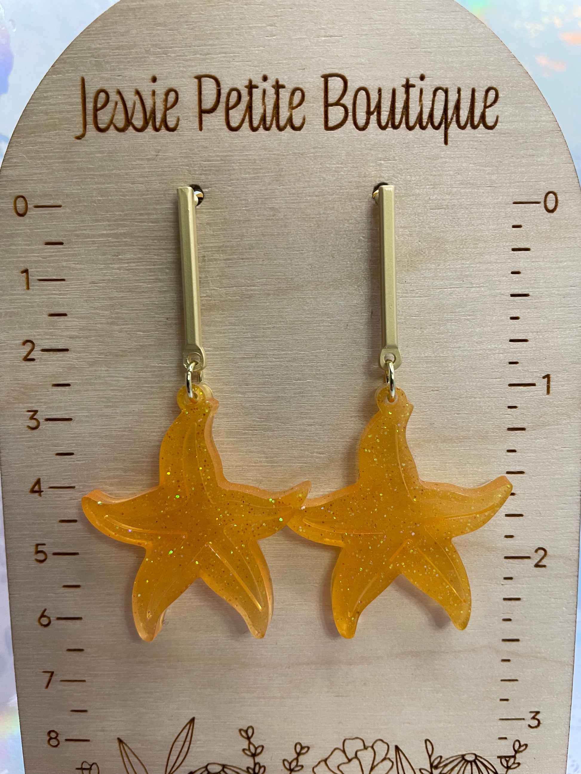 Add a touch of sparkle and seaside elegance to your jewelry collection with these Sparkly Orange Starfish Dangle Earrings. Crafted from resin, mica powder, and glitter, these earrings feature a vibrant orange hue that captures the light with every movement. The playful starfish design brings an ocean-inspired charm, while the stainless steel components ensure durability and comfort for all-day wear.