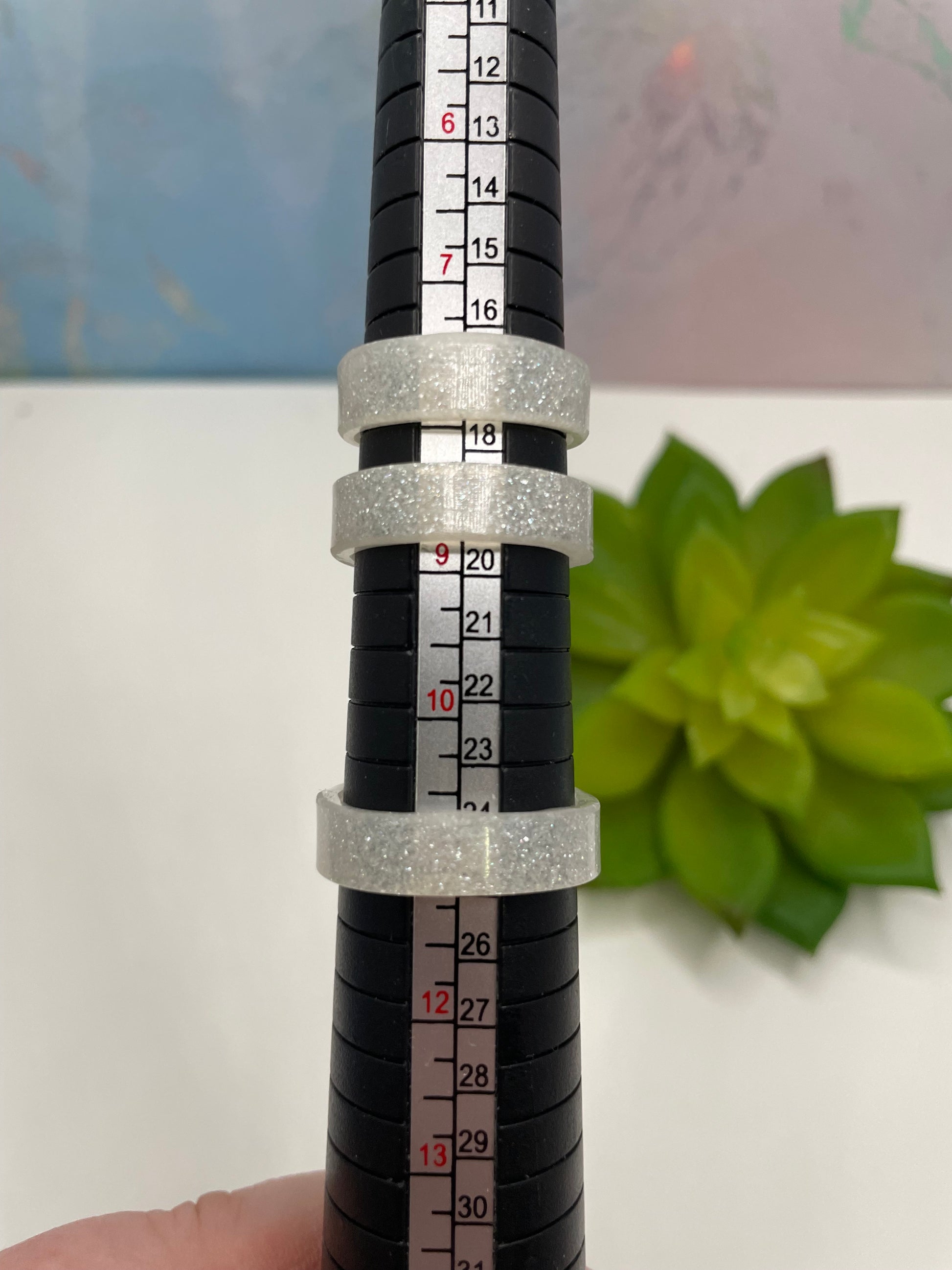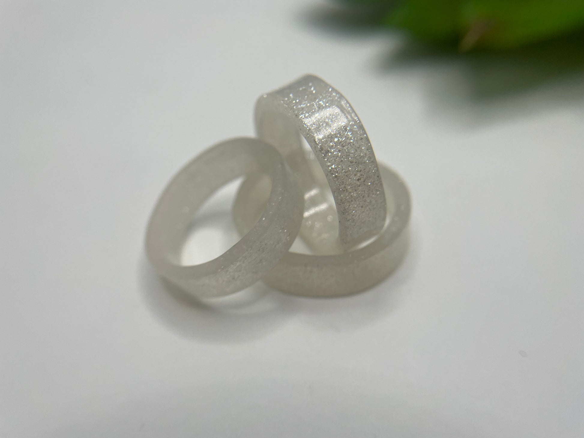 Elegant and luminous, this sparkly white resin ring is infused with fine glitter and mica powder for a soft, shimmering effect. Its clean band design catches the light beautifully, making it a refined yet eye-catching accessory for everyday wear or special occasions.
