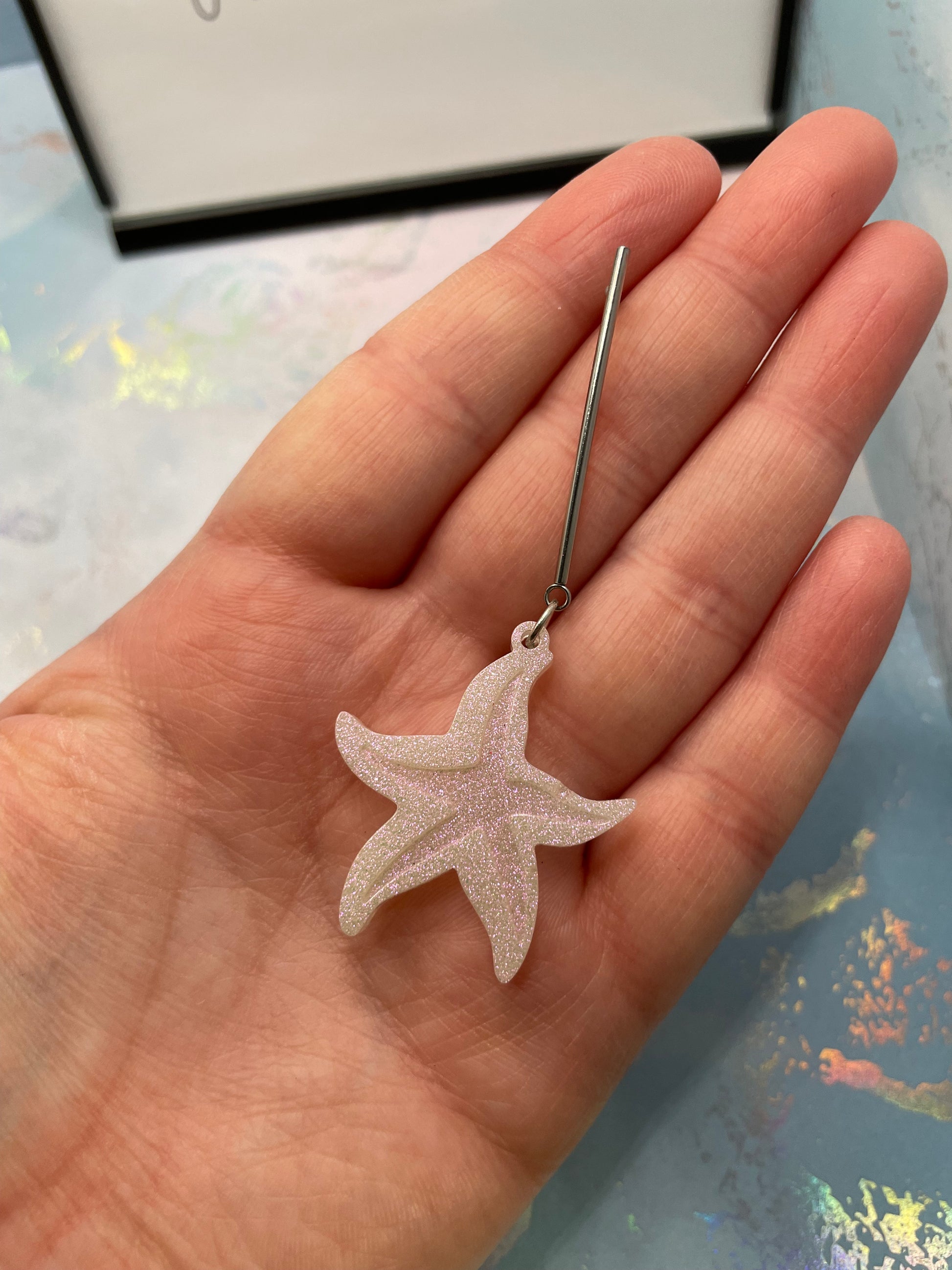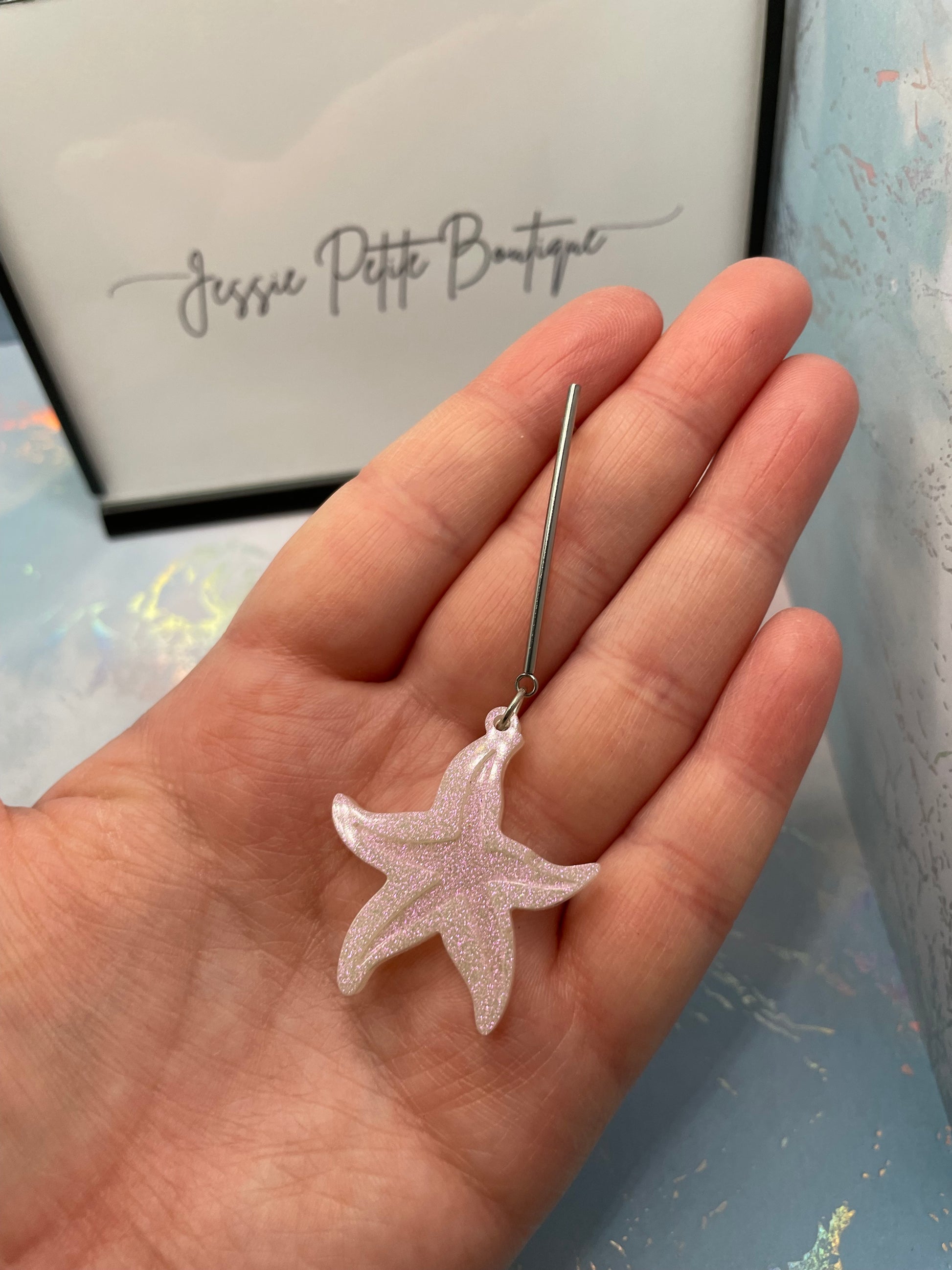 These stunning starfish-shaped earrings are designed with sparkly white resin, creating a shimmering effect. Perfect for adding a touch of elegance and fun to your look.
