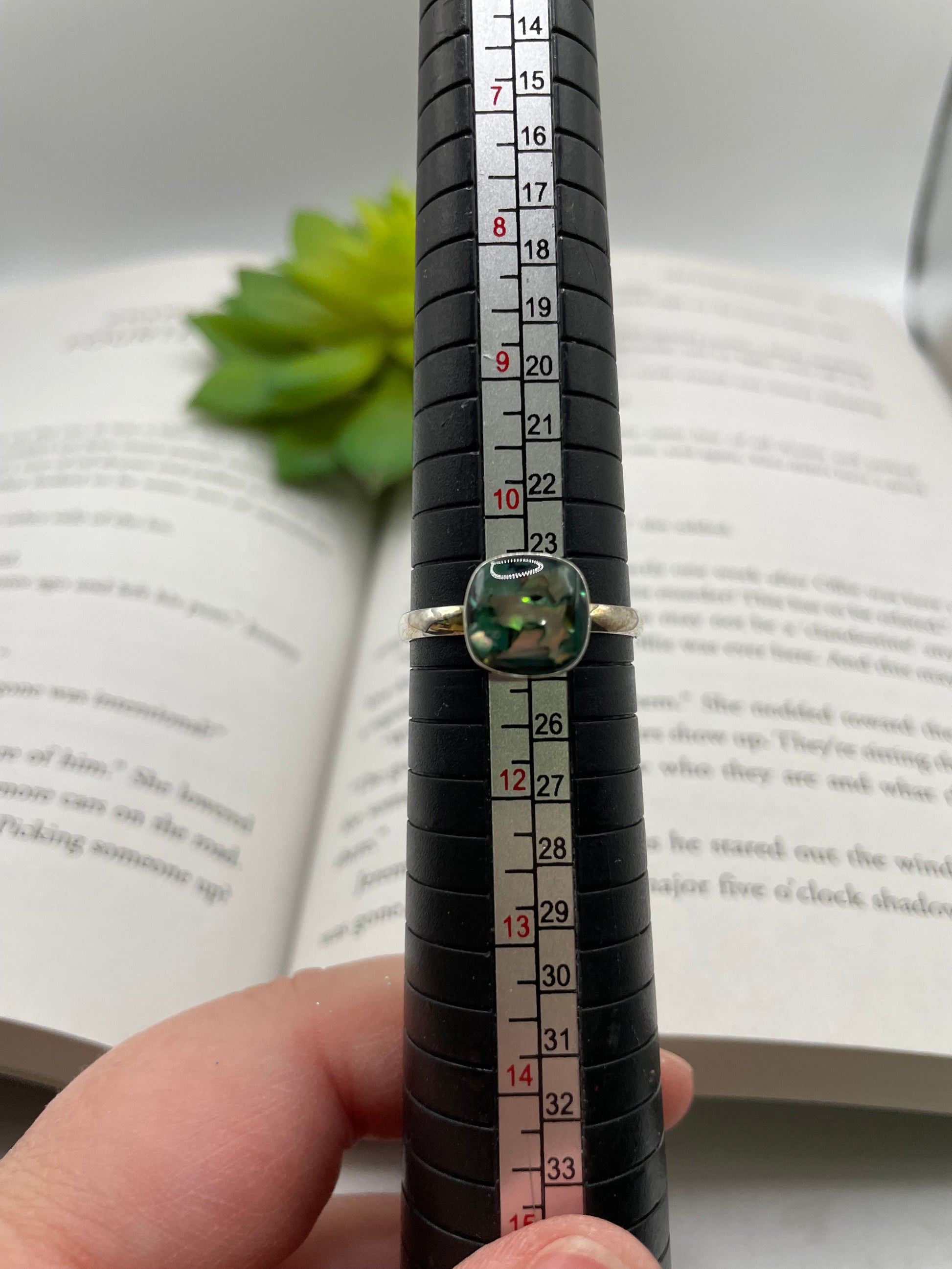 Modern and refined, this 925 sterling silver ring showcases a 1 cm square bezel filled with shimmering blue/green shell pieces encased in resin.