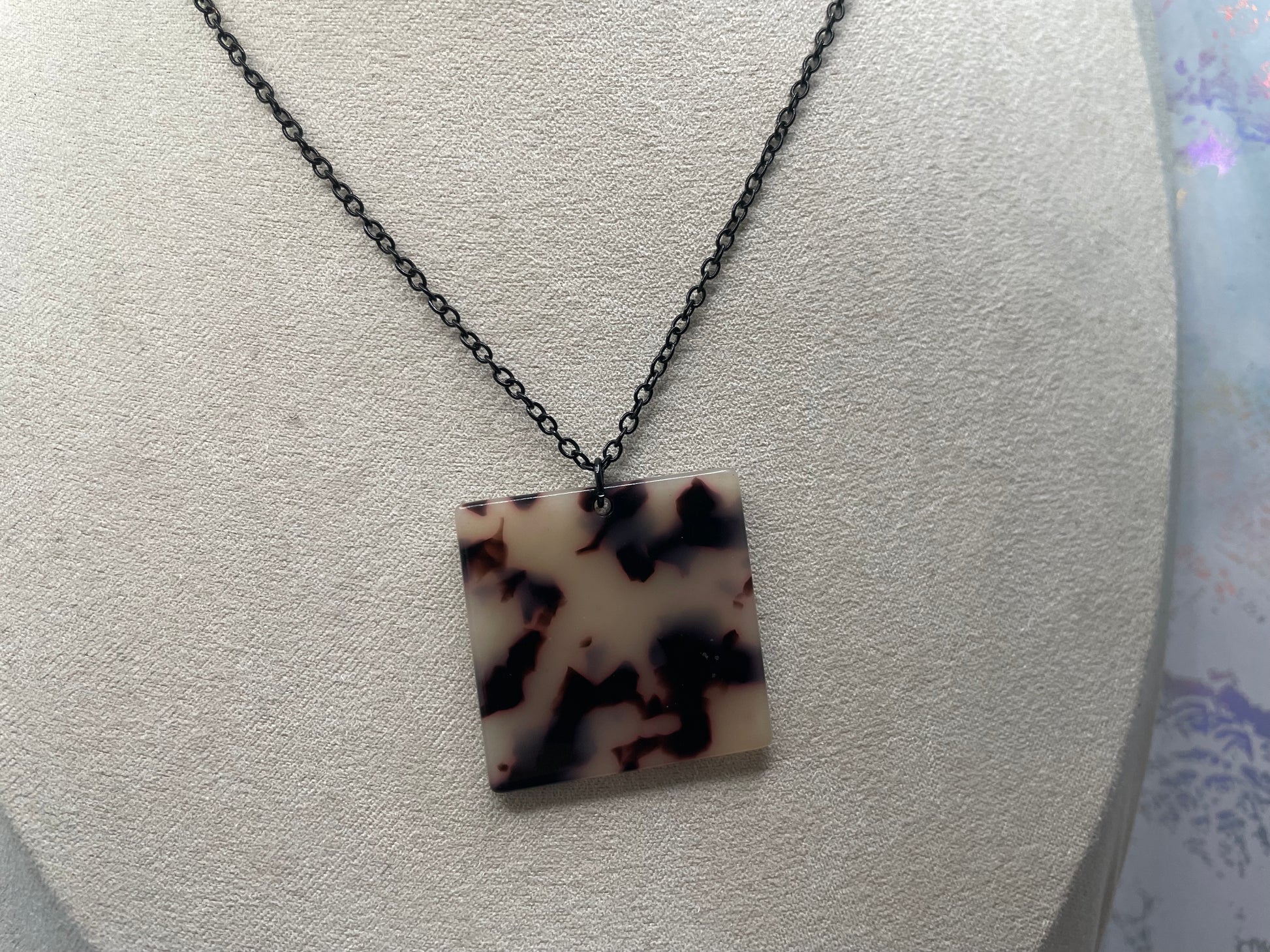 The necklace showcases a square tortoise-finish pendant suspended from a delicate chain, while the coordinating earrings complete the set with a balanced and cohesive look.