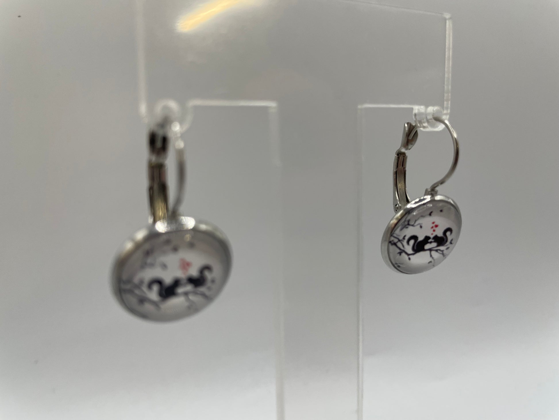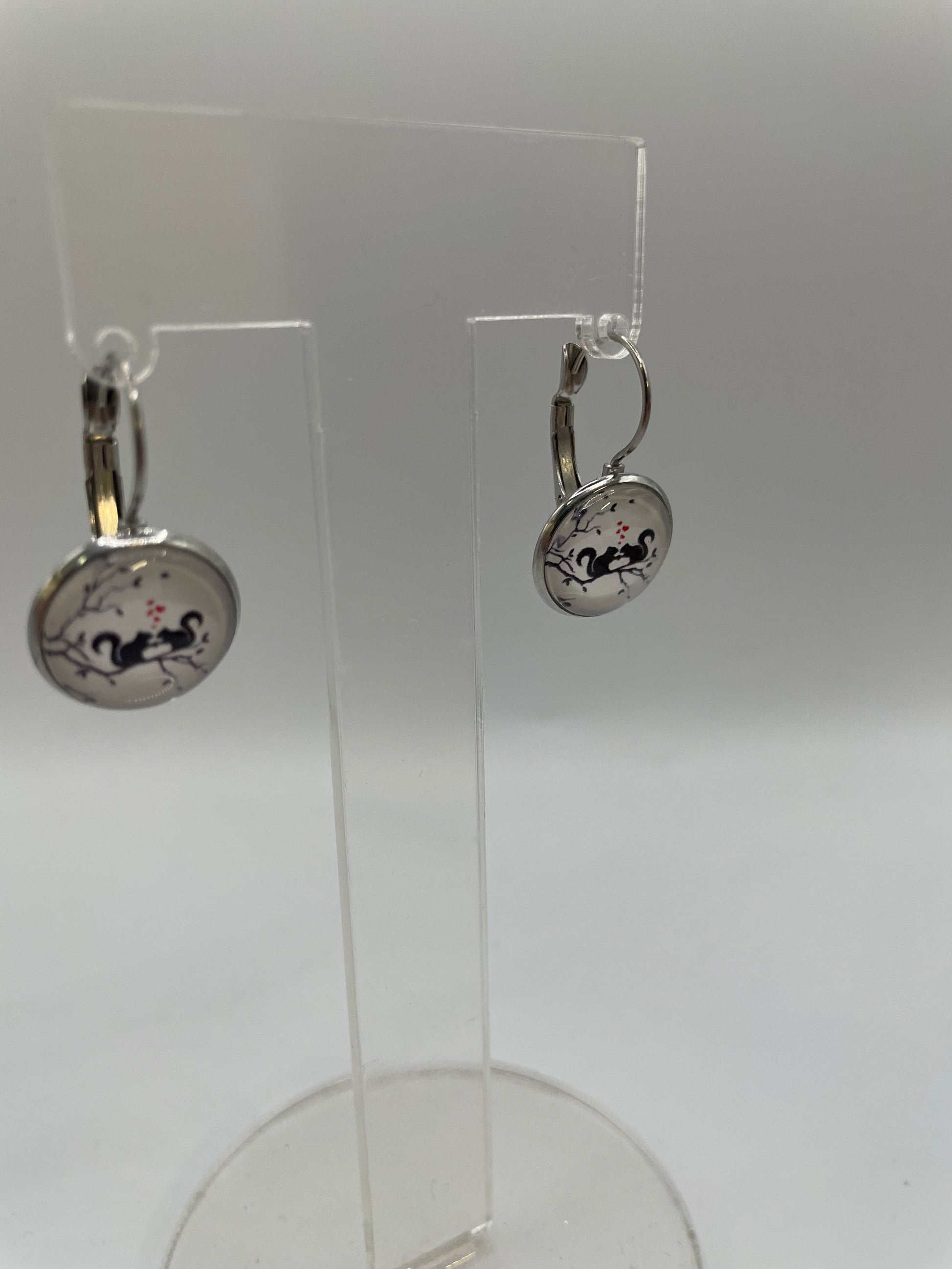 Add a charming touch to your style with these leverback earrings featuring a delicate black squirrel design perched on tree branches with subtle red hearts. The glossy round cabochon captures the scene beautifully, giving these earrings a whimsical yet elegant look.