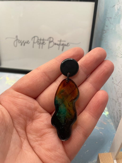 Bold and artistic, these abstract organic-shaped earrings feature a stunning swirl of green, yellow, blue, and black tones — a one-of-a-kind blend that looks like wearable art. Each pair is handcrafted, ensuring that no two are ever exactly alike.