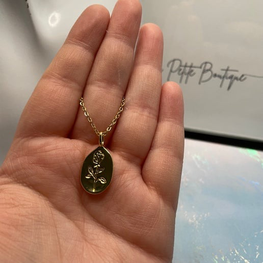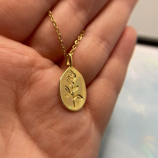 This elegant necklace features an oval-shaped gold-plated pendant with a delicate stamped rose design, giving it a classic and refined look. The pendant is suspended from a 20-inch plated gold chain, ensuring a comfortable and graceful fit. Made with stainless steel materials, it's suitable for sensitive skin.