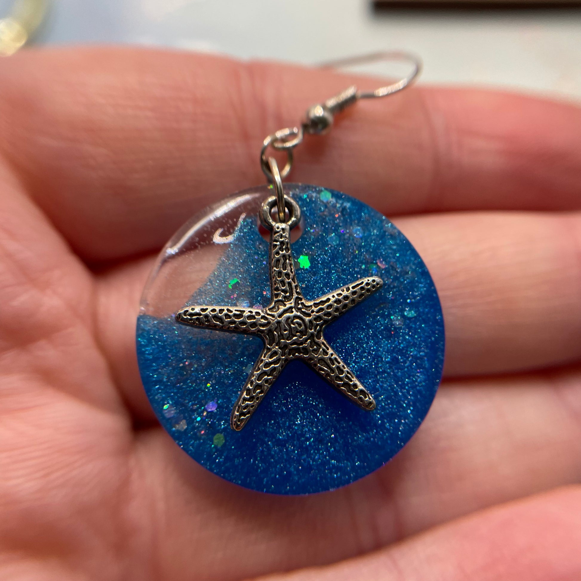 Dive into elegance with these enchanting Starfish on Ocean Earrings, featuring a captivating blend of sparkly blue, clear resin, and silver starfish charms. The circular design evokes a serene oceanic vibe, enhanced by the glittery details and vibrant colours. Crafted with resin, mica powder, glitter, and durable alloy, these earrings are perfect for adding a touch of the sea to any outfit.