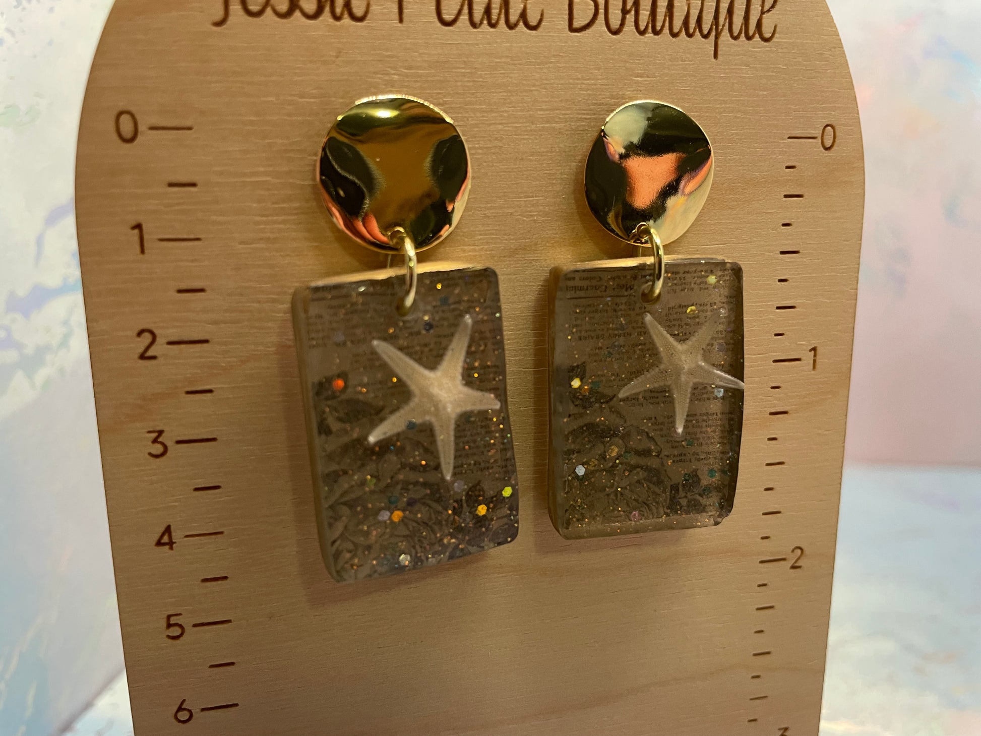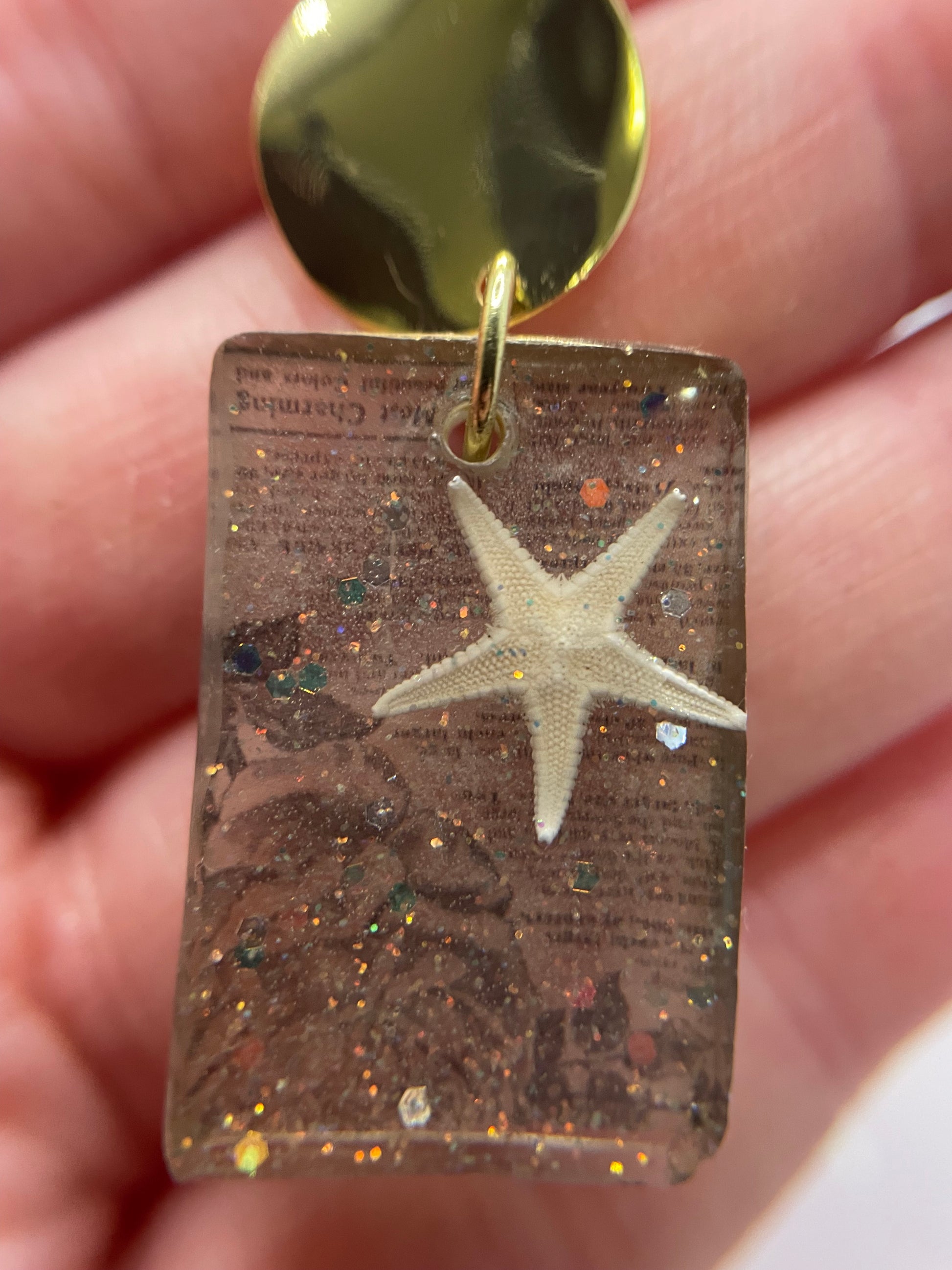 These earrings feature a sleek rectangular resin drop paired with a smooth round gold-tone stud, creating a balanced and modern silhouette. Each rectangle showcases a delicate embedded starfish layered over subtle printed paper details, accented with fine shimmering elements for added depth and texture.