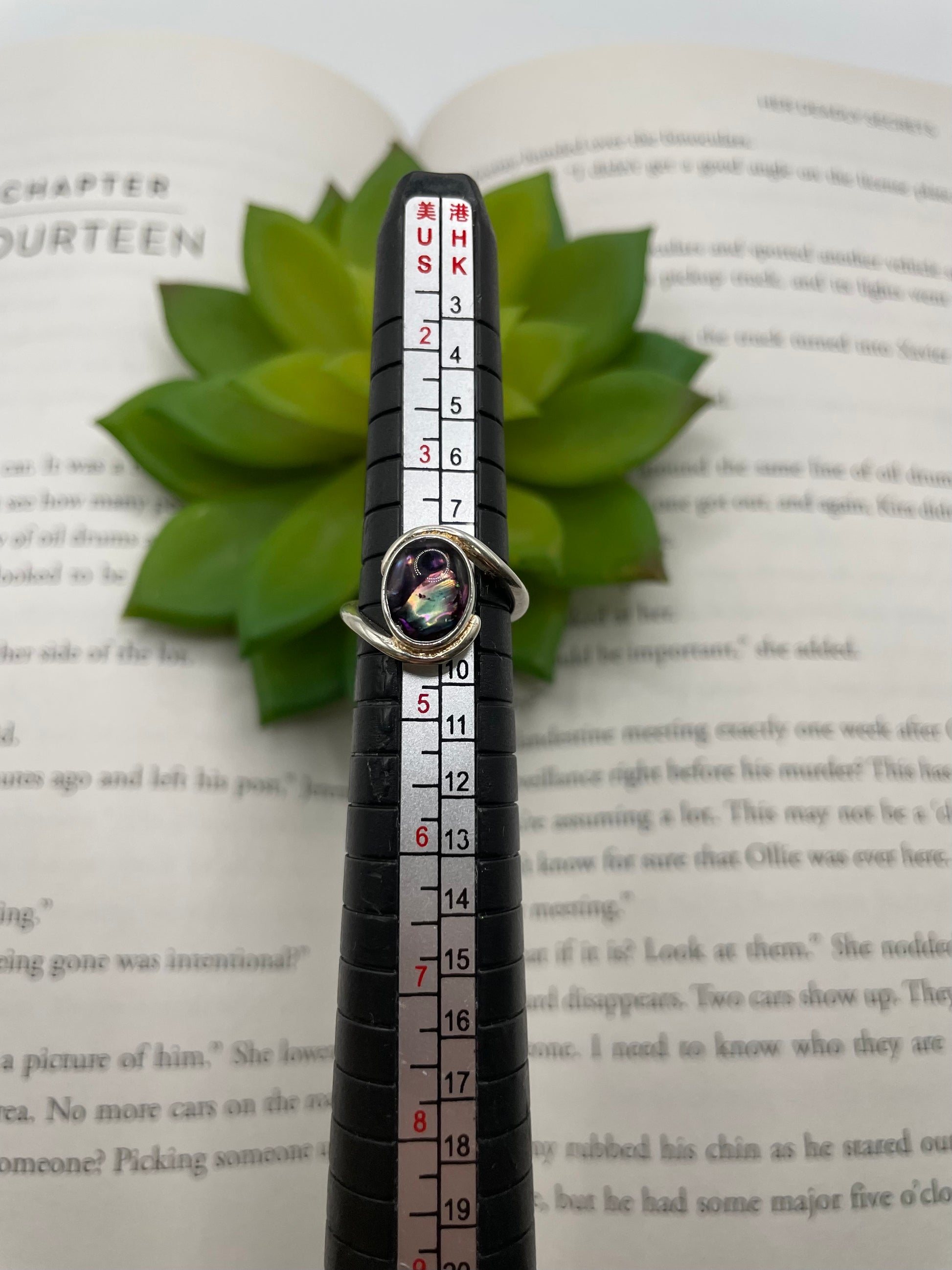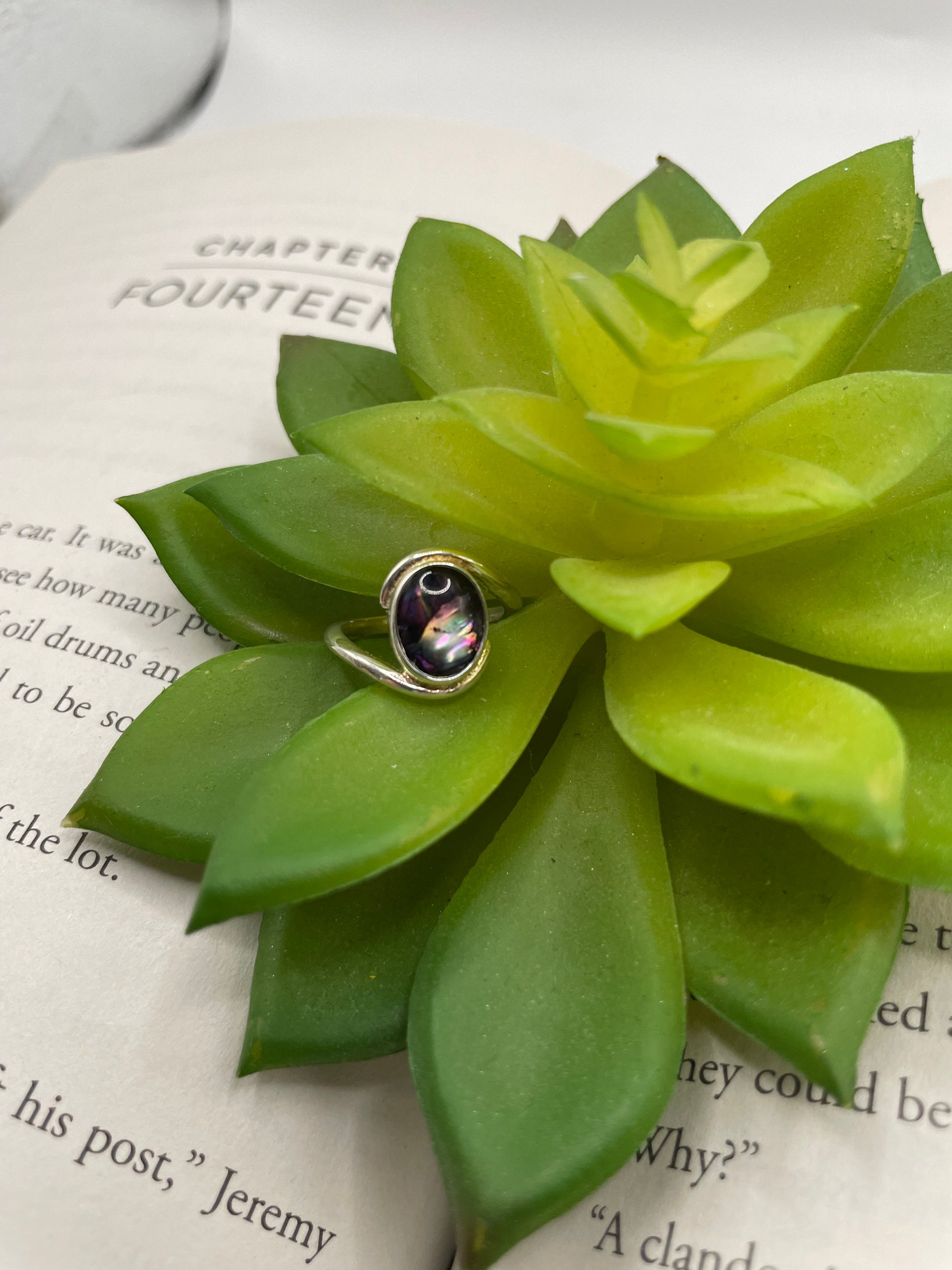 Delicate and luminous, this 925 sterling silver ring features a captivating shell cabochon that reflects subtle iridescent shades of purple, green, and pink. Its graceful swirl setting enhances the natural beauty of the shell, creating a timeless piece that’s both modern and refined.