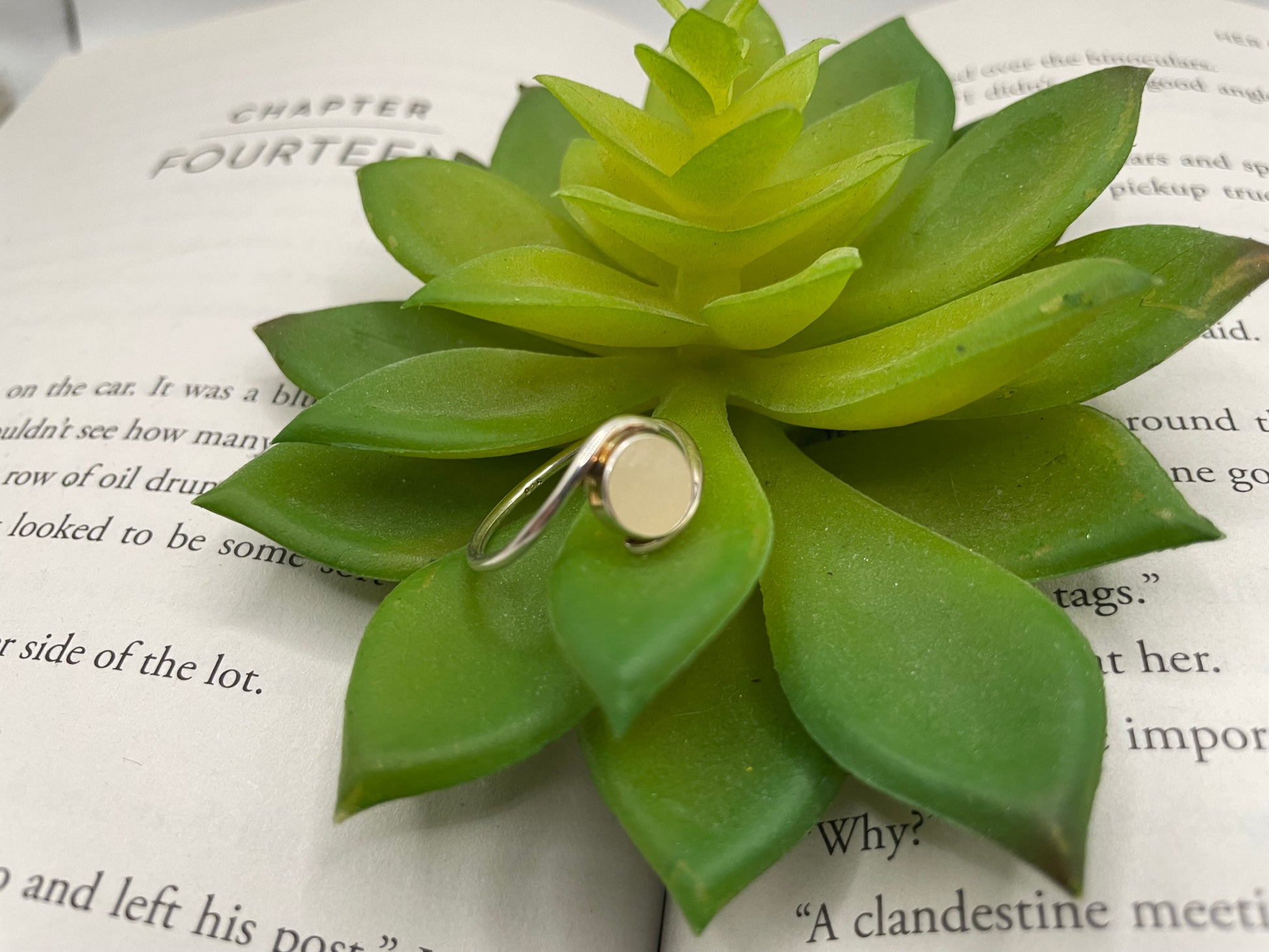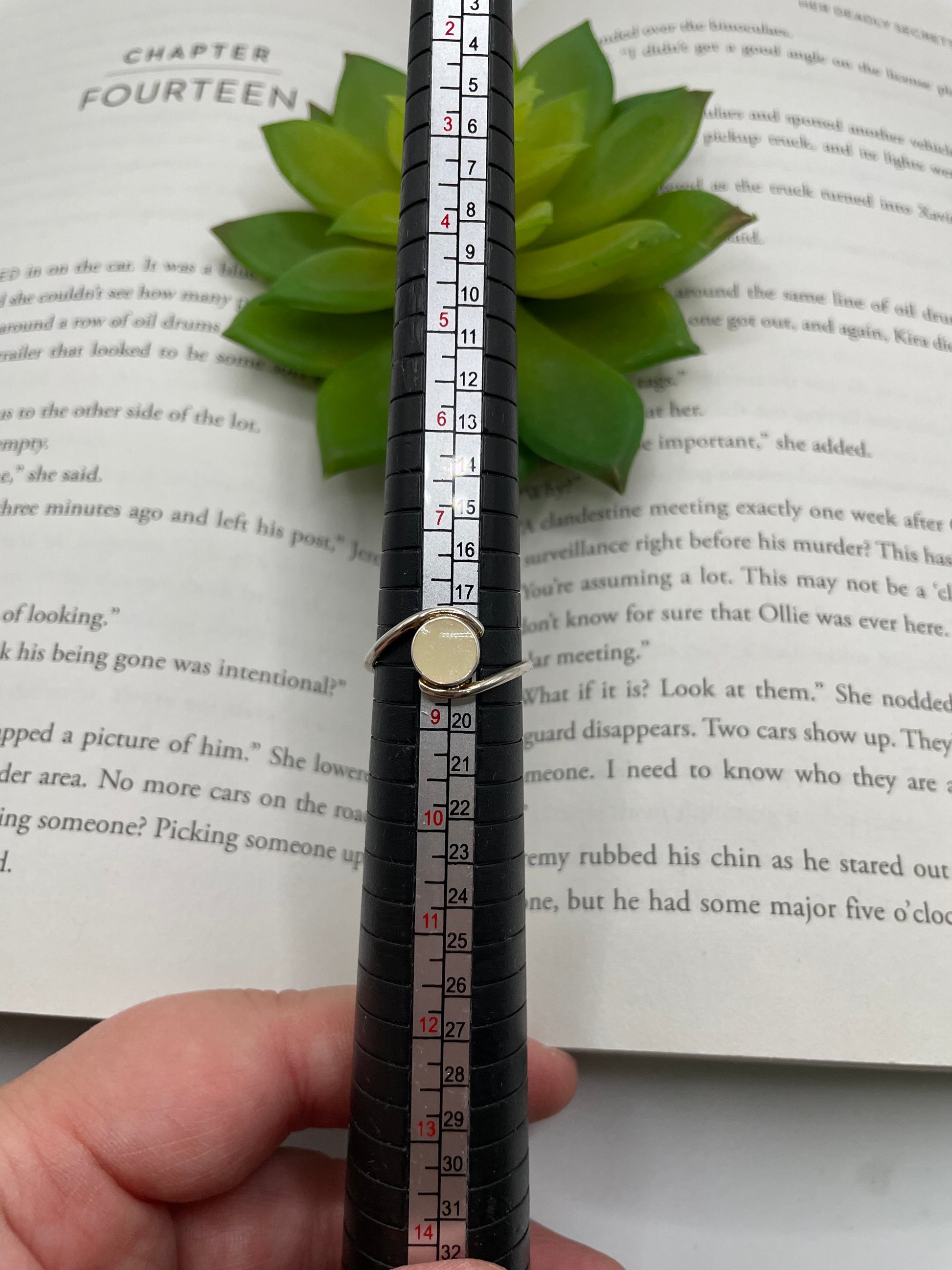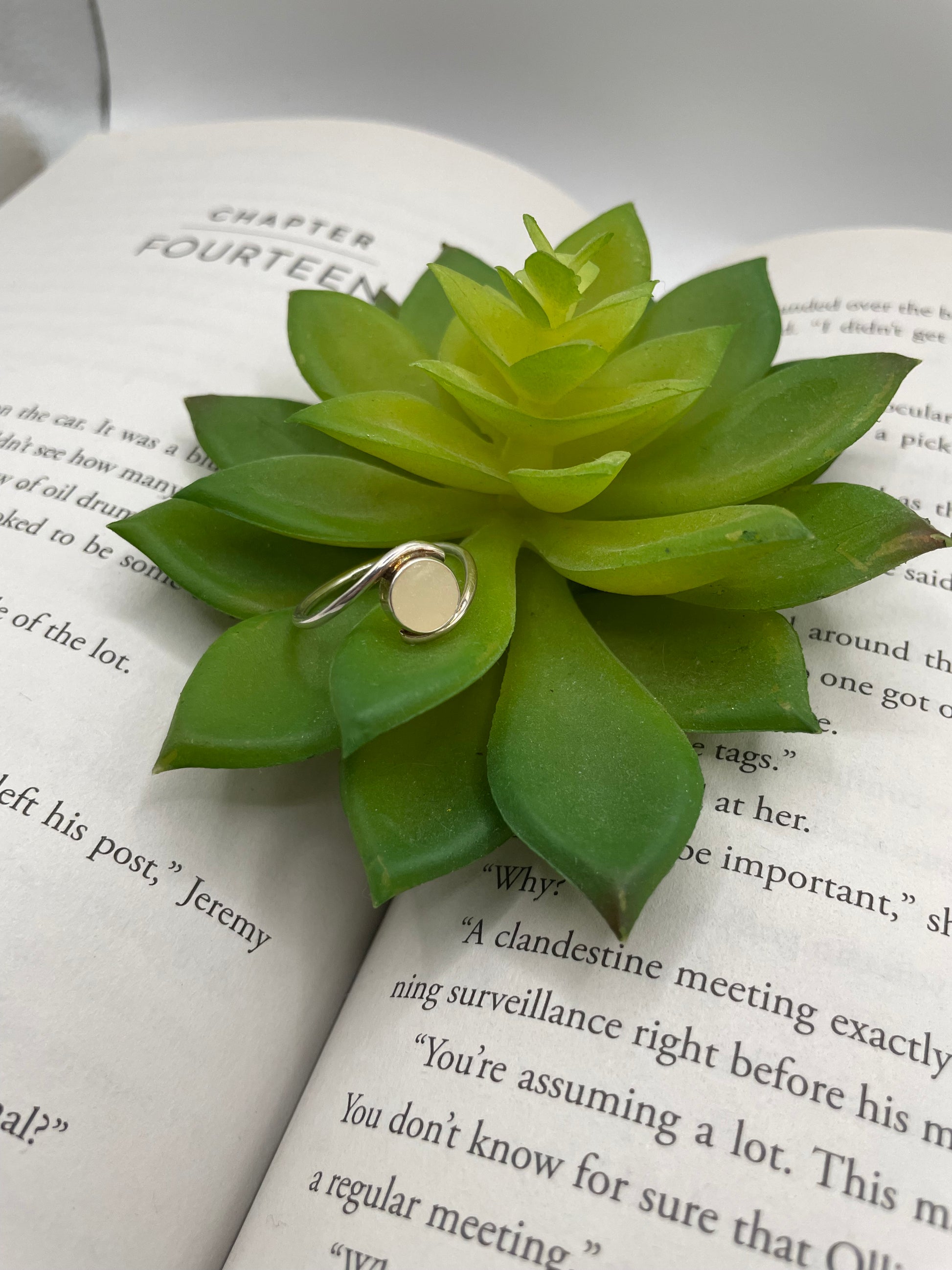Modern and elegant, this 925 sterling silver ring features a 7×7 mm round bezel filled with white resin and fine glitter, creating a subtle, luminous shine that catches the light beautifully. Its sleek, curved band adds a refined and contemporary touch, perfect for everyday wear or stacking with other rings.