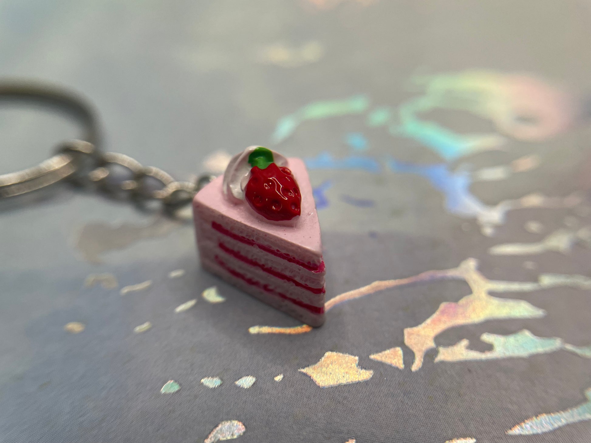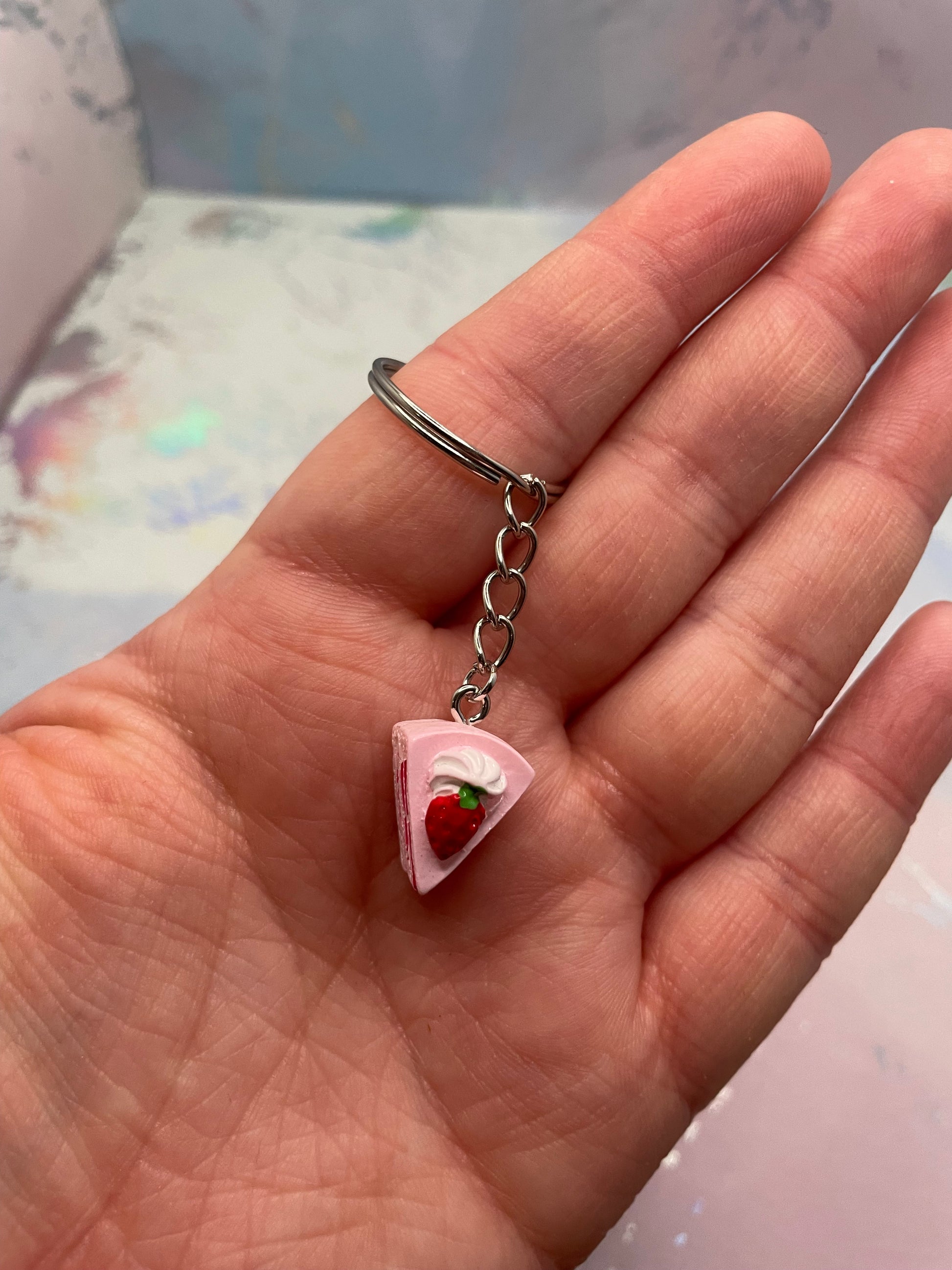 Add a sweet touch to your everyday essentials with this adorable strawberry cake slice keychain. Designed to resemble a delicate layered dessert, it features soft pink cake layers, detailed strawberry filling, and a charming topping with a strawberry and whipped cream accent.