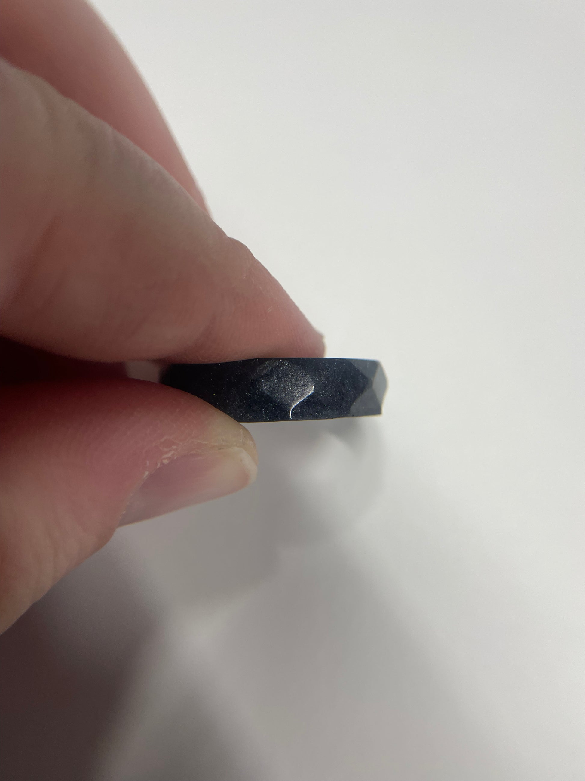 This handcrafted black resin ring features a textured, faceted surface that subtly reflects the light. Accented with mica powder and fine glitter, it offers a discreet shimmer while maintaining a bold, modern look.