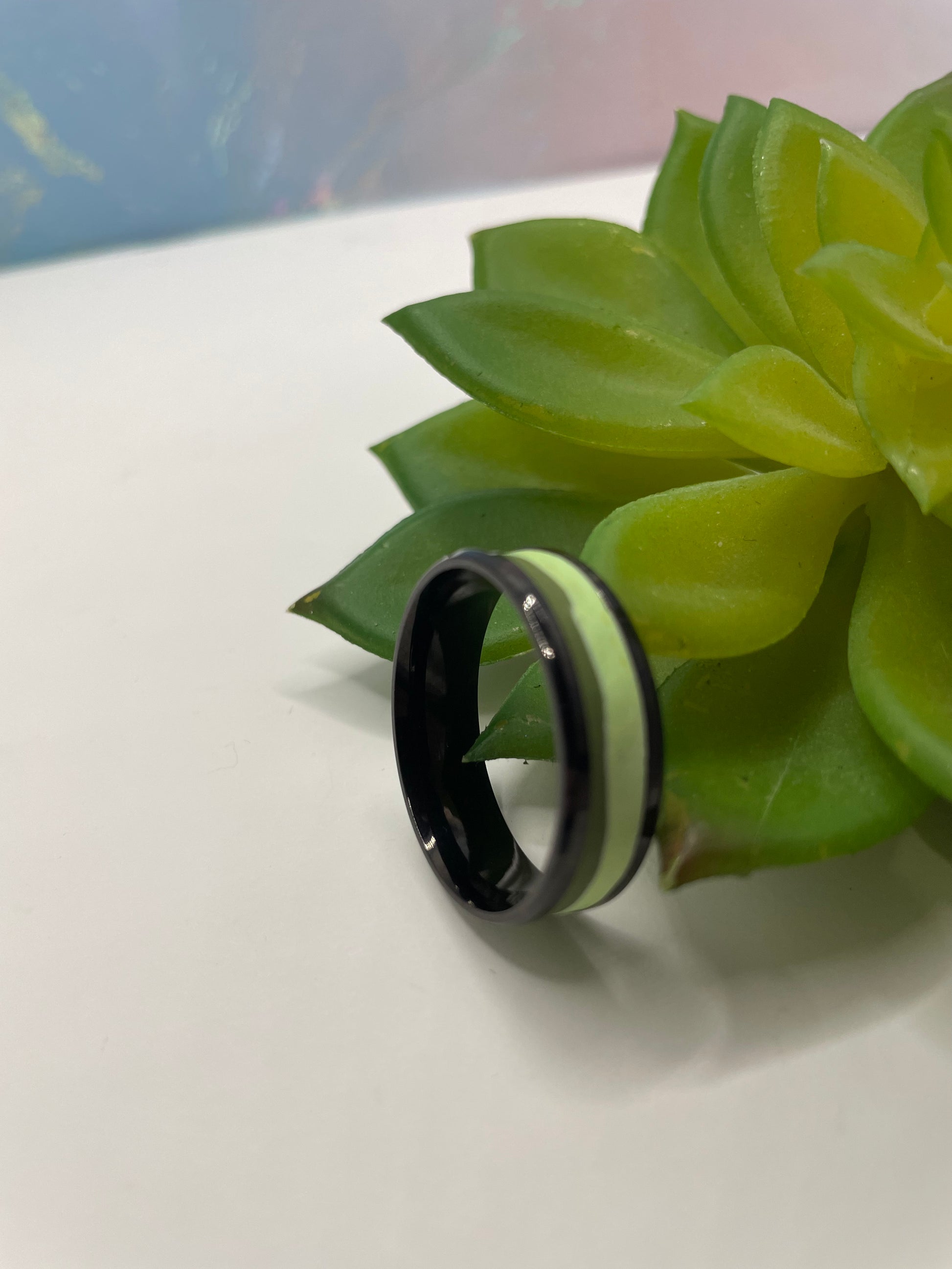 This modern stainless steel ring features a striking two-tone green polymer clay inlay, framed by a sleek black finish. The layered green tones add subtle depth and character, while the smooth, polished surface ensures a comfortable everyday wear.