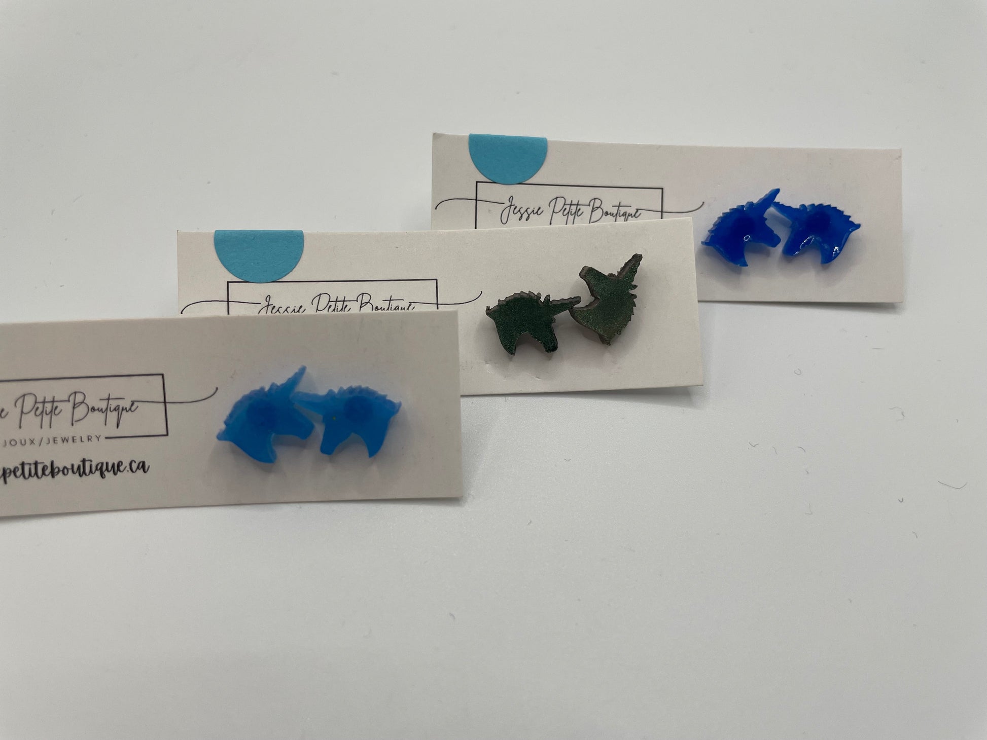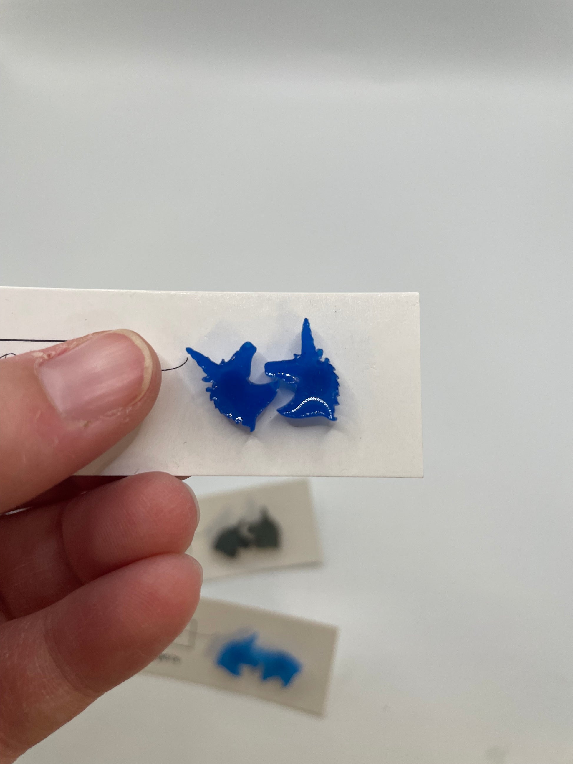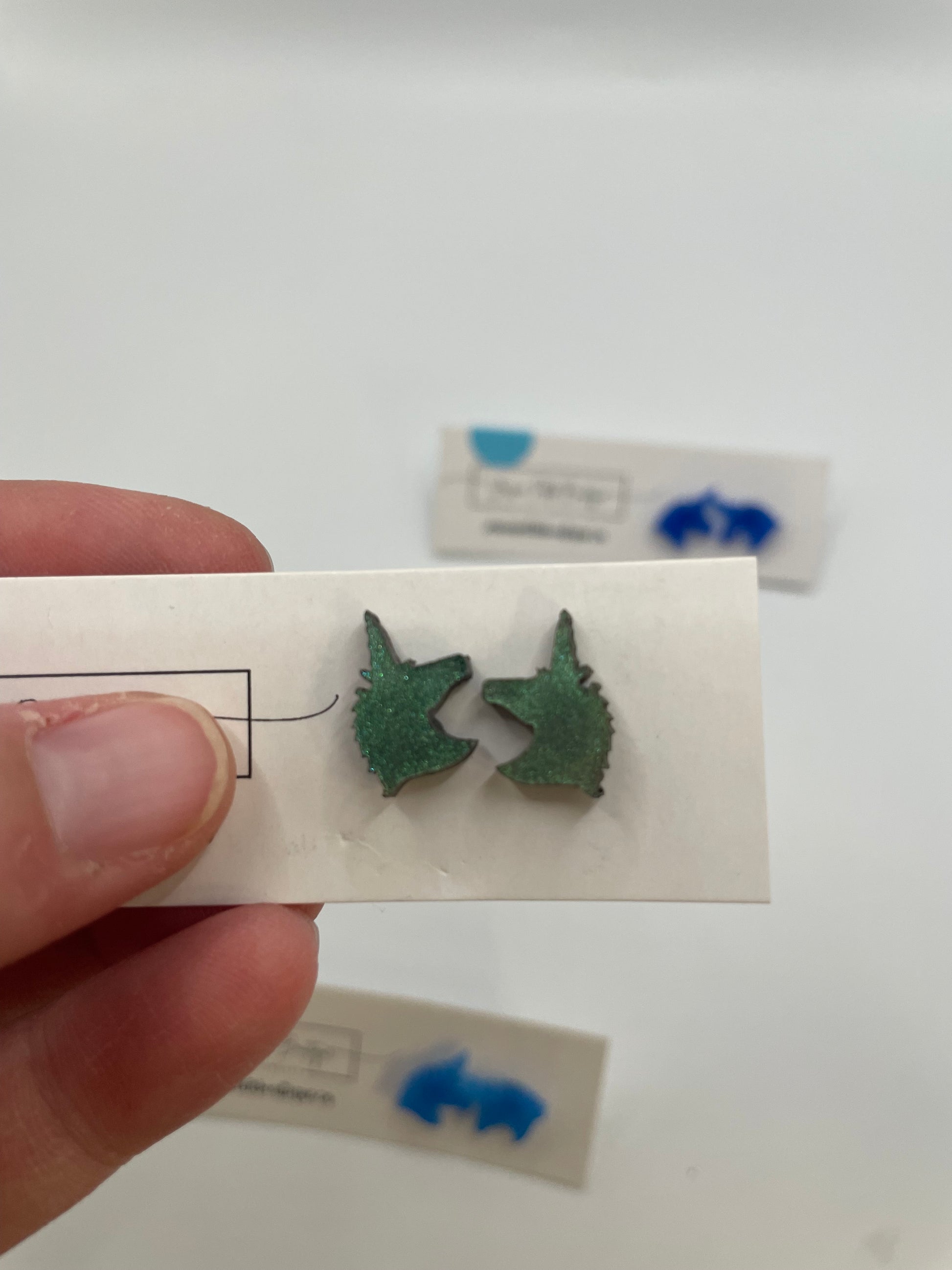 Playful and enchanting, these handmade unicorn stud earrings bring a whimsical sparkle to your style. Crafted from resin mixed with mica powder, each pair catches the light beautifully with its soft shimmer. Lightweight and nickel-free, they’re perfect for sensitive ears and comfortable enough for everyday wear. Available in three magical color options — blue, light blue, and chameleon green.