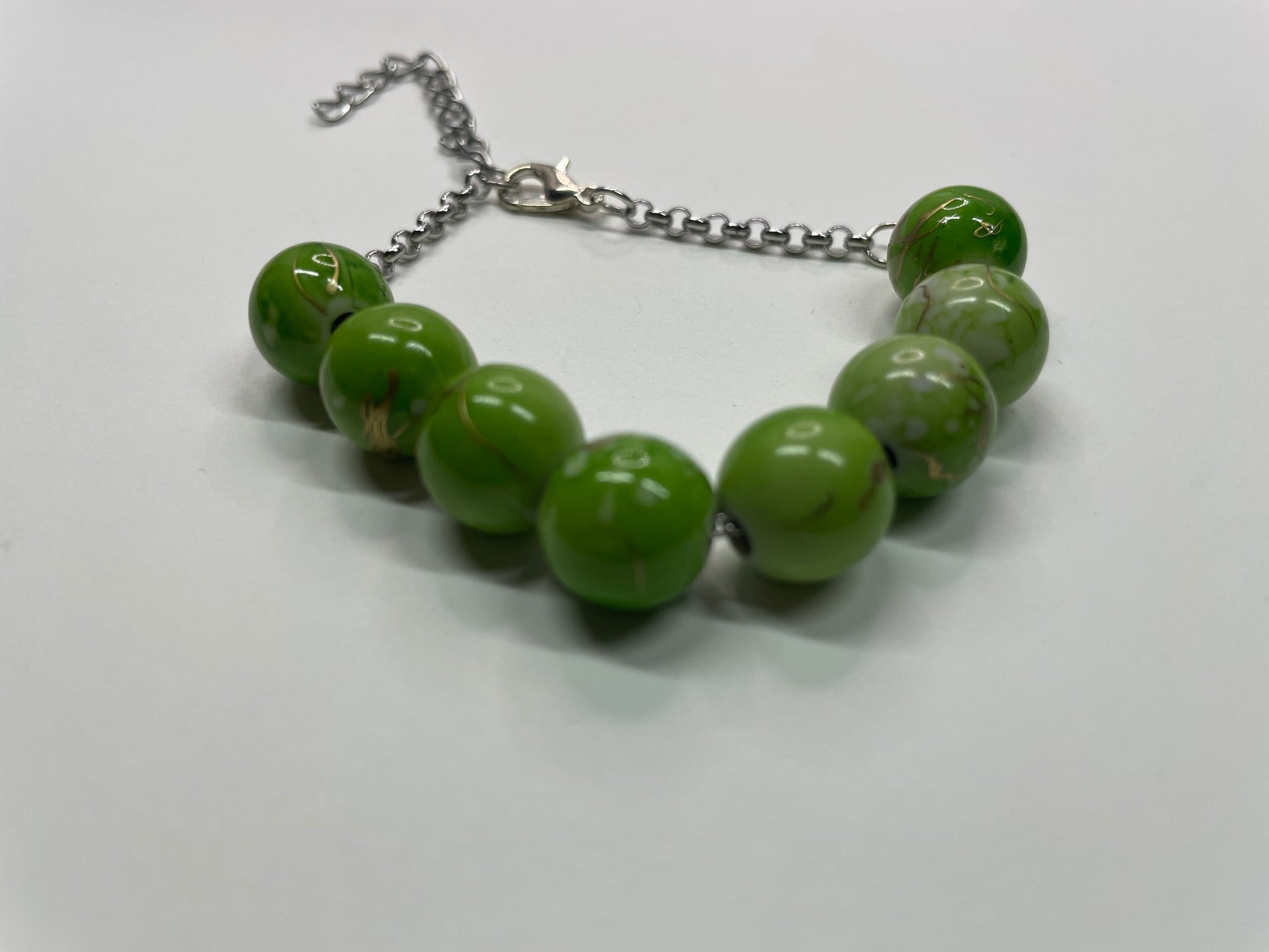 This vibrant green beaded bracelet features glossy 11 mm round beads with subtle natural-style marbling, creating a fresh and eye-catching look. The beads are beautifully aligned to form a 9 cm beaded section, balanced by a stainless steel chain for durability and everyday comfort.