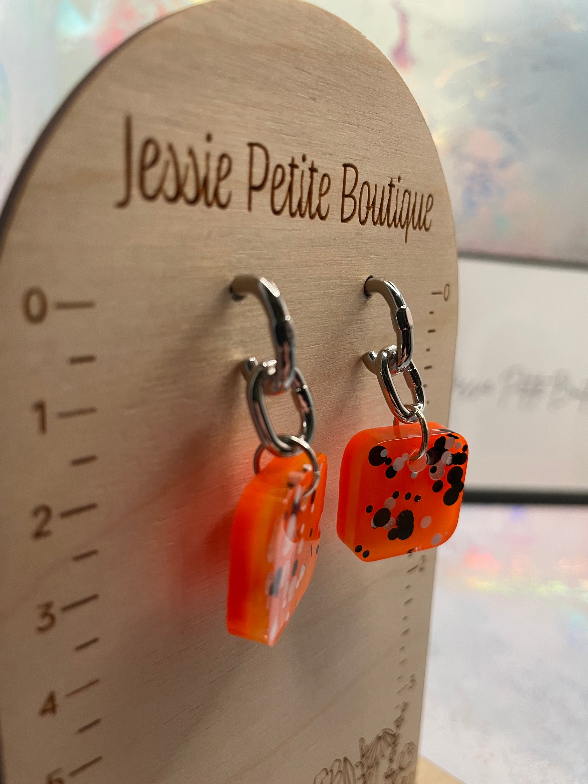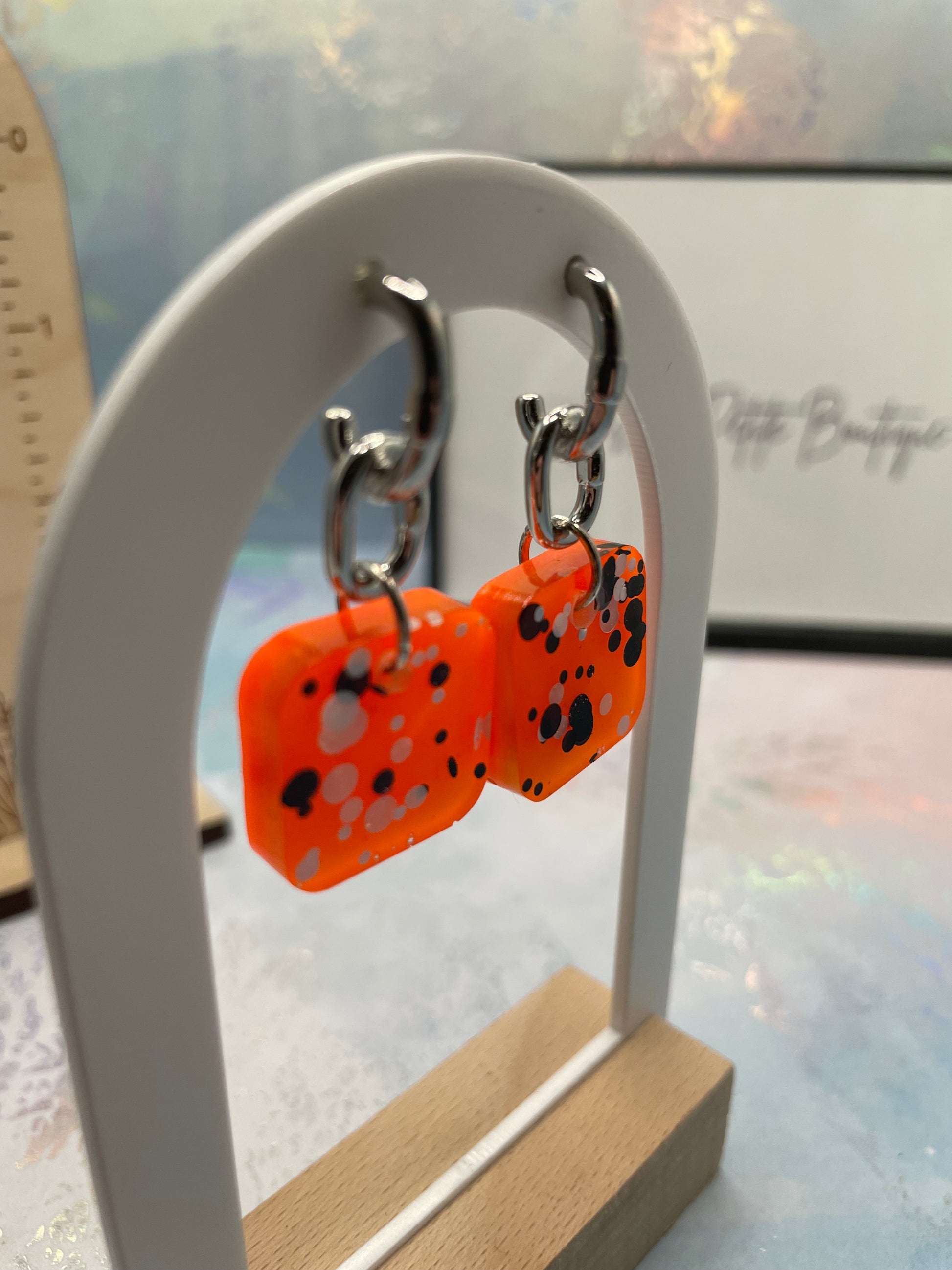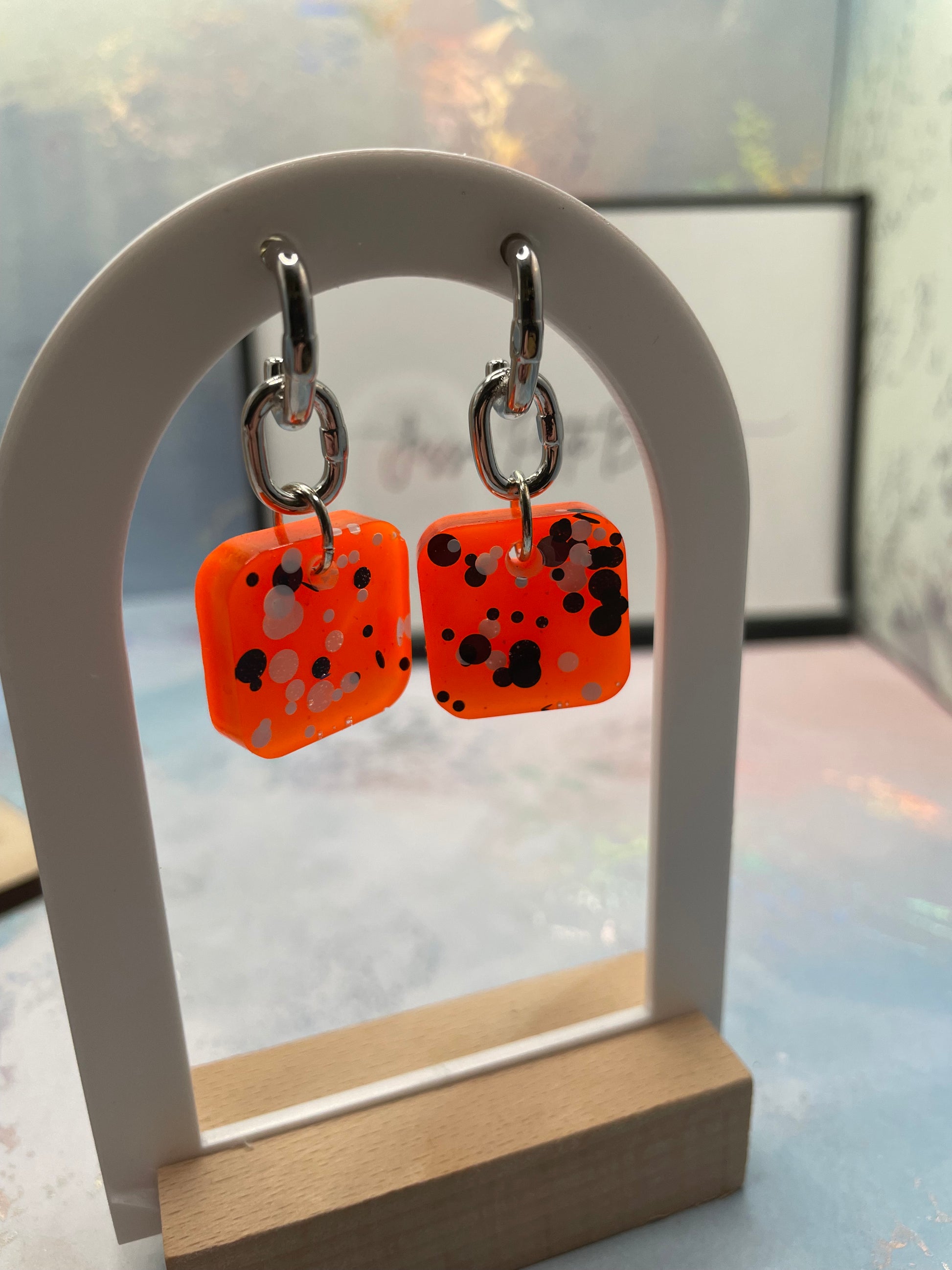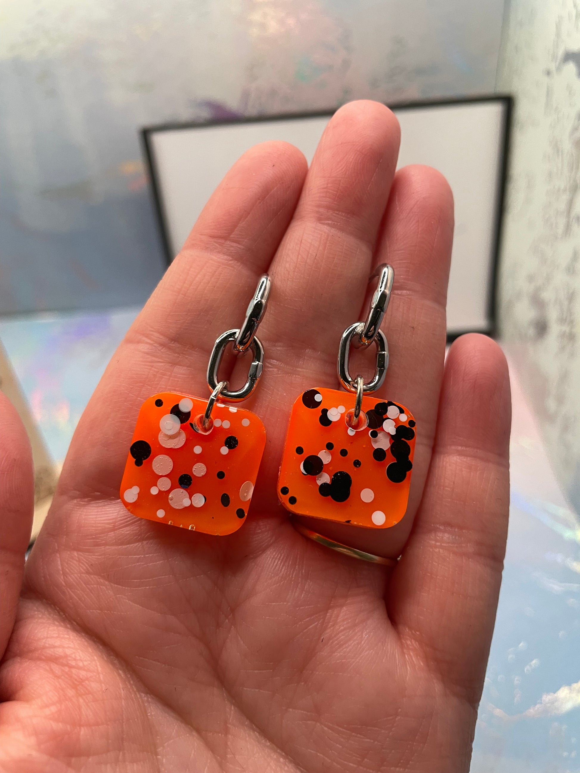 These bold and playful square earrings bring a fun pop of colour to any outfit. Made from durable resin, the bright orange base is adorned with white and black dots, creating a lively, eye-catching design. The stainless steel butterfly closure ensures comfort and security, while the modern, square-shaped drop adds a contemporary flair.