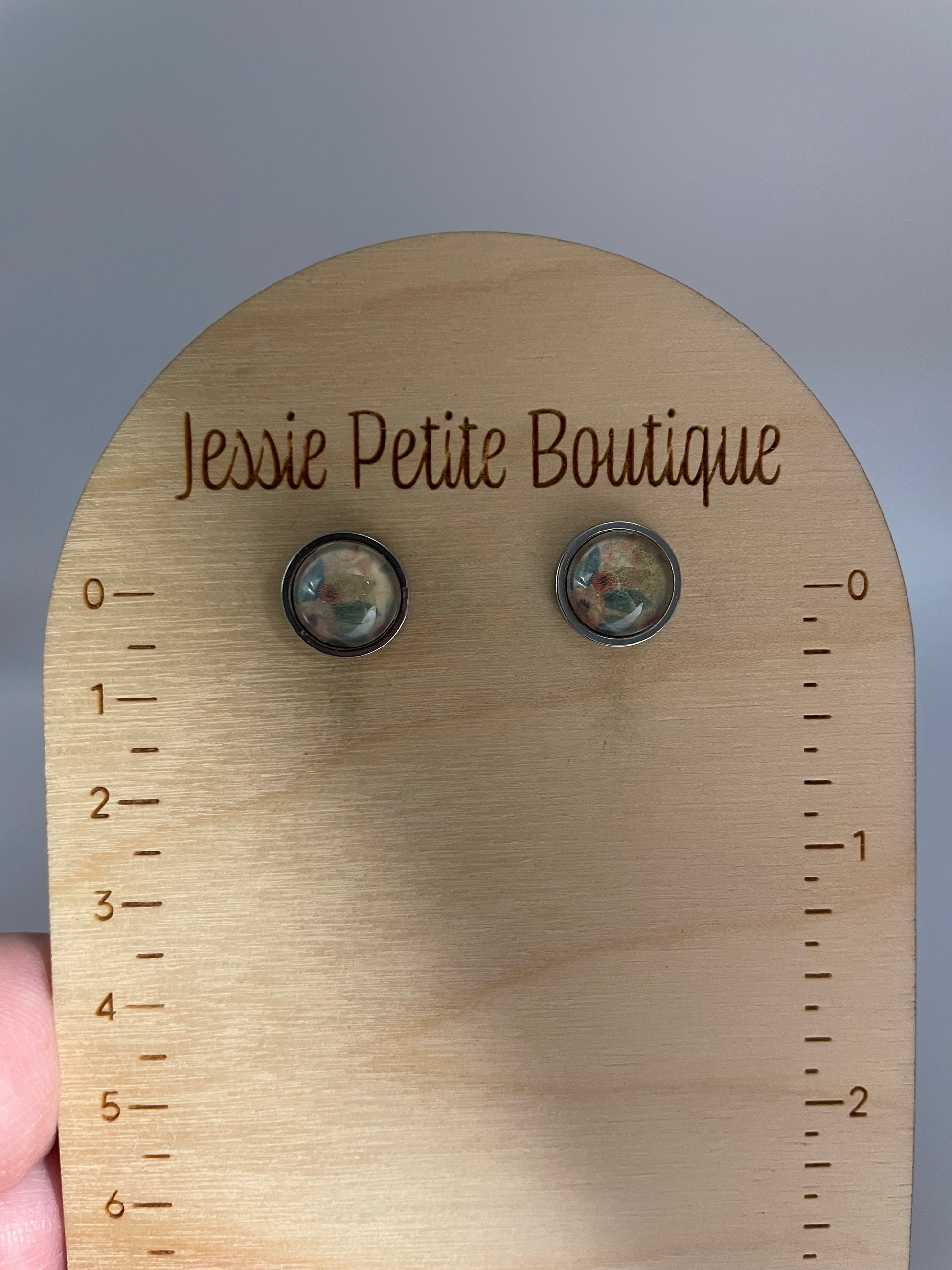 Vintage Floral Glass Cabochon Stud Earrings – Stainless Steel