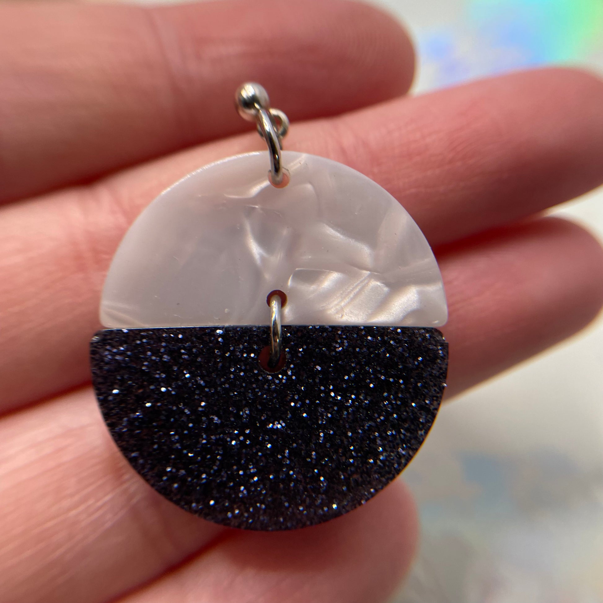Add a touch of modern elegance to your collection with these White Acetate and Sparkly Black Half Circle Earrings. Featuring a striking design of two half circles—one in glossy white acetate acrylic and the other in glittery black resin—these earrings are a perfect blend of contrast and sophistication. Finished with a silver butterfly stud closure, they’re comfortable for all-day wear.