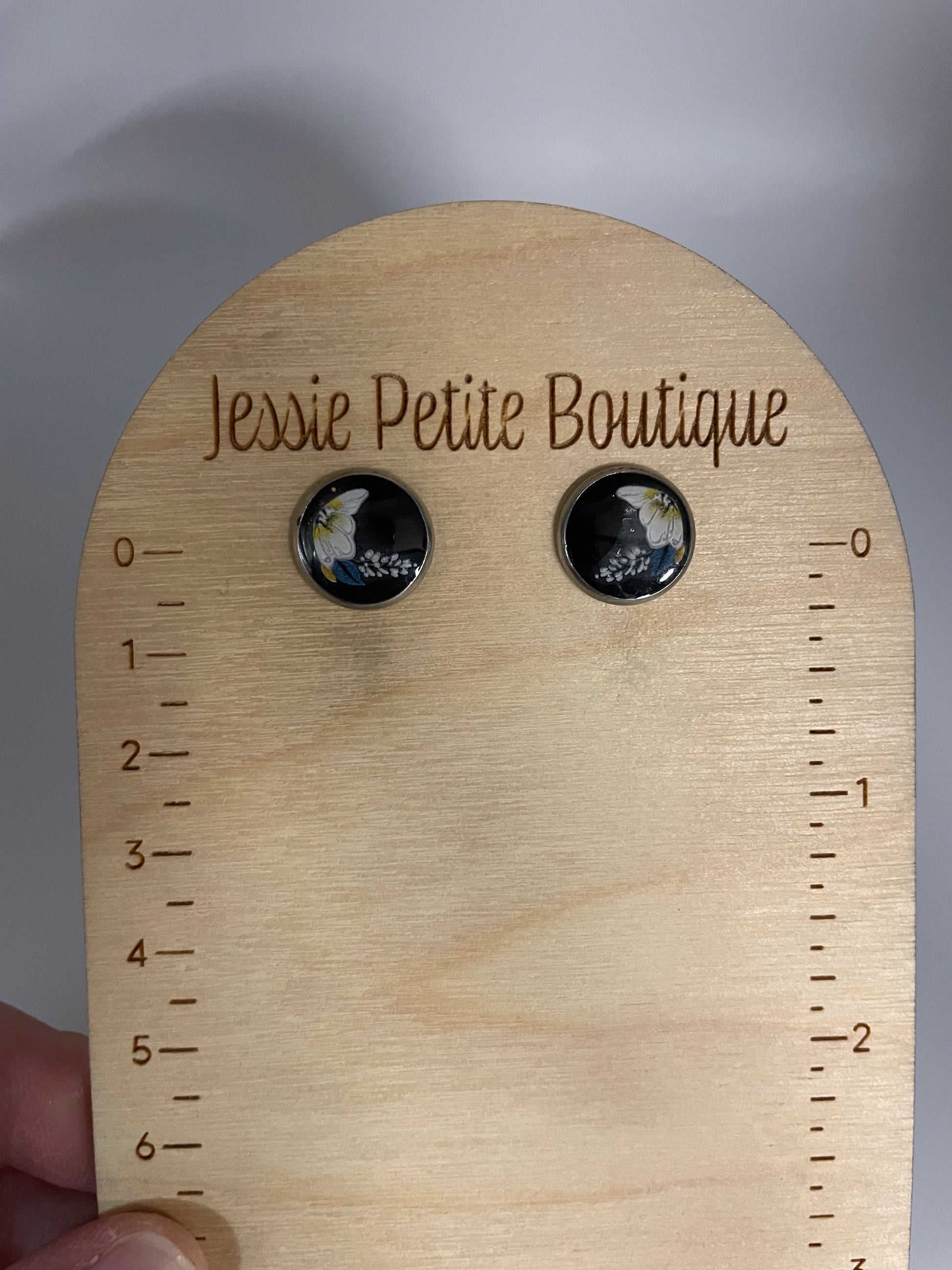 Elegant and refined, these stainless steel stud earrings feature a soft floral design in white, yellow, and blue against a deep black background. Handcrafted with resin, mica powder, and a delicate sticker finish, they add a graceful and modern touch to any outfit — perfect for casual days or special evenings.